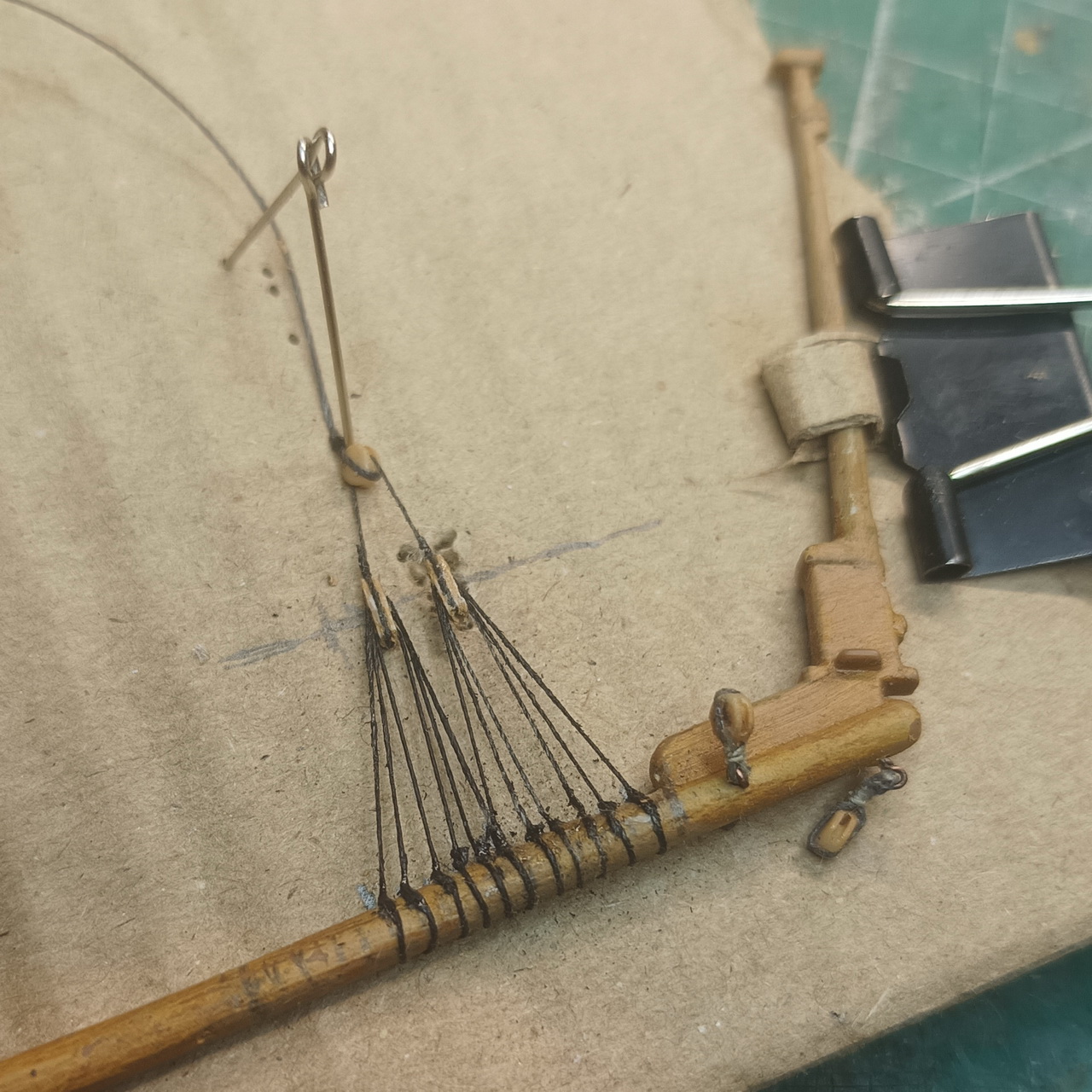 Решил устранить гибкость китового бушприта и блинда-стеньги при помощи швейных булавок.