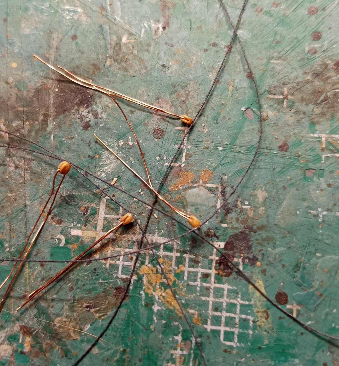 Пытался сделать оковки нижних юферсов из медной жилы 0,25 мм.