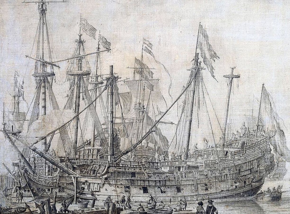 Но начинать надо со стоячего такелажа. Одним из стопроцентных интересных моментов будет тот факт, что в данный период штаги не имели мусингов. Огоны штагов были постоянные и не расплетались. И так было очень долго, до Васа и после Васа, так что практически на любой картинке с любым галеоном Вы это и без меня прекрасно увидите.