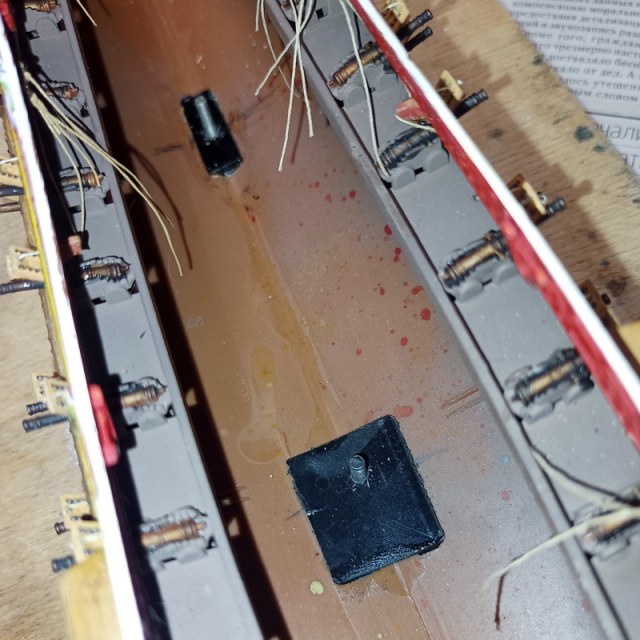 Для надежного крепления Васы к подставке вклеил в днище кусочки полистирола. Через них будут проходить винты М3. Нарежу в них резьбу и сверку приклею еще гайки М3.
