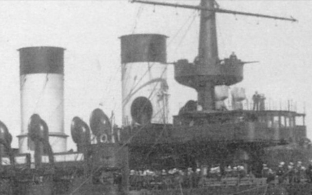 Vadim64 написал(а):На первой дымовой трубе была одна трубка отвода смятого пара сзади, но спереди находились традиционно гудок и сирена. Вопрос в том сколько к ним шло трубок с паром одна и она раздваивалась наверху, или сразу шли две параллельно. На кораблях РИФ встречались оба варианта. А как было именно на ЭБР Ослябя?