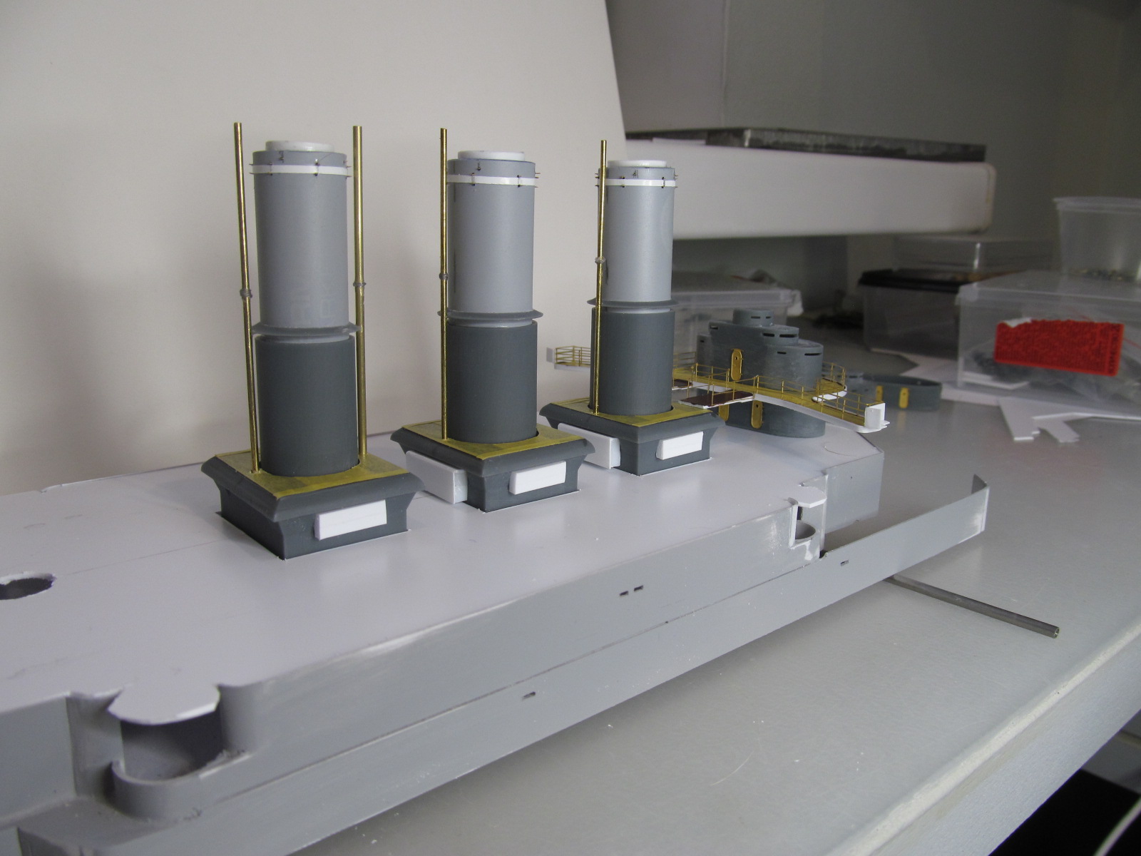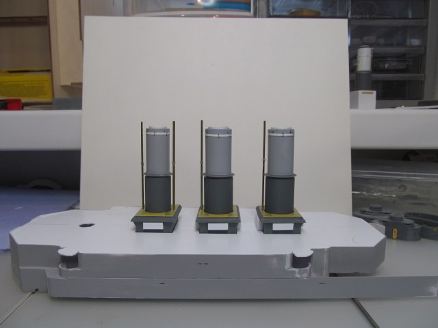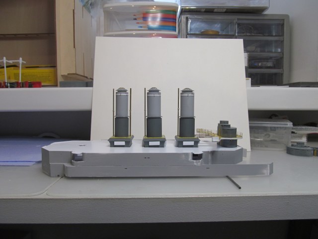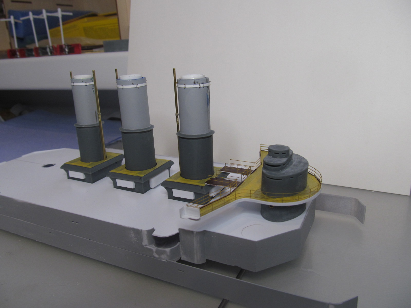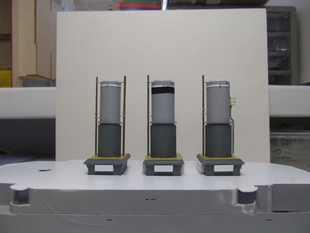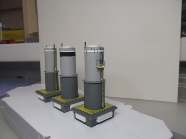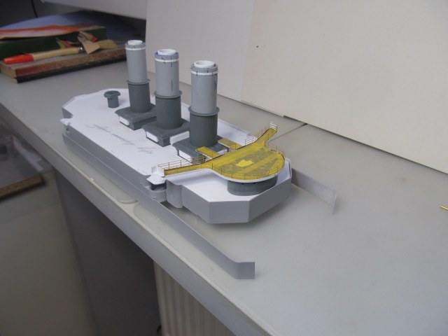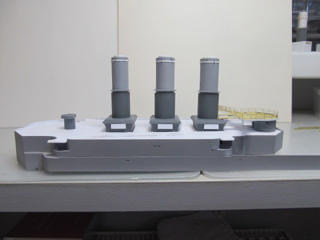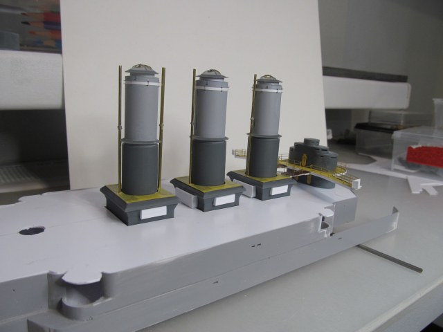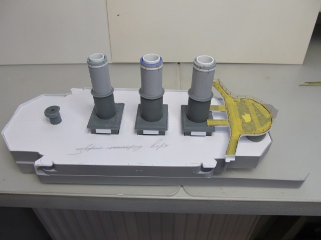 Беленькие "блямбочки" по бокам кожухов всех трёх труб я называю "ящики для флагов"...... на имеющихся фотографиях прототипа они именно для этого и используются, хотя на хрена на корабле нужно было столько флагов, я не понимаю. Скорее всего там хранили чего-то ещё не очень крупное.