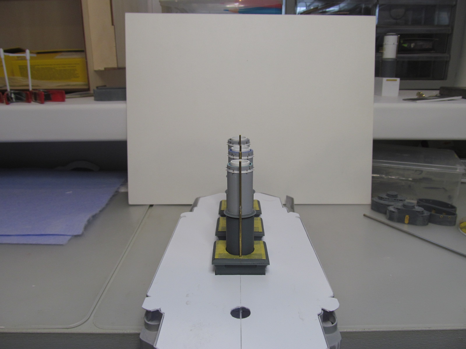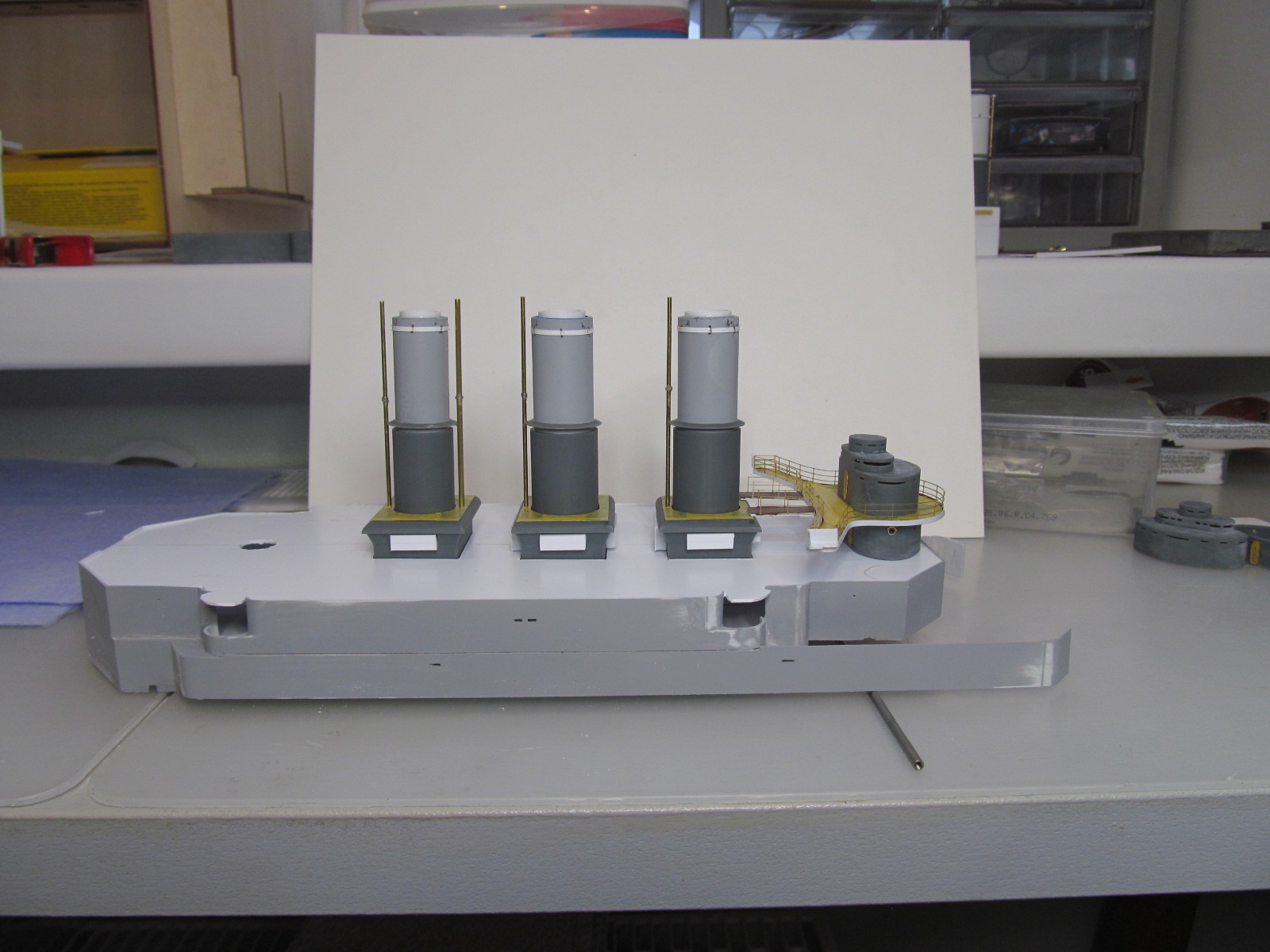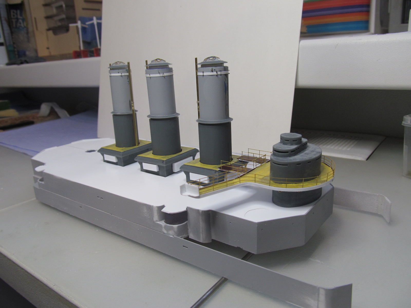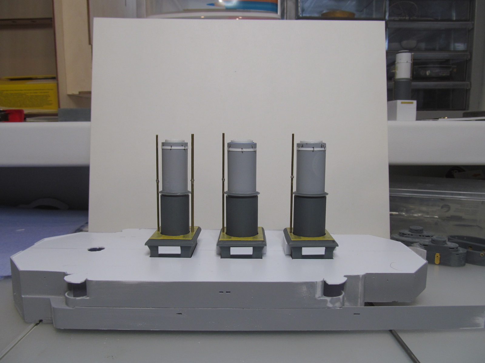 Беленькие "блямбочки" по бокам кожухов всех трёх труб я называю "ящики для флагов"...... на имеющихся фотографиях прототипа они именно для этого и используются, хотя на хрена на корабле нужно было столько флагов, я не понимаю. Скорее всего там хранили чего-то ещё не очень крупное.