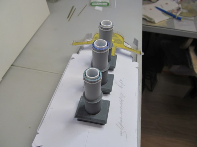 Осталось раскрепить трубки аварийного сброса пара и сделать разводку трубочек и трапа на первой трубе.
