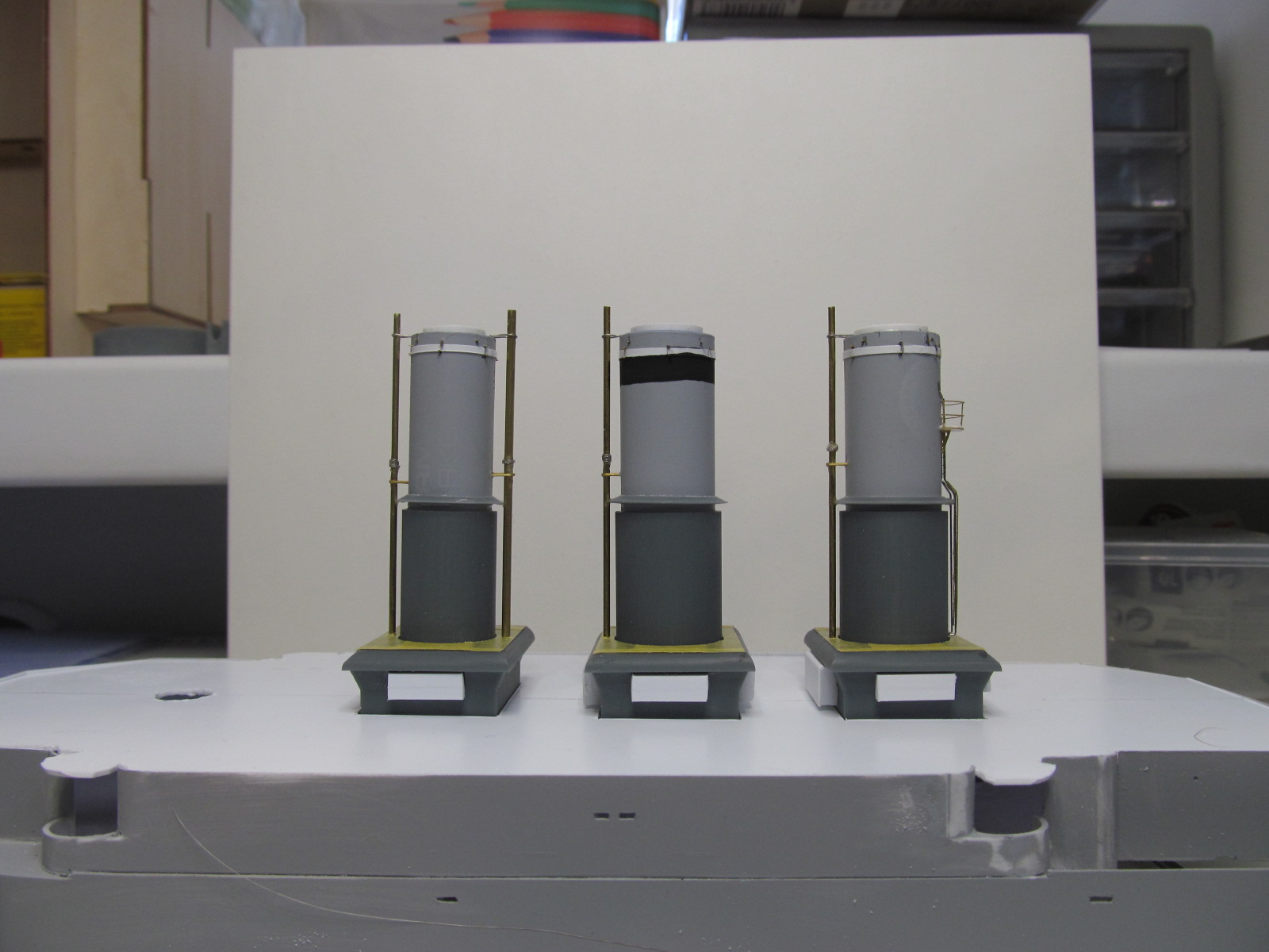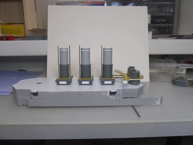 На задних стенках кожухов первой и второй дымовых труб будут ещё цистерны для котельной и питьевой воды (на момент фотосъёмки на штатных местах отсутствуют, но уже сделаны и вбиты в габариты).
