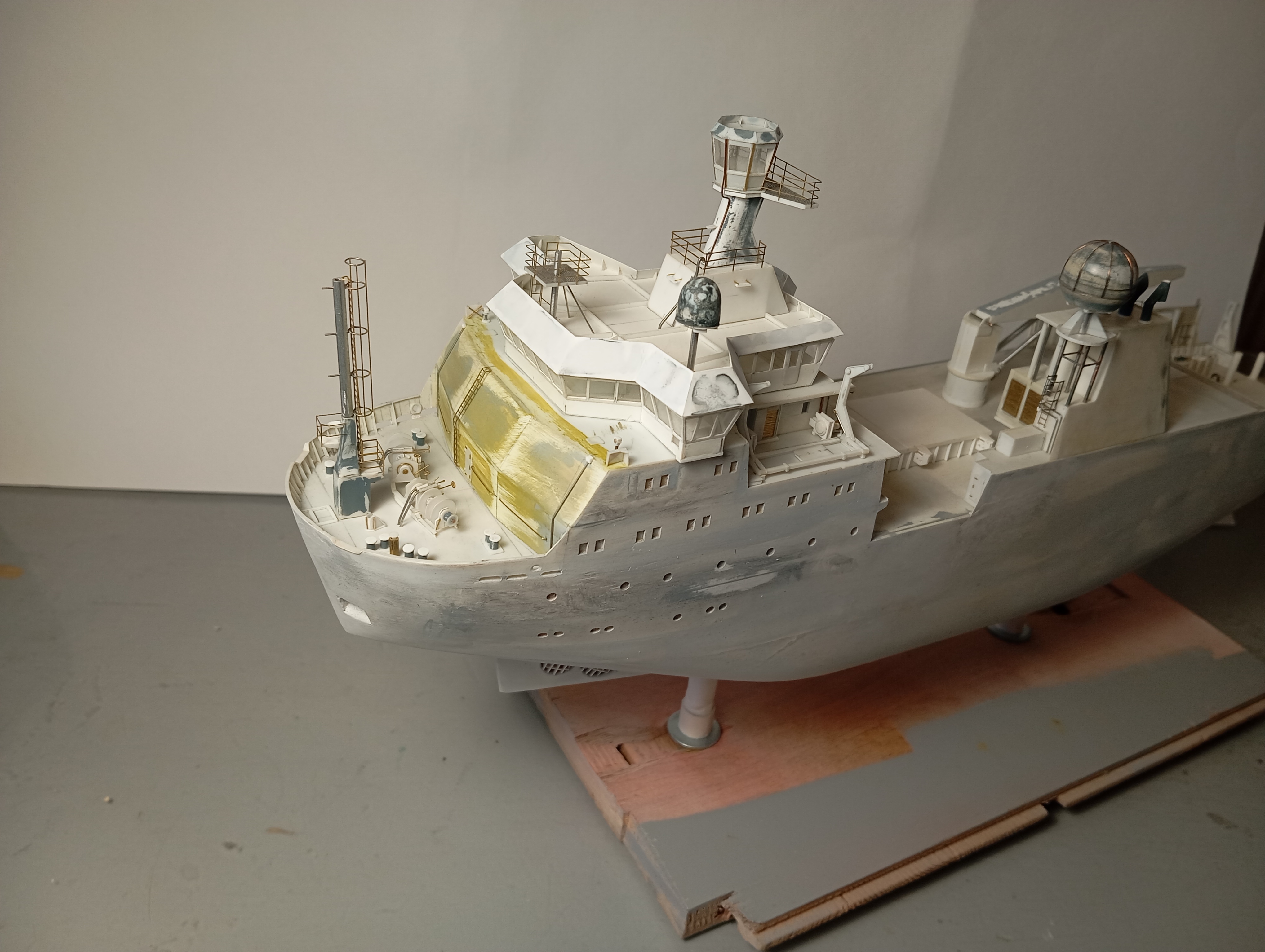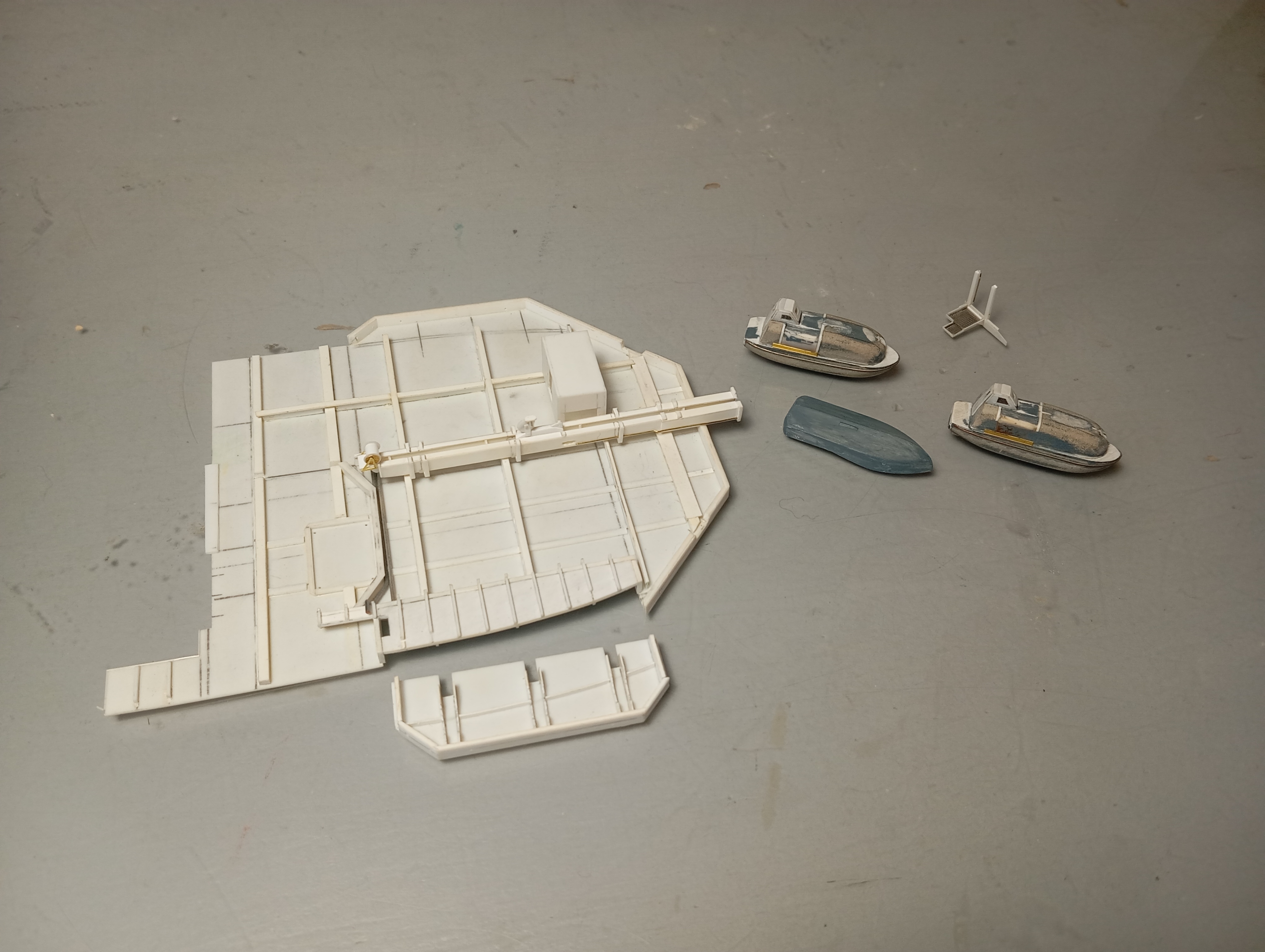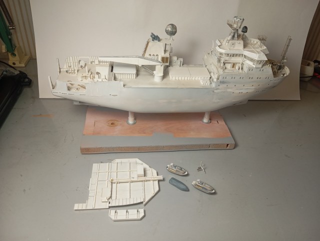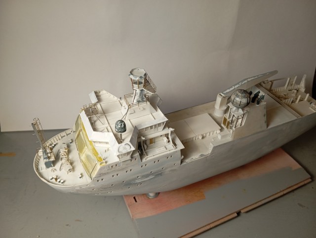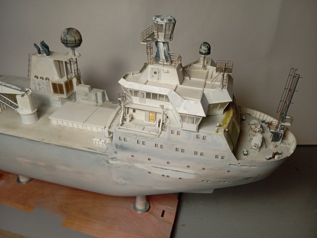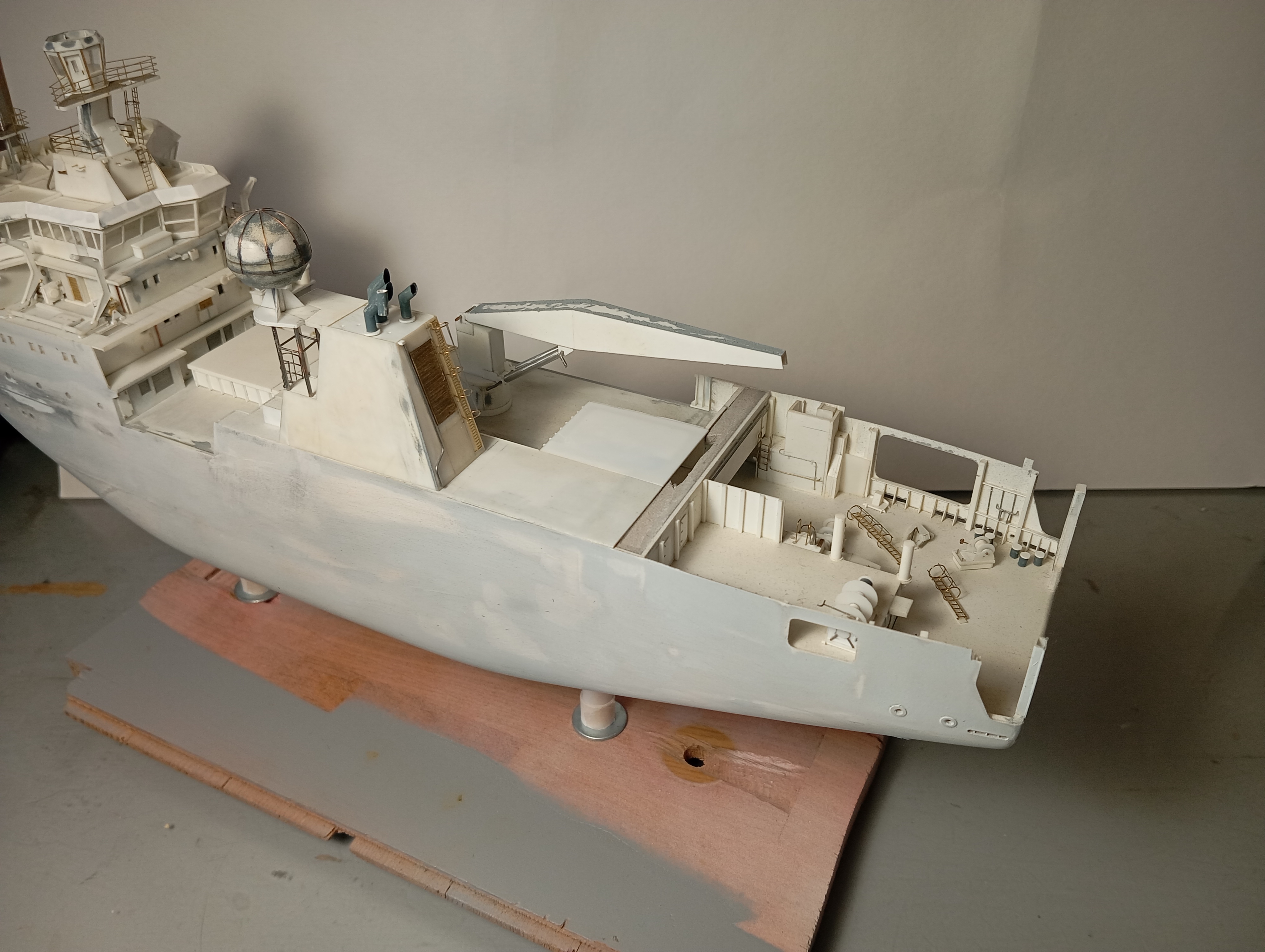 Оформил надстройку (за мостик еще не брался), сделал заготовки шлюпок и шлюпбалки, навесил деталировку на кожух трубы. Далее двигаюсь в корму по левому борту - на очереди дежурная шлюпка.