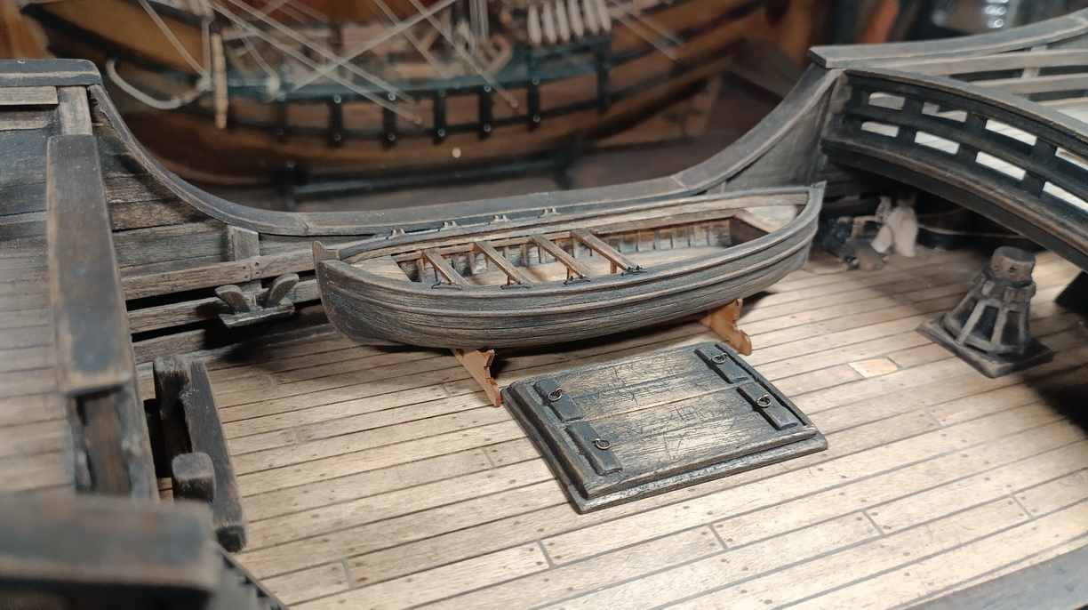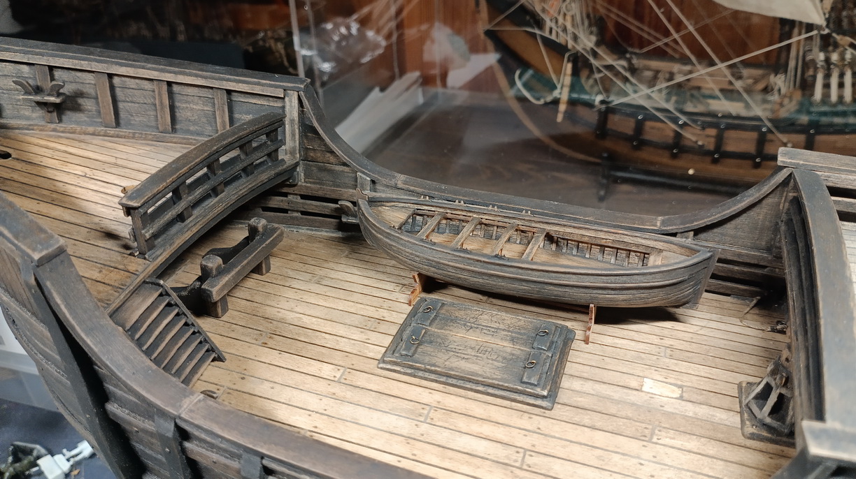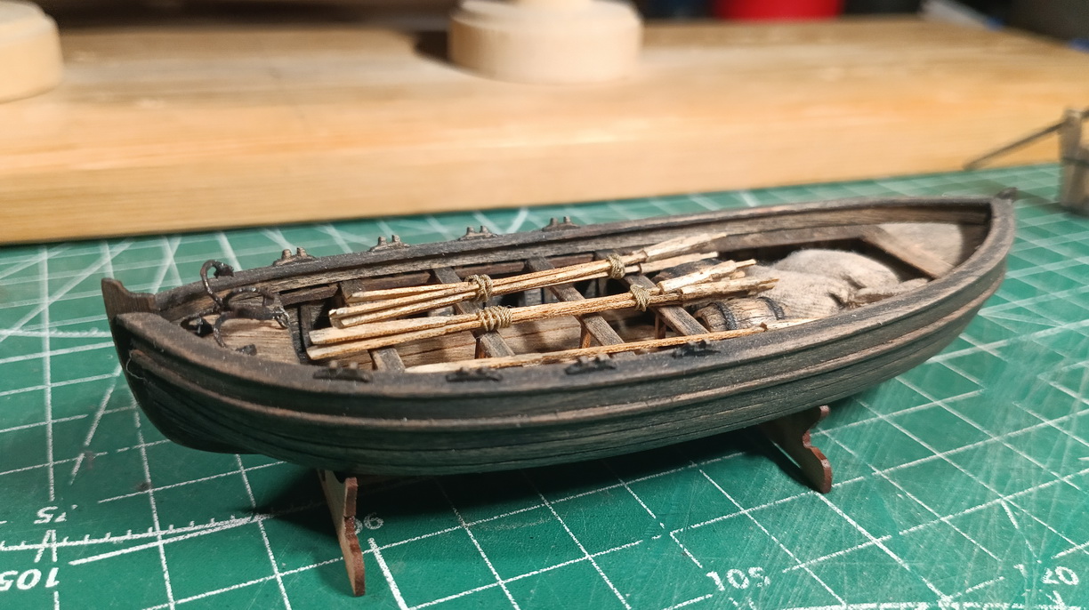 Сейчас на палубе ничего не закреплено, так как нет ясности с расстановкой битенга и кабестана. Впоследствии в лодку конечно накидаю всякого - якорь, весла, боченки, веревок наверное пару бухт.