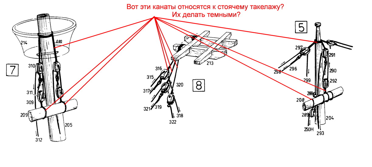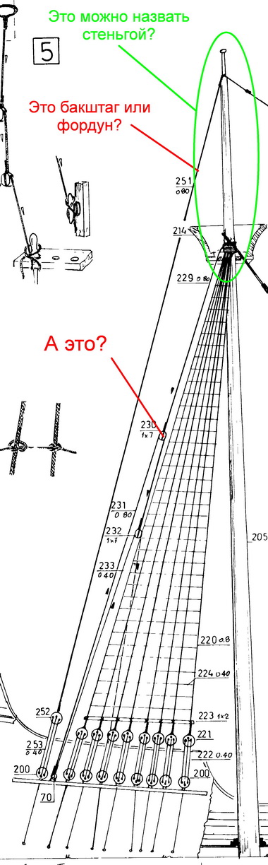 "А это?" - а вот элемент 229 существовать в таком виде не должен, ведь он просто выполняет роль соседней ванты. Автор рисунка ошибся, ему элемент 229 надо было или исключить вовсе, или, раз ему так неймётся, завести шкентель 229 на топ мачты, туда же, откуда идёт 251, и спустить на середину русленей, тогда это был бы полноценный бакштаг. А так - нарисованный элемент 229 - абсолютно бесполезная глупость.