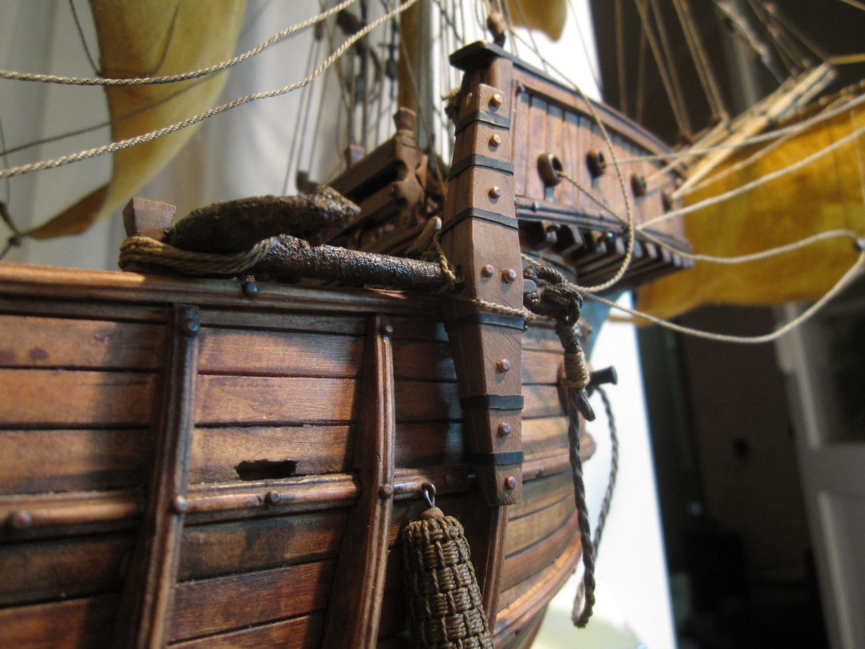 я б настоятельно рекоммендовал бы срочно поменять схему такелажа на адекватную ... такелаж то можно легко разоружить и сделать по уму, хотя бы просто поставить так, как нарисовал Бьерн Ландстрем, Мондфельд со товарищи... там хоть всё характерные для 15го века особенности подчеркнуты...