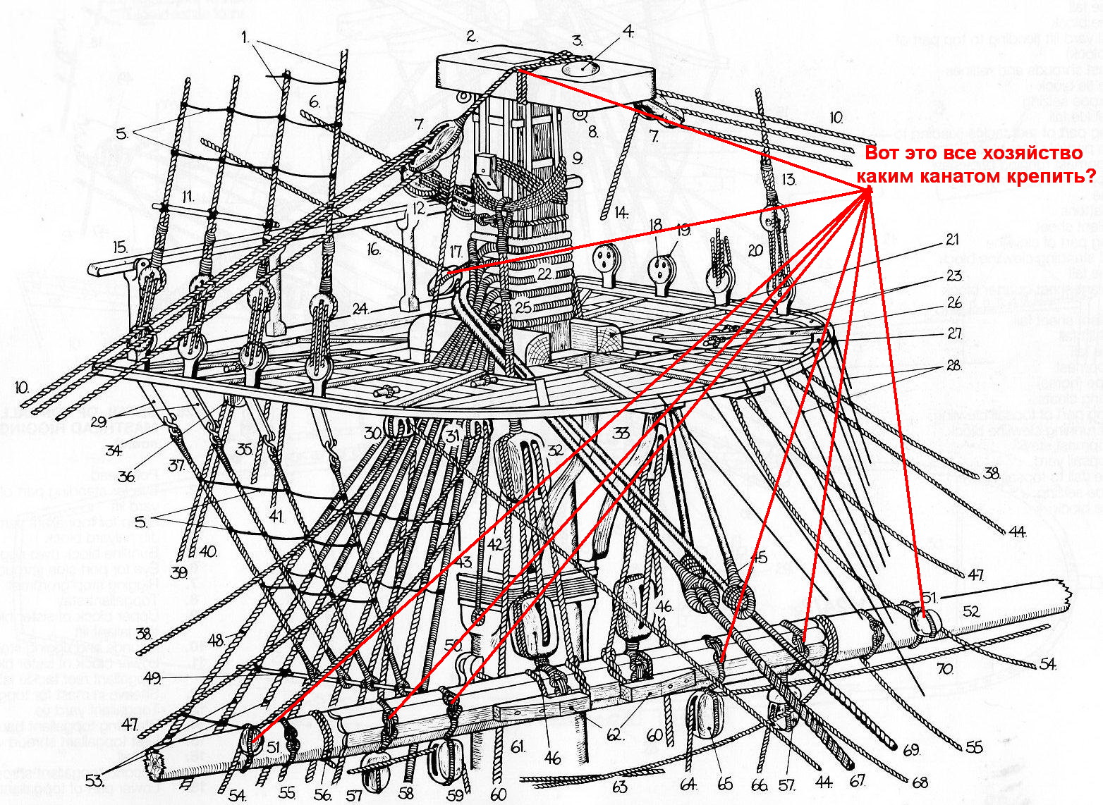 Ну хорошо, пришло время уток. Так как тогда кофель-нагельных планок еще не было, придется крепить все снасти на утки. А что делать, наши предки были суровые мужики!