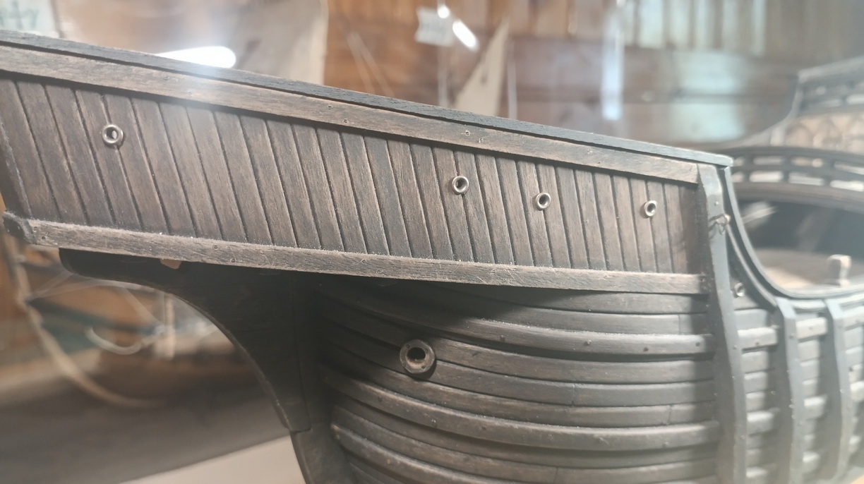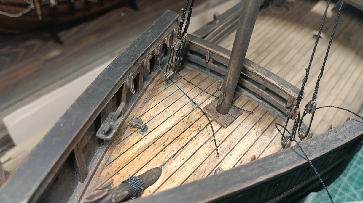 Добавлять ванты на фоке уже некуда. Обухи намертво вклеены в палубу. Выбленки и не собирался делать, а вот веревочную лестницу да, планирую делать. Правда пока с трудом представляю как. Но только на гроте, зачем она на фоке? Там же площадки нет.