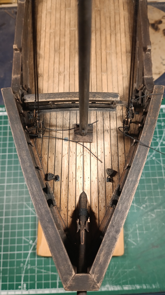 Также, как вы могли заметить, я установил бушприт и фок-мачту. Установлены юферсы и первично протянуты ванты фока.