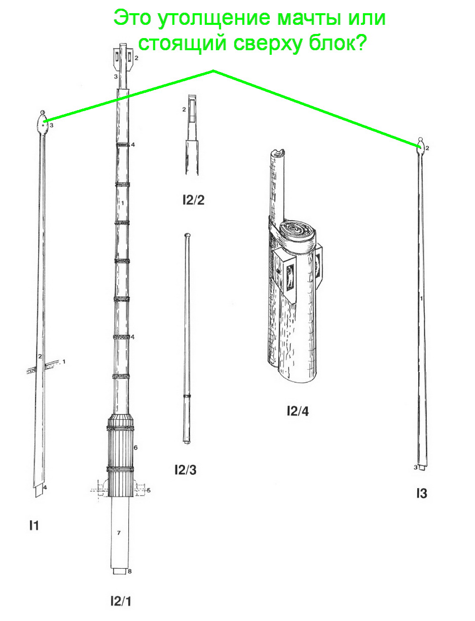 2-а. к сожалению, в сообщении 227 первая картинка - более поздняя и корабль там на порядок крупнее, вторая картинка - новодел, третья картинка показана просто как пример заводки талрепов, сами тали к рассматриваемому прототипу вообще не в тему.