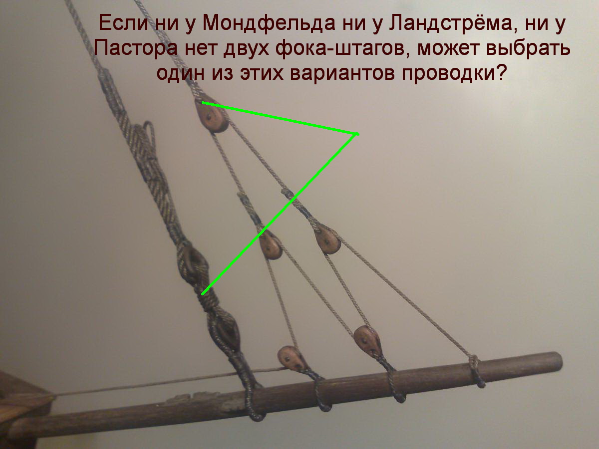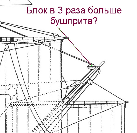 А вот дальше небольшой ступор. На этих схемах фока-штаг идет через блок на бушприте и уходит куда-то на борт. Такое физически может быть?