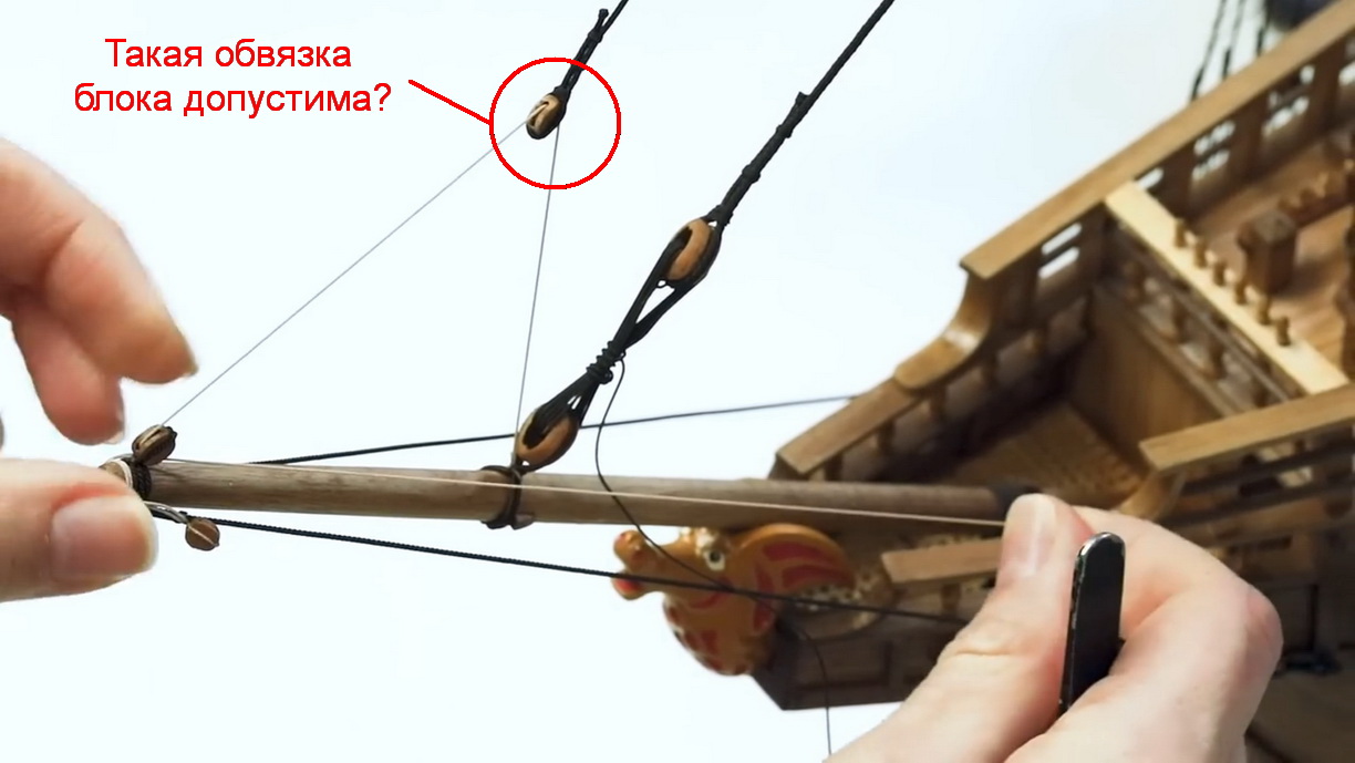 Что бы что то однозначно утверждать... но форма блоков и способ обвязки - есть конкретика - см. нао Матаро, блоки Мэри Роуз пусть не совсем точно но очень близко...в книжках Ландстрема есть материал про старинный такелаж.... вариант в последнем посте про обвязку круглого блока, мне кажется не совсем в тему...надо ориентироваться на Матаро и МР хотя бы, ну и что там ещё близко к теме...