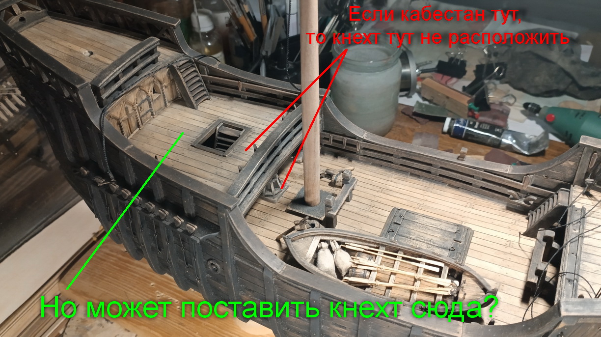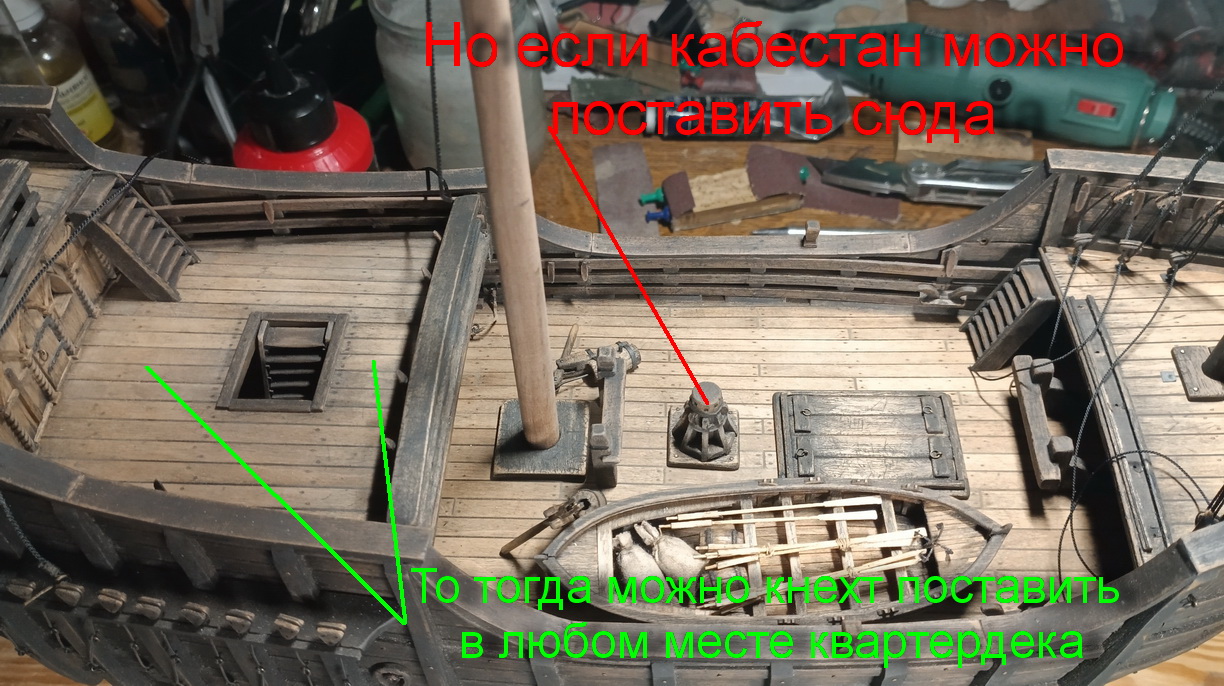 Либо можно поставить кабестан не за гротом, а перед. Тогда вообще ставь кнехт где угодно на квартердеке.