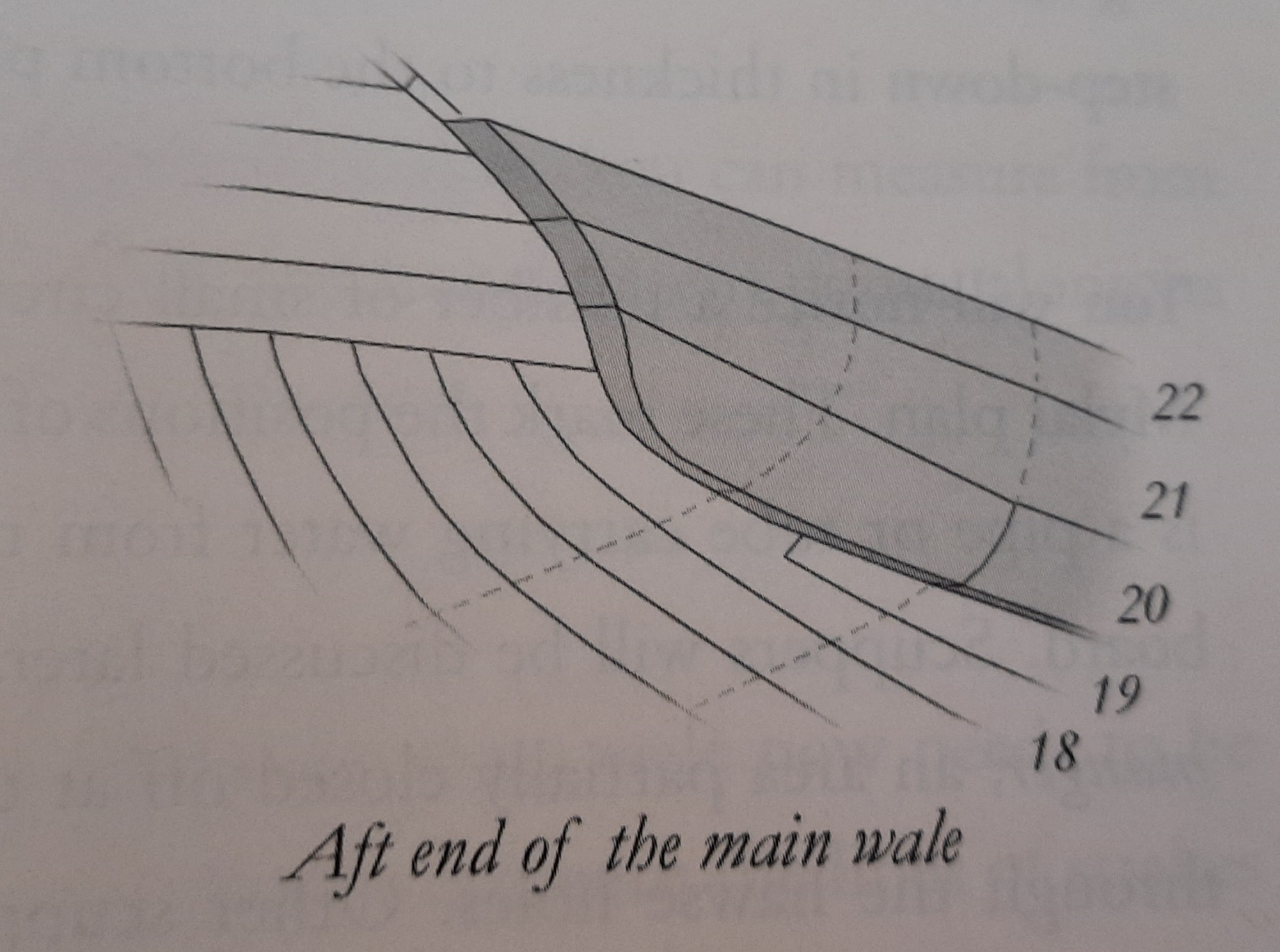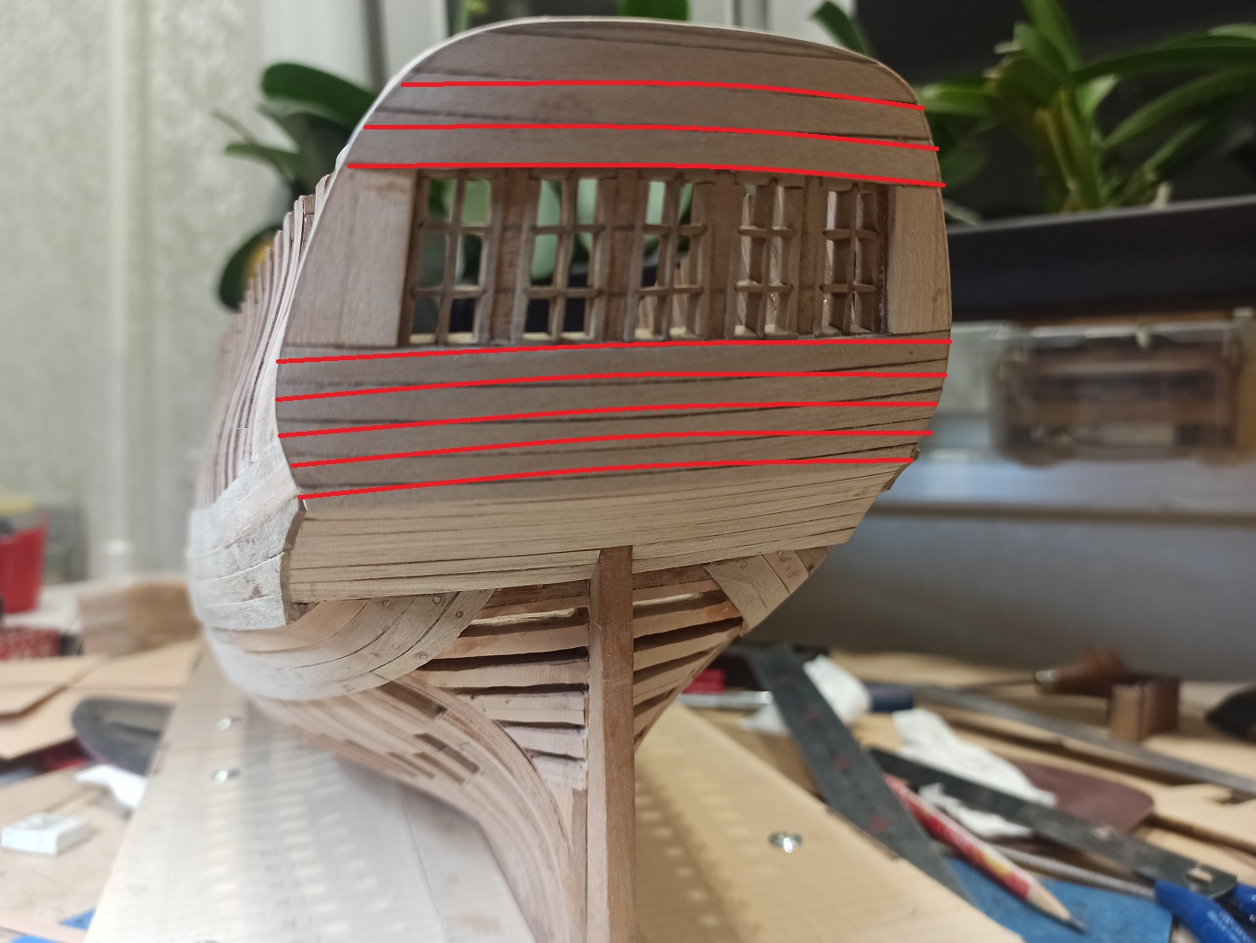Совершенно верно. Этому есть техническая причина: нижний подзор, косяки окон и гакаборт определяют важные силовые элементы конструкции, называемые транцы, в частности, дек-транец, являющийся одновременно последним бимсом палубы, изогнут по погиби палубы. Контр-тимберсы подстраивали под транцы. Ка ни крути, а даже теоретически обшить пространство, искривлённое в трех плоскостях, прямыми досками невозможно. Обшивку же гнули по форме силовых элементов не только для ликвидации неизбежных "щепок" и "потеряев" - очевидной причины, но и для сохранения прочности конструкции. Да и не было сложностью изогнуть и подогнать доски. Наоборот, я бы так сказал: как раз "прямые" доски подогнать на настоящем корабле было бы как раз ещё той задачкой! (модель-то всё стерпит, да только на настоящем корабле это не работает). Благо, уж что-что, а работать с фасонными формами, изгибами досок корабельные мастера тех лет умели на отлично!