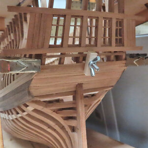 Корма, корма... Беда с ней. Гнутые рейки по вашим рекомендациям положил, а они опять как прямые выглядят, из-за наклона и радиуса (выпуклости) гакаборта. Это вторая попытка. Пока пытаться больше не буду. Может реечками оформительными, накладными немного изгиба правильного добавлю.