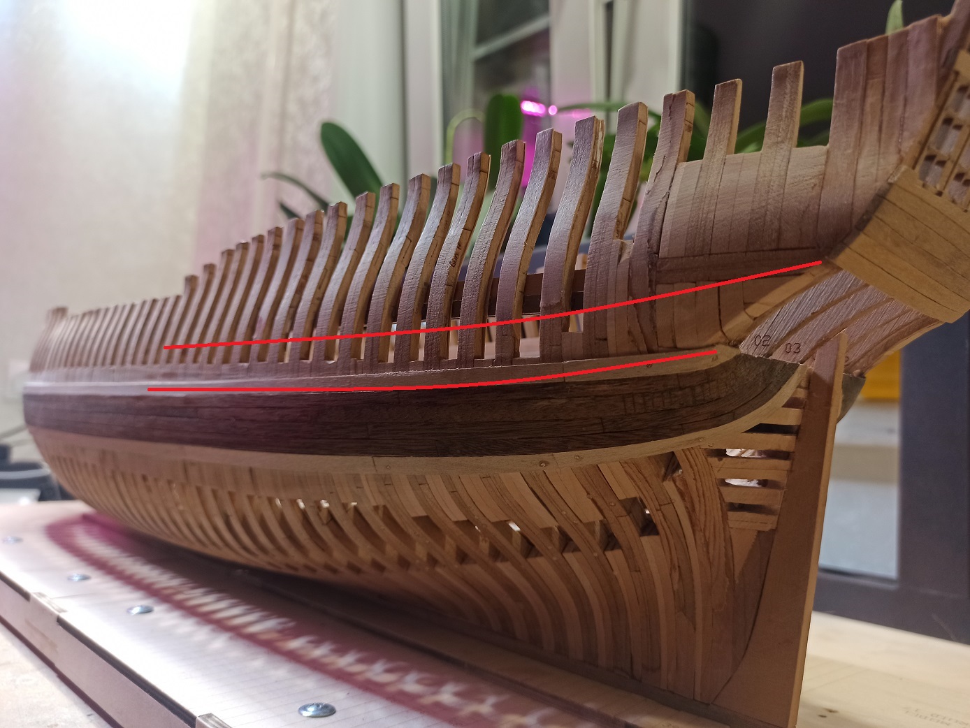Старался сделать бархоут по линии палубы орлоп дека как в " букварях" советуют. Ну и тянул эту рейку (бархоут) так как мне палуба направление покажет. А ннннет, оказывается, не так!!!! ЕЁ ближе к носу и корме задирать к верху оказывается надо! На тот чертёж, что у вас, я и не взглянул