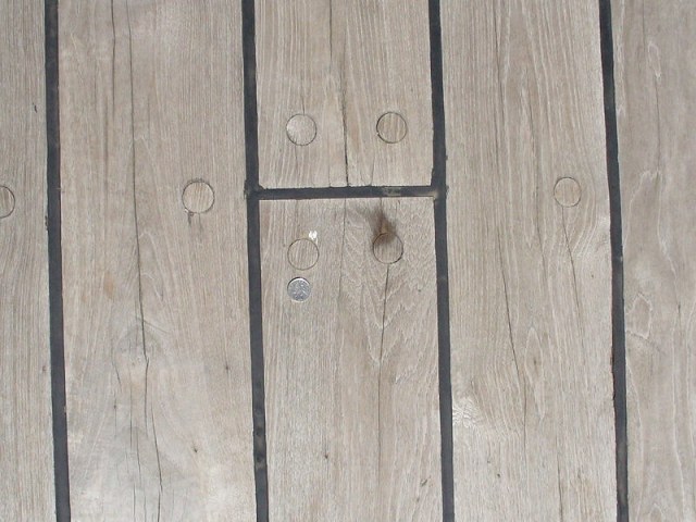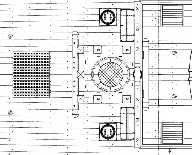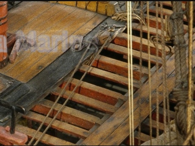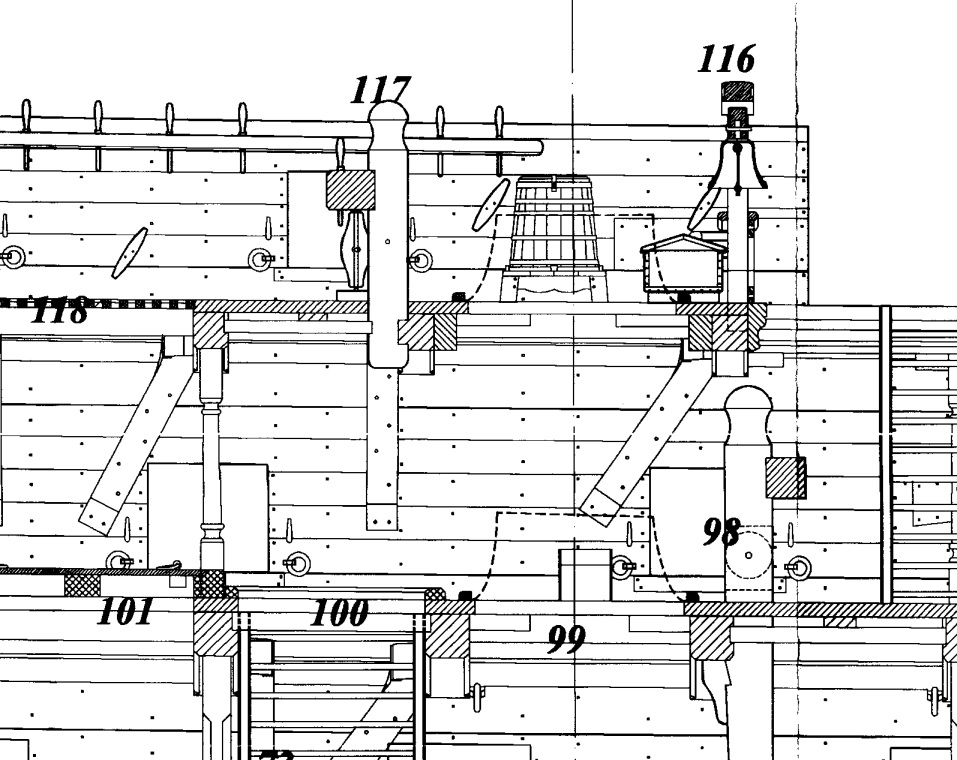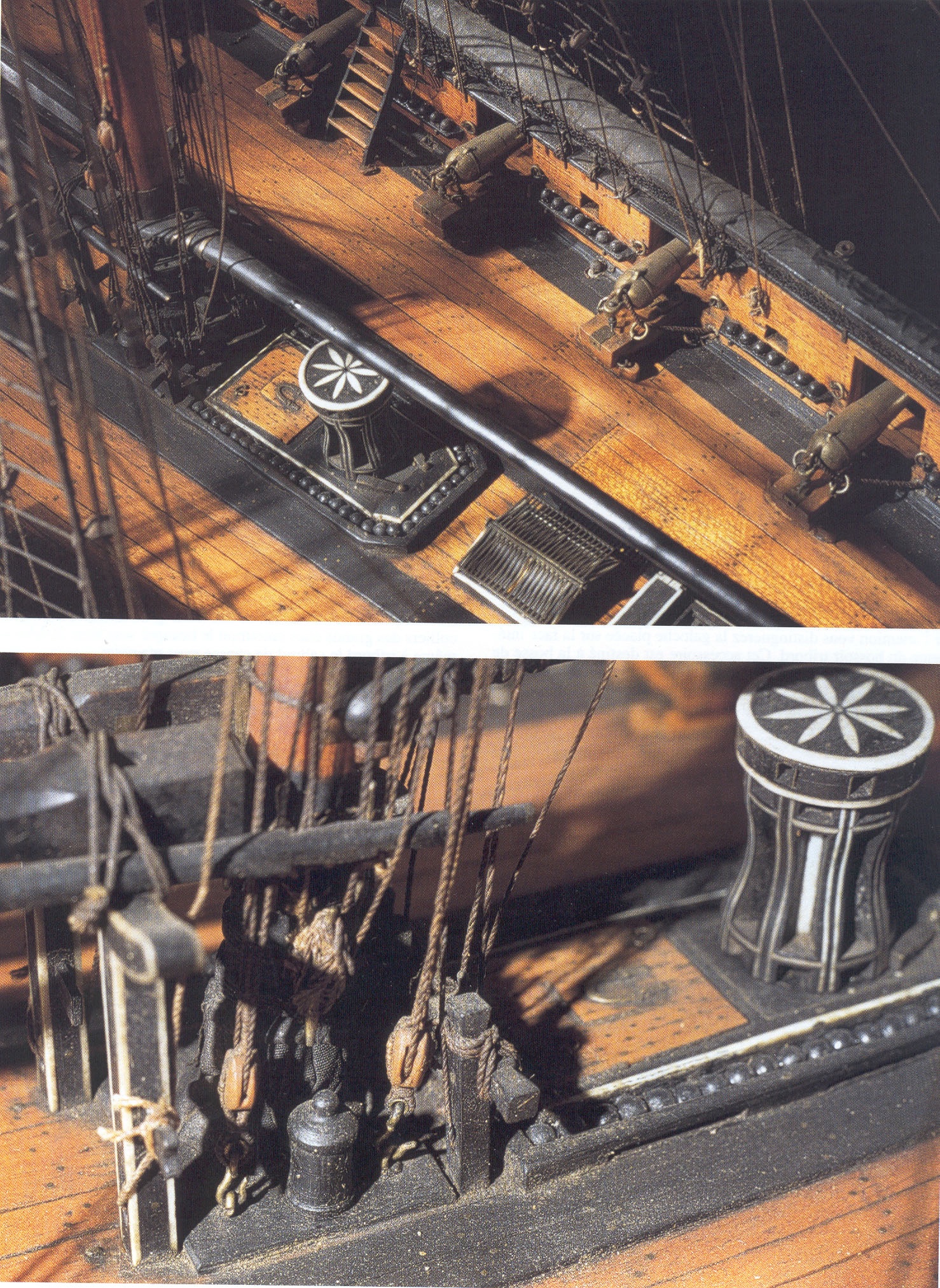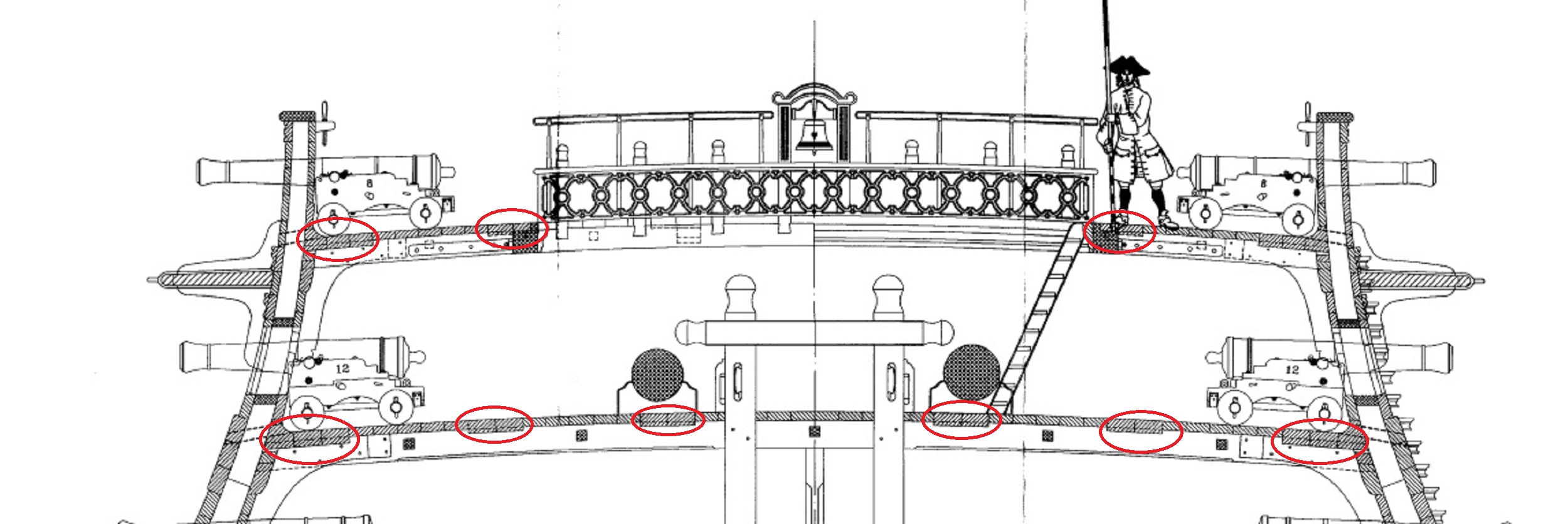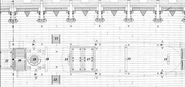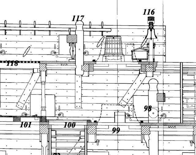 Единственное, останется загадкой конструкция новых мостиков шкафута под добавленные орудия. Я думаю, что мостики были не "старые, к которым добавили ширины", а, что мне видится логичным, настелены заново, скорее, на новые бимсы, а-ля "скид-бимсы", как сейчас такие установлены на шкафуте на корабле-музее "Виктори". Но нарубные поясья, идущие одними линиями через форкастль, края старых мостиков шкафута и продолжались на квартердеке (иногда совпадая в одну линию, иногда, как на фото ниже, нет), они остались на старых местах.