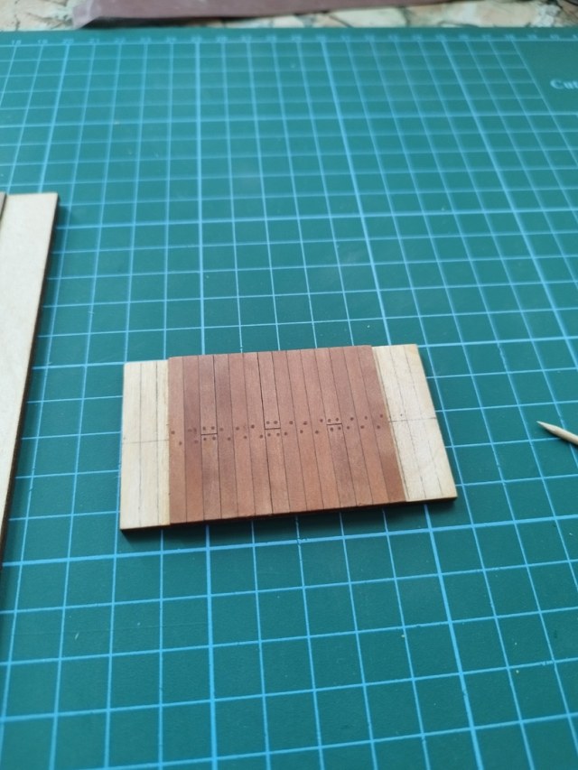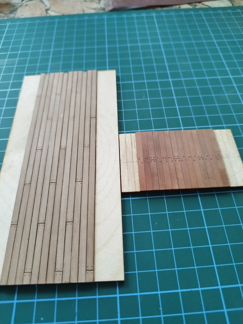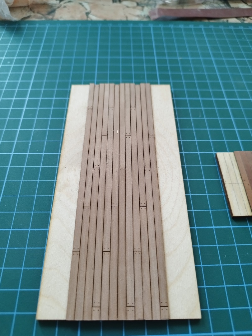 Ещё не поздно поверх лазерной палубы наклеить планки, показывая правильное расположение поперечных стыков досок. Судя по фотографиям в сообщ. 34, у Вас это отлично получается.