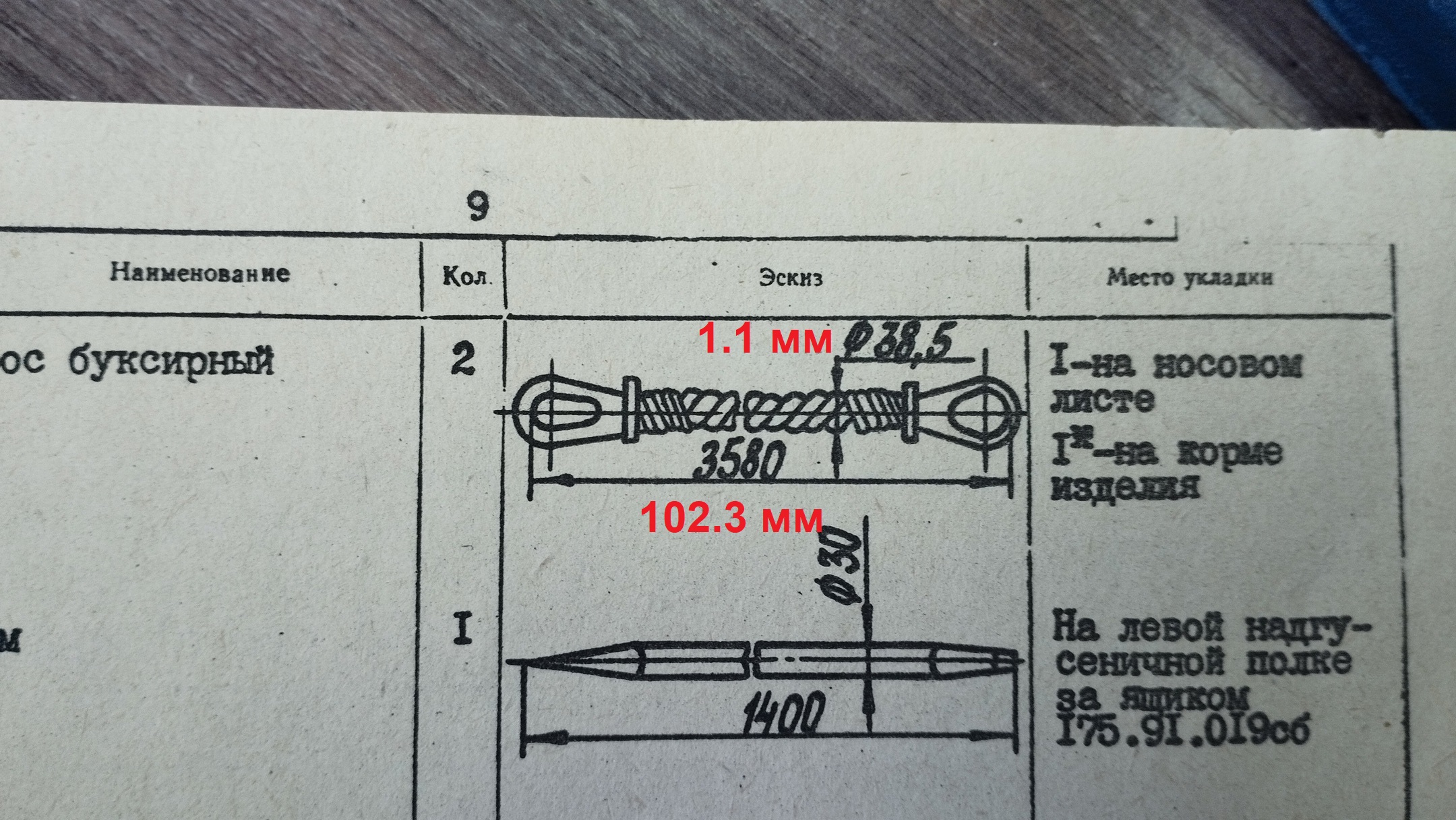Танковый буксирный трос имеет следующие размеры: 3850 мм длинны и 38,5 мм диаметр.