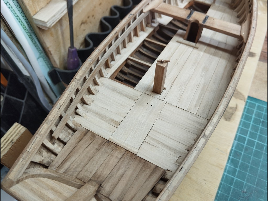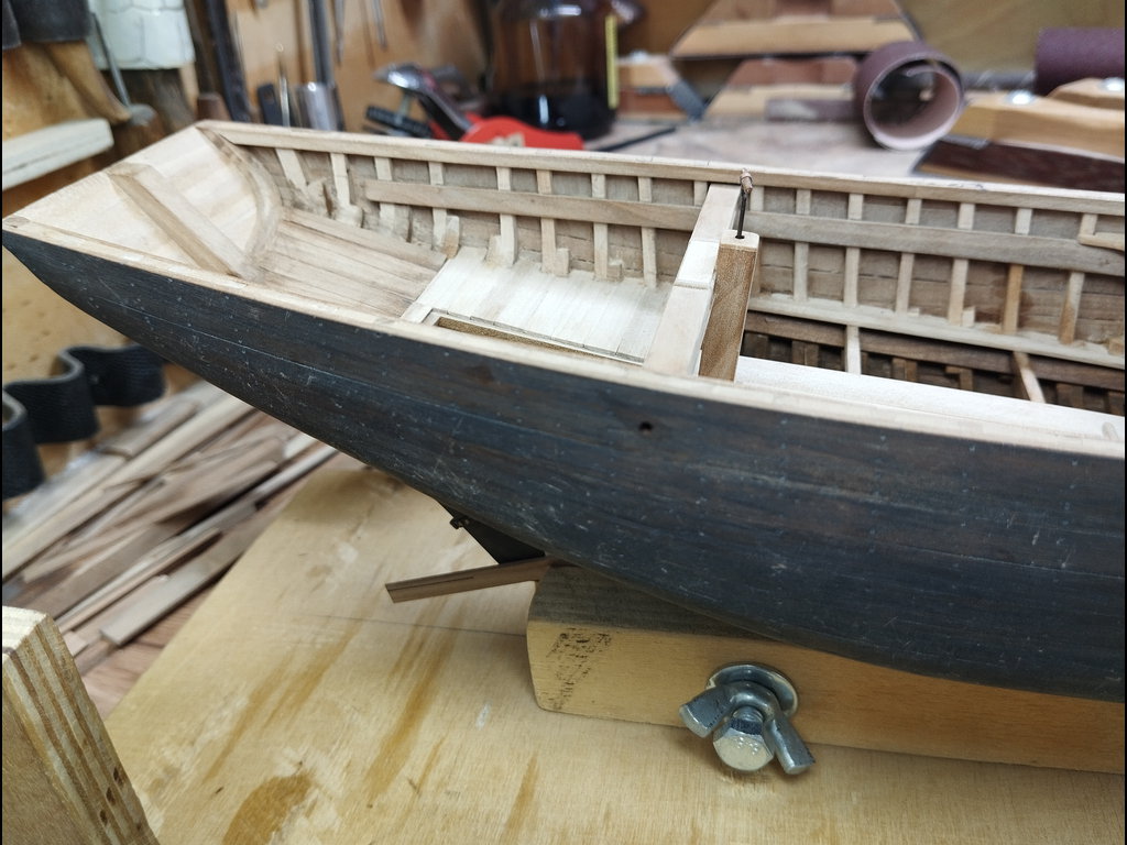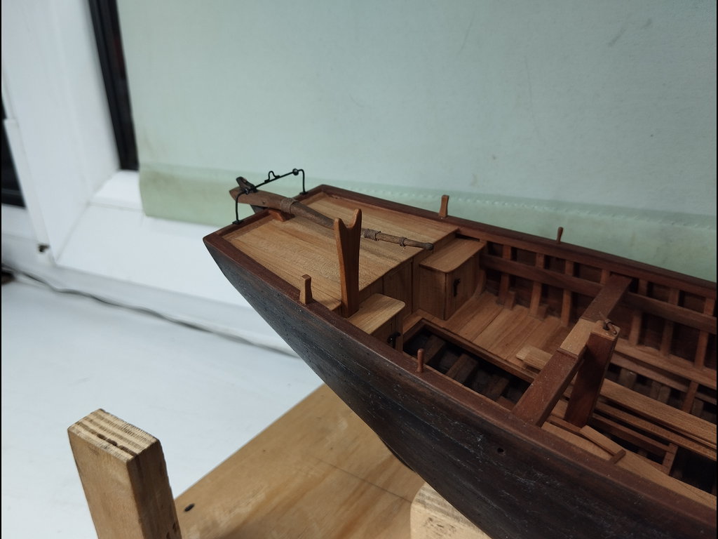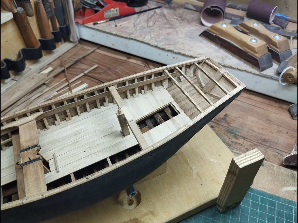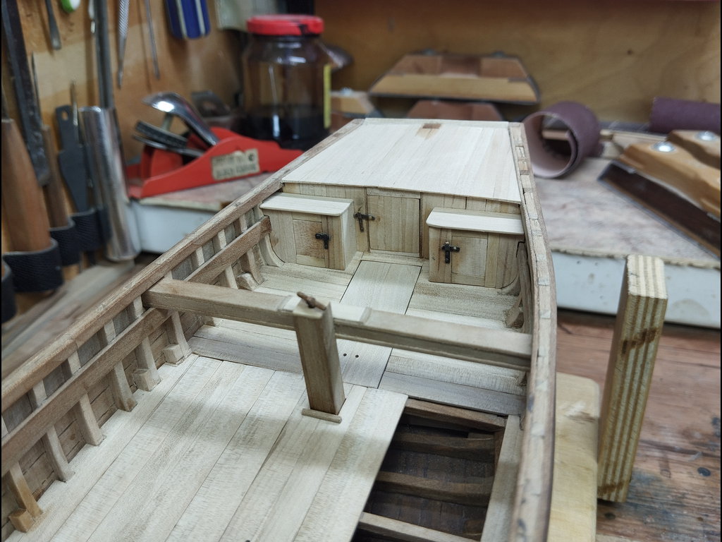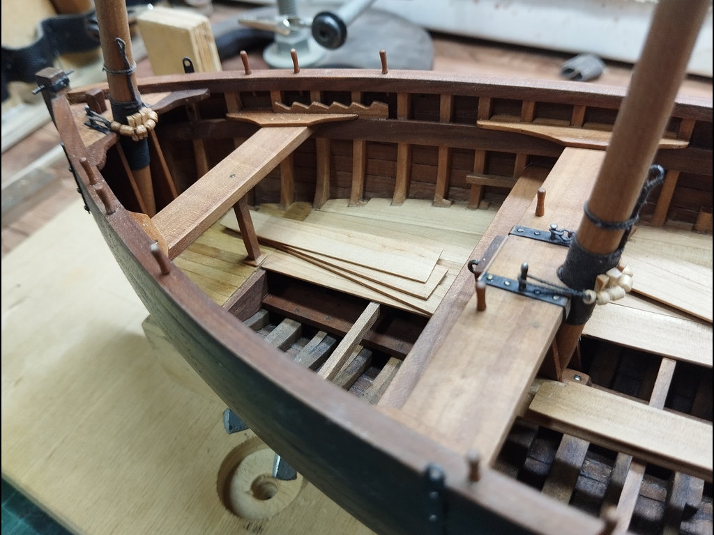 Двигаюсь от носа к корме. Делаю настил палубы. В средней части он был сьемным, так как там перевозили сети и улов..... Также изготавливаю и устанавливаю другие элементы этой части корпуса....