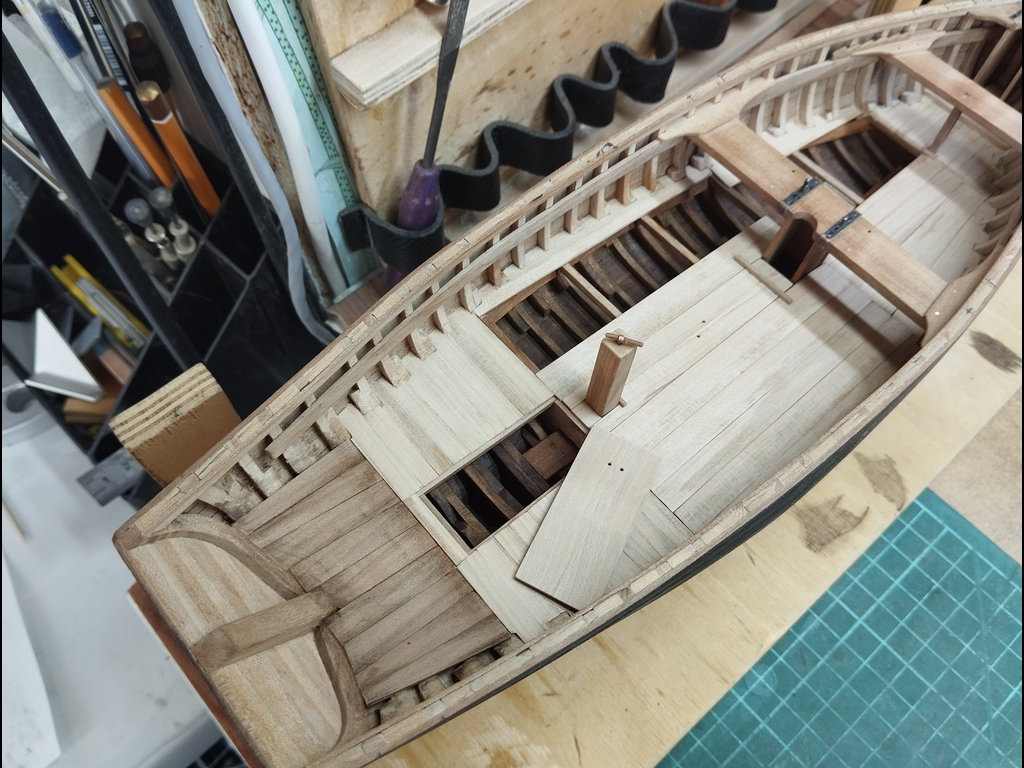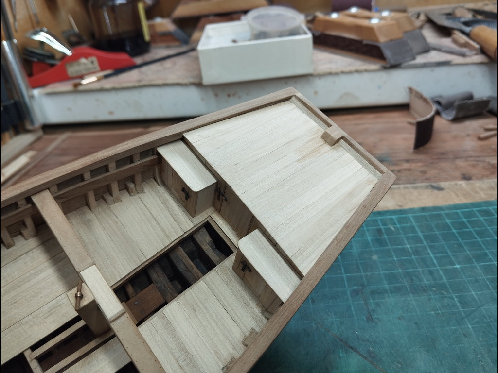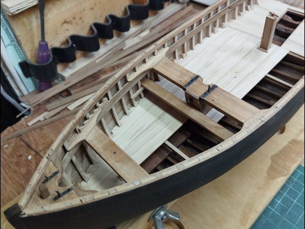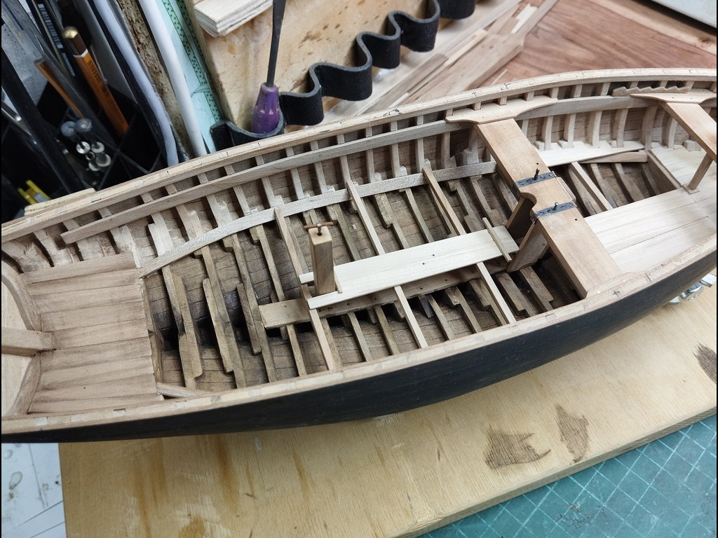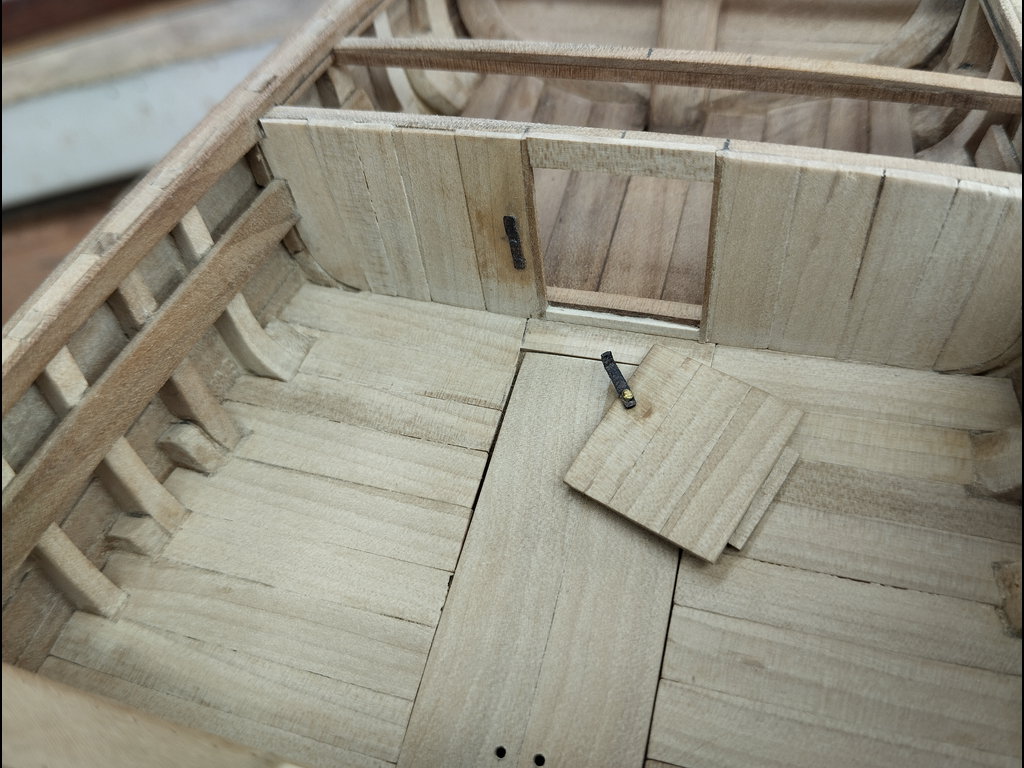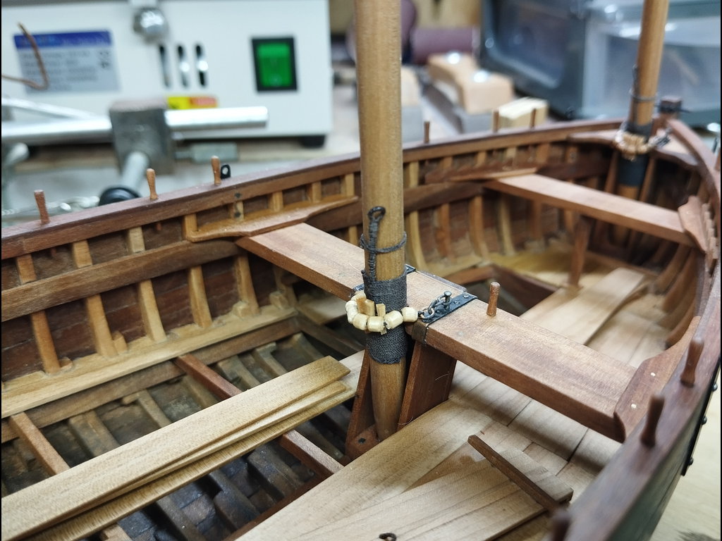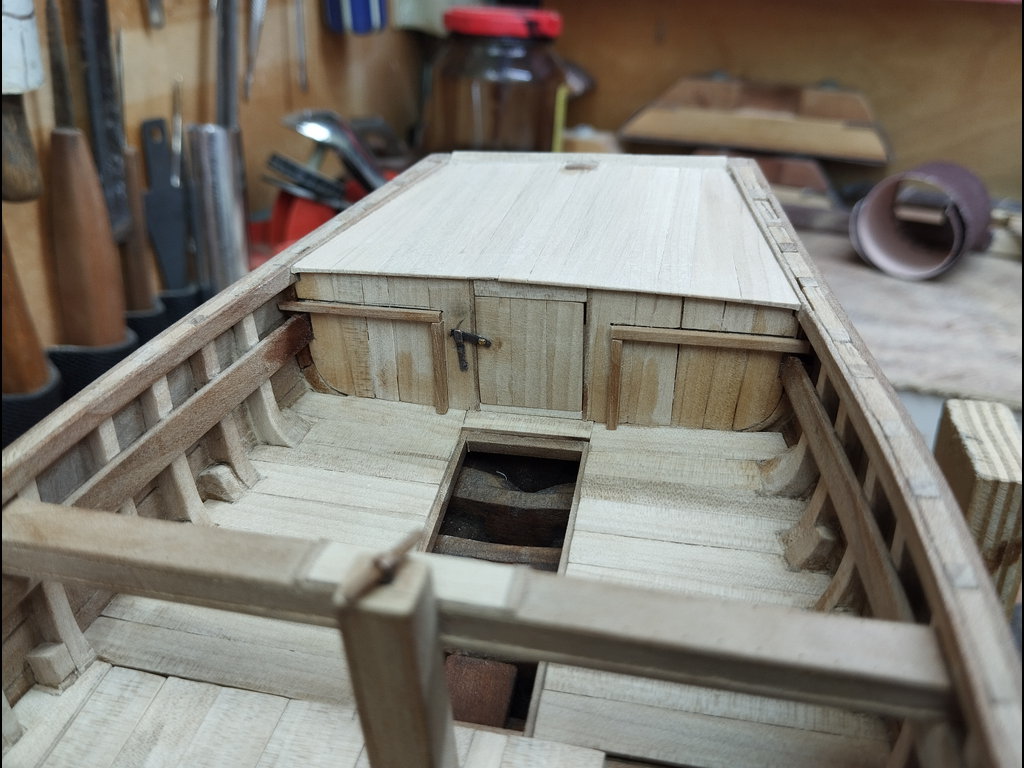 Двигаюсь от носа к корме. Делаю настил палубы. В средней части он был сьемным, так как там перевозили сети и улов..... Также изготавливаю и устанавливаю другие элементы этой части корпуса....