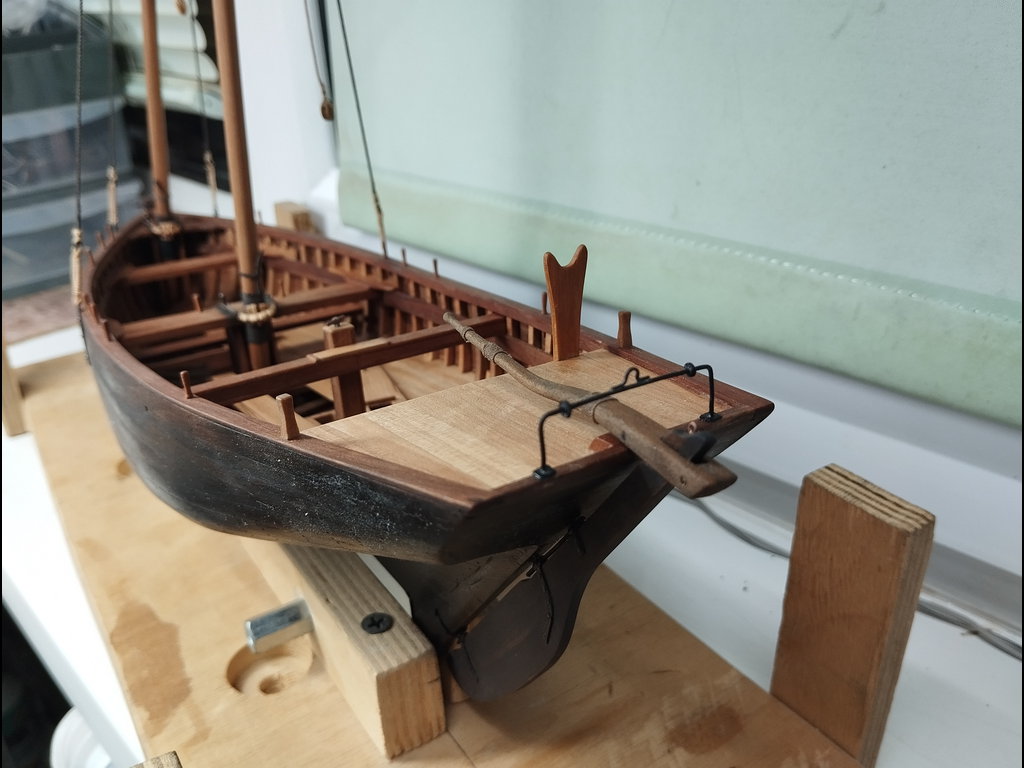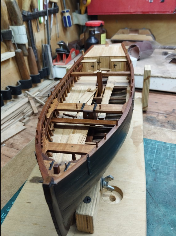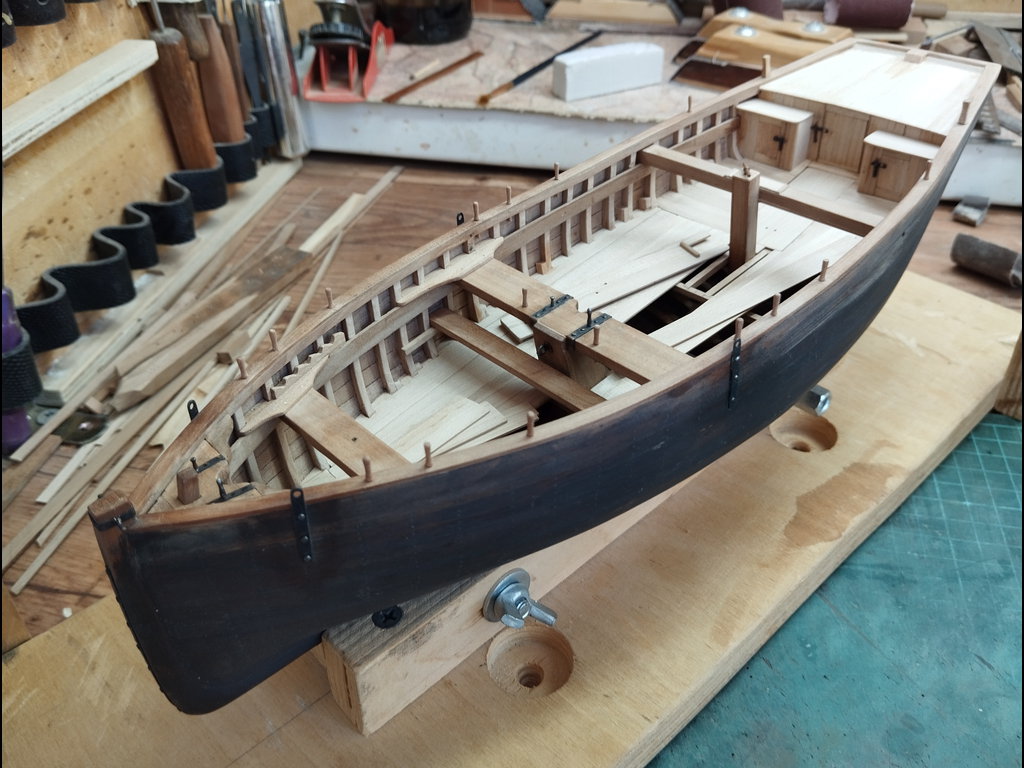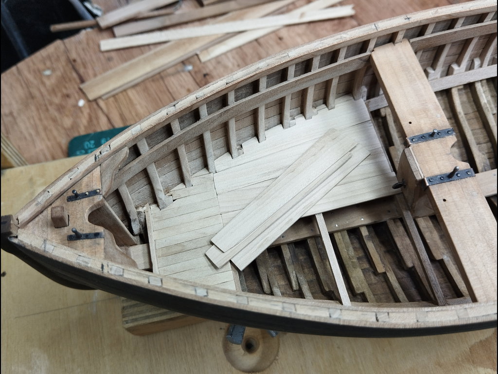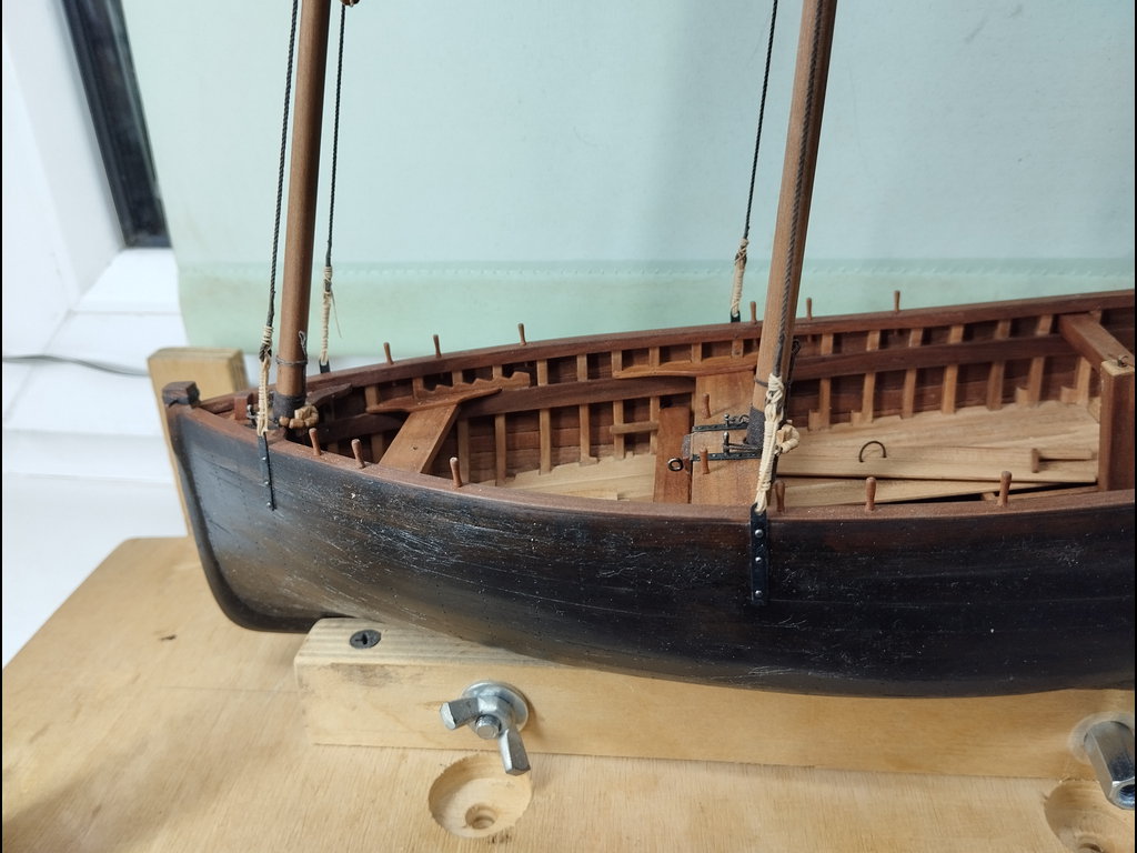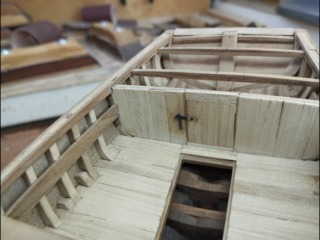 Двигаюсь от носа к корме. Делаю настил палубы. В средней части он был сьемным, так как там перевозили сети и улов..... Также изготавливаю и устанавливаю другие элементы этой части корпуса....