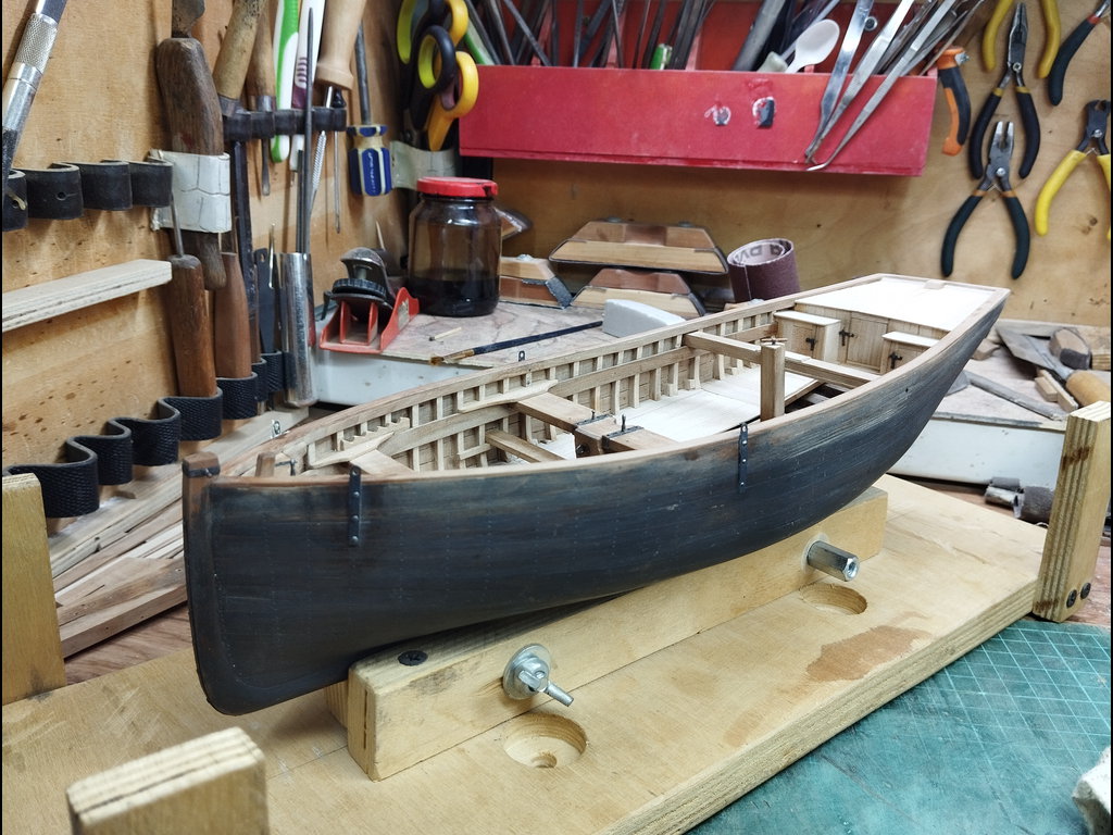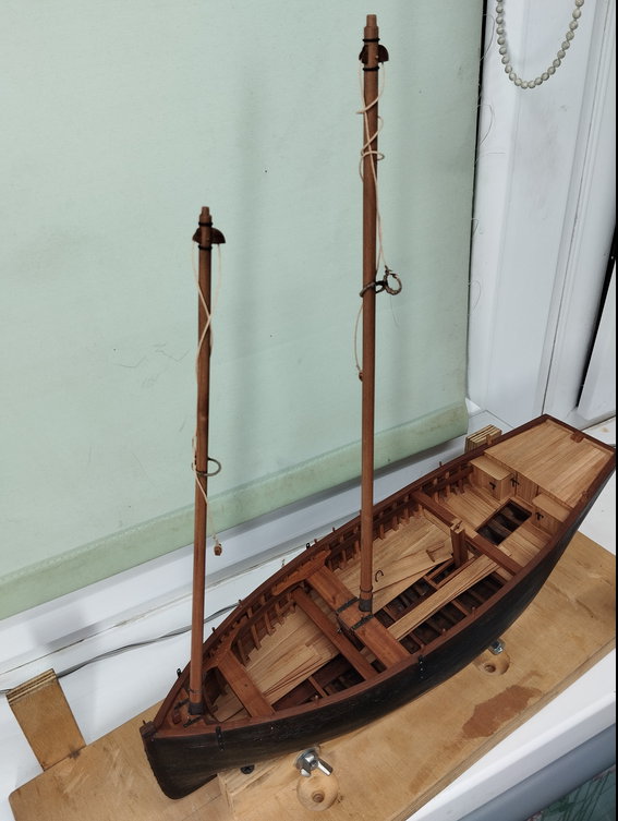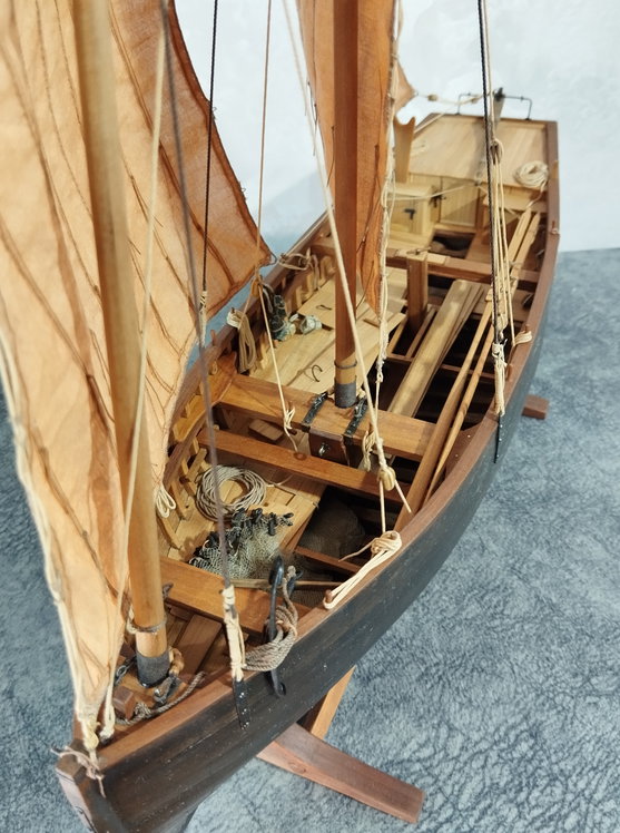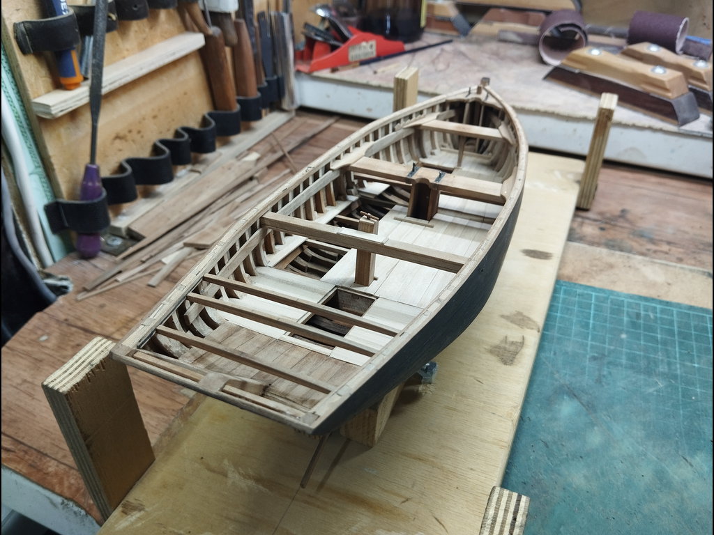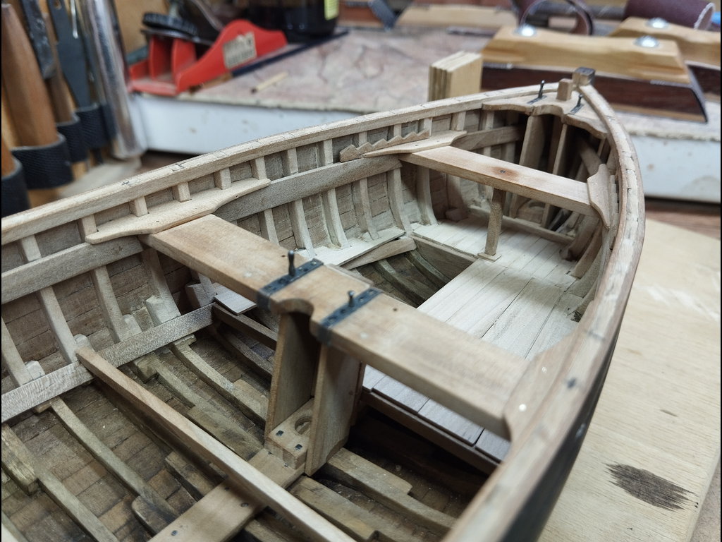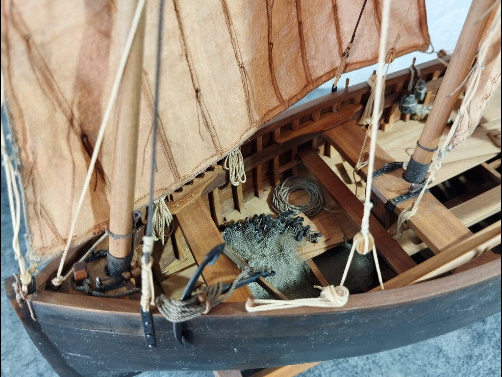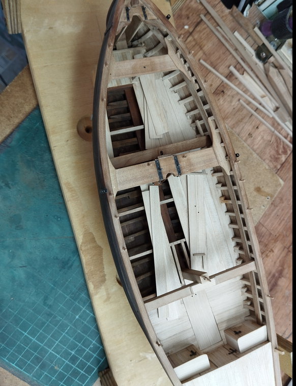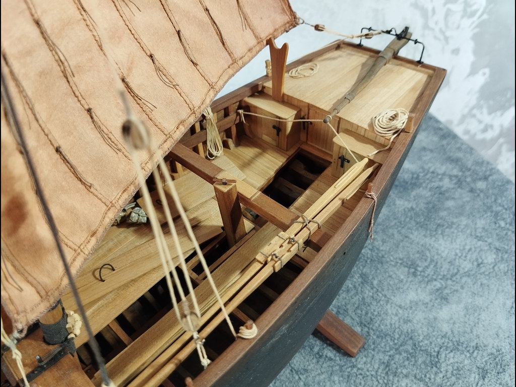 Двигаюсь от носа к корме. Делаю настил палубы. В средней части он был сьемным, так как там перевозили сети и улов..... Также изготавливаю и устанавливаю другие элементы этой части корпуса....