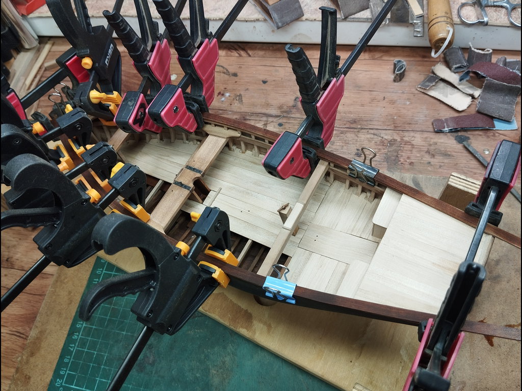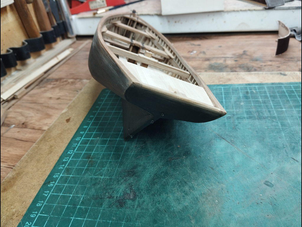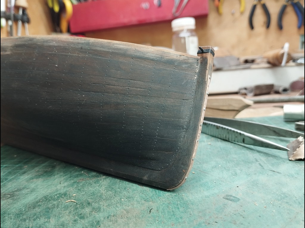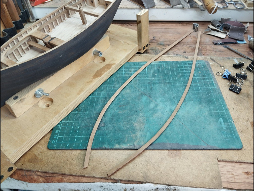 Далее планширь. Делал из цельной рейки,вымочил в нашатыре, выгнул по месту, потом приклейка.............. Также поставил защиткую полосу на штевень ...