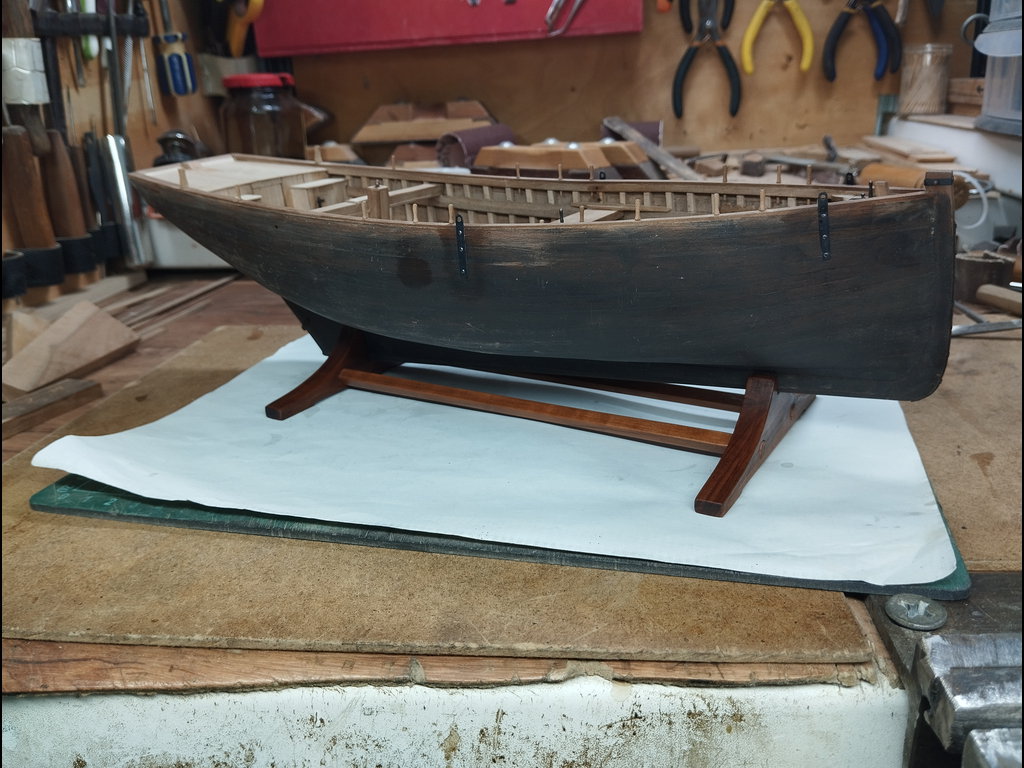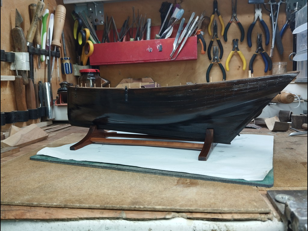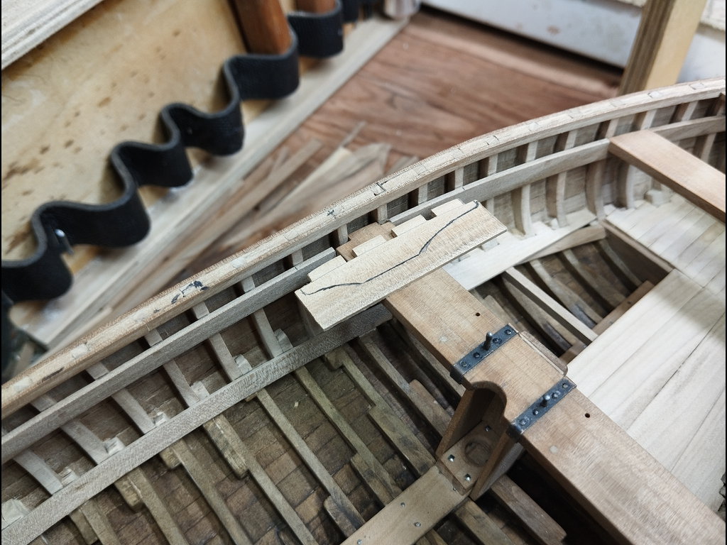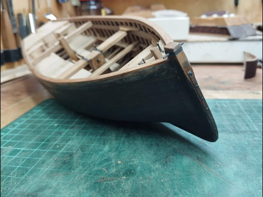 Далее планширь. Делал из цельной рейки,вымочил в нашатыре, выгнул по месту, потом приклейка.............. Также поставил защиткую полосу на штевень ...
