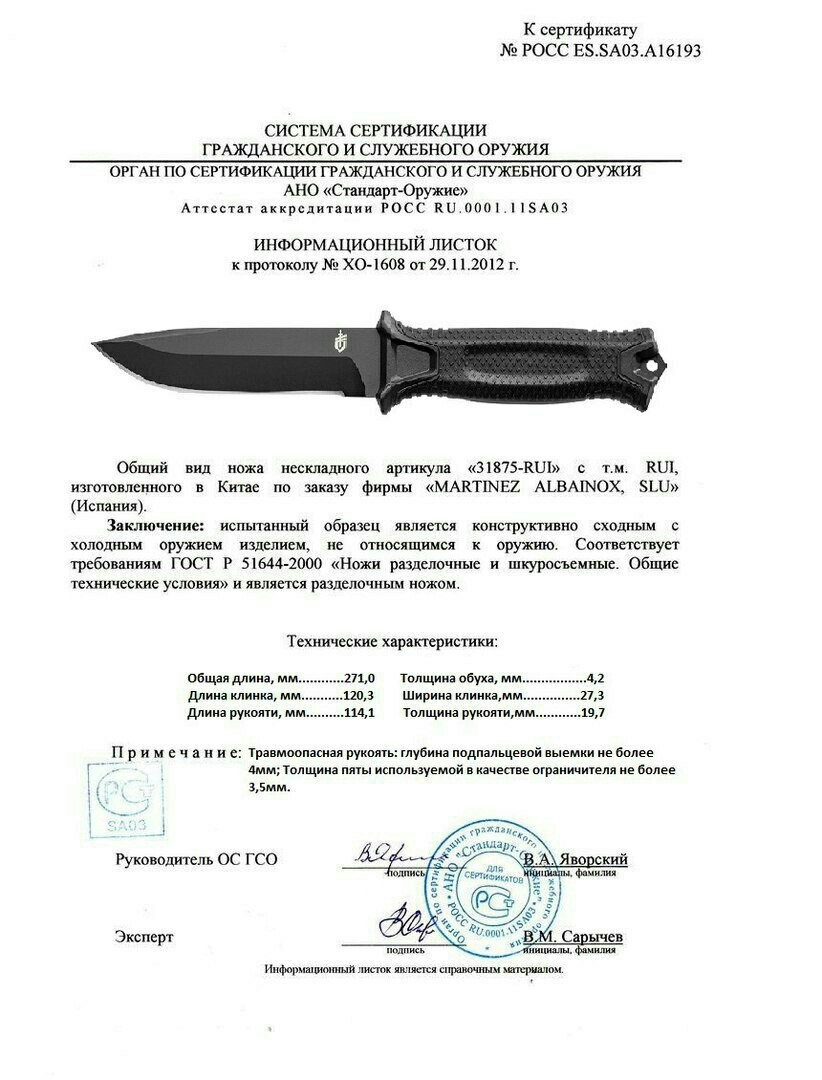 Честно не знаю, кстати когда я его покупал ни какого сертификата на него не было. Был сертификат у магазина, а на сам нож нет.