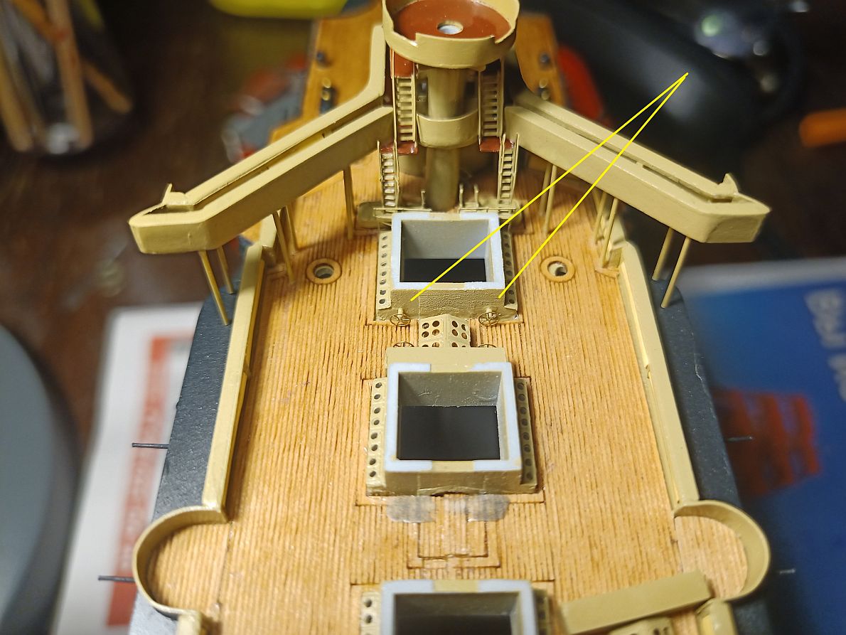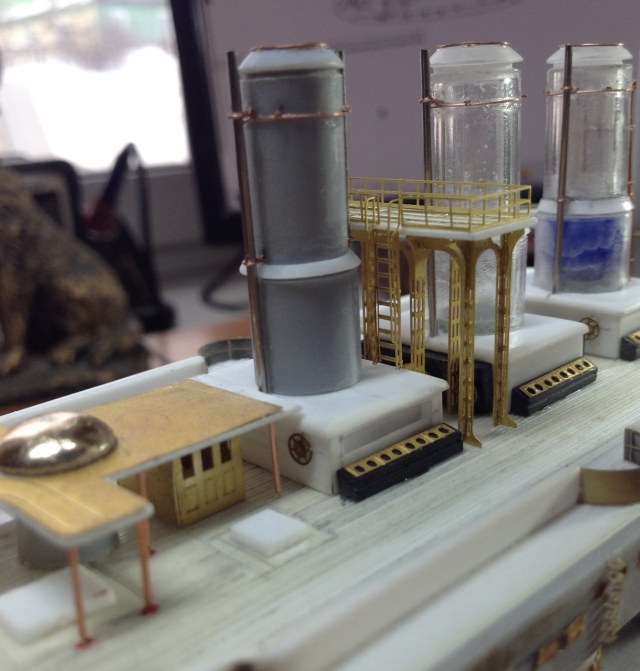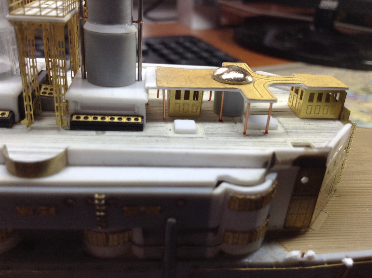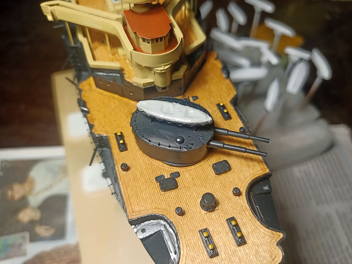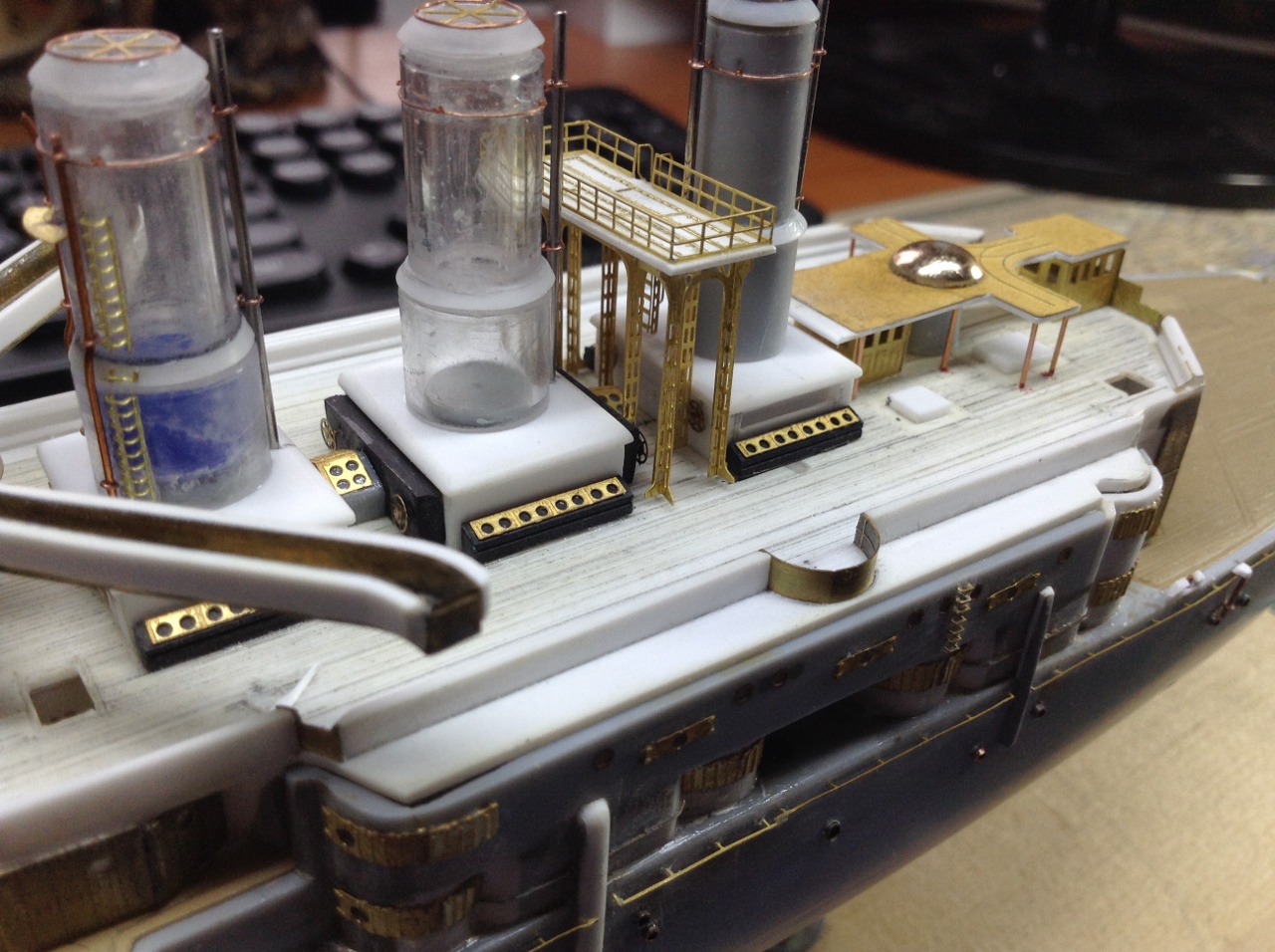 Первое - самая передняя кромка, под мостиком, где эти несчастные трапики, туда я не полезу. Второе - под будущей прожекторной площадкой, там надо лепить, примеряя её готовую. Могут и не влезть.
