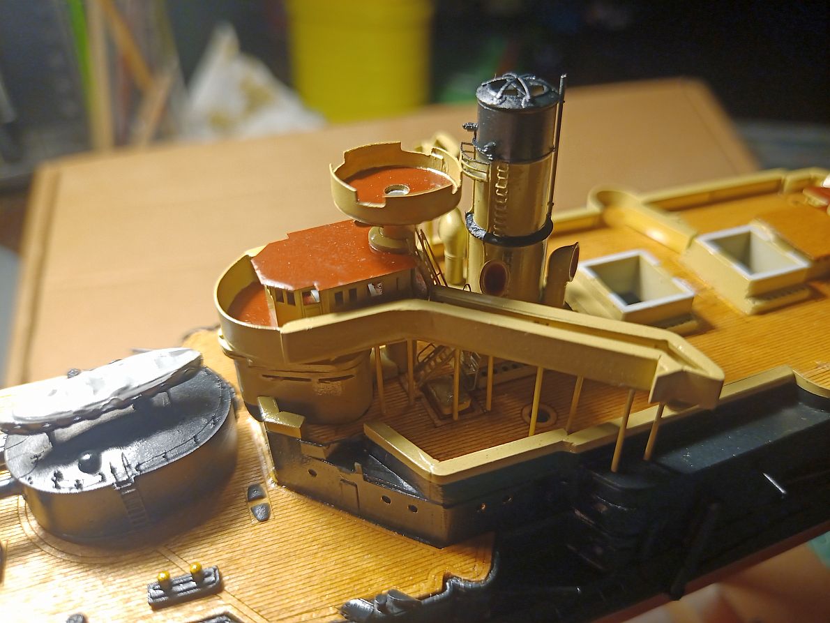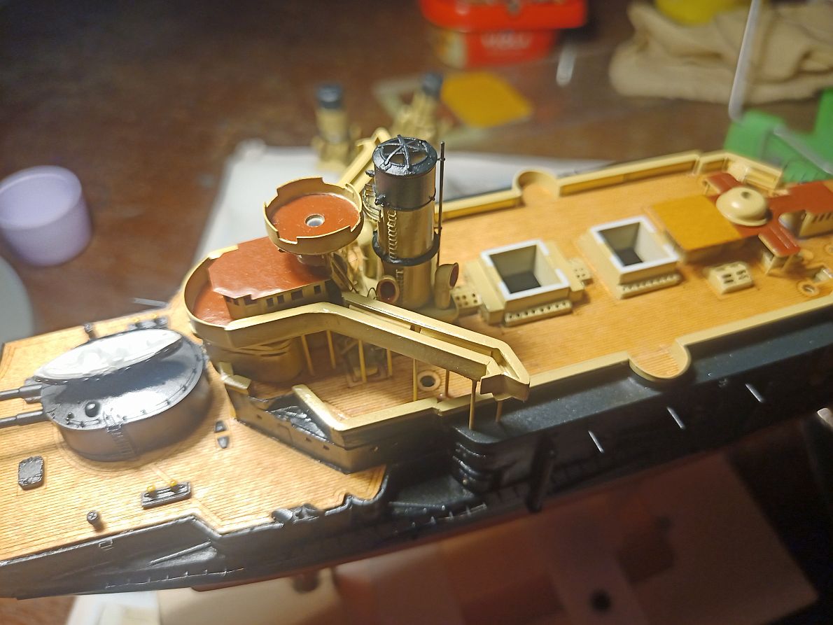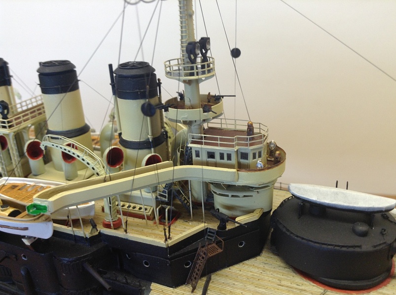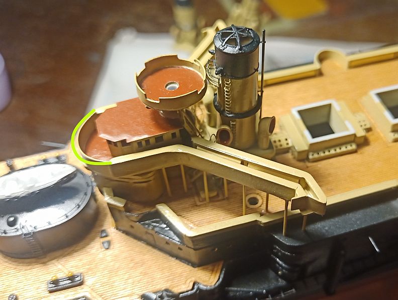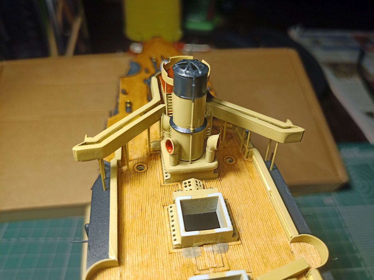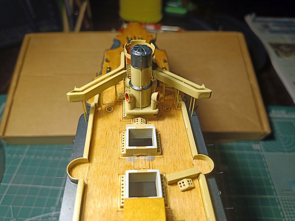 У меня он сделан почти вровень. А если бы можно было подвинуть весь мостик вперёд, то он и перекрывал бы часть палубы и, главное, рубки, боевая и ходовая, чётко встали ОДНА ПОД ДРУГОЙ. Да и у бедных трапиков за мостиком было бы места больше.