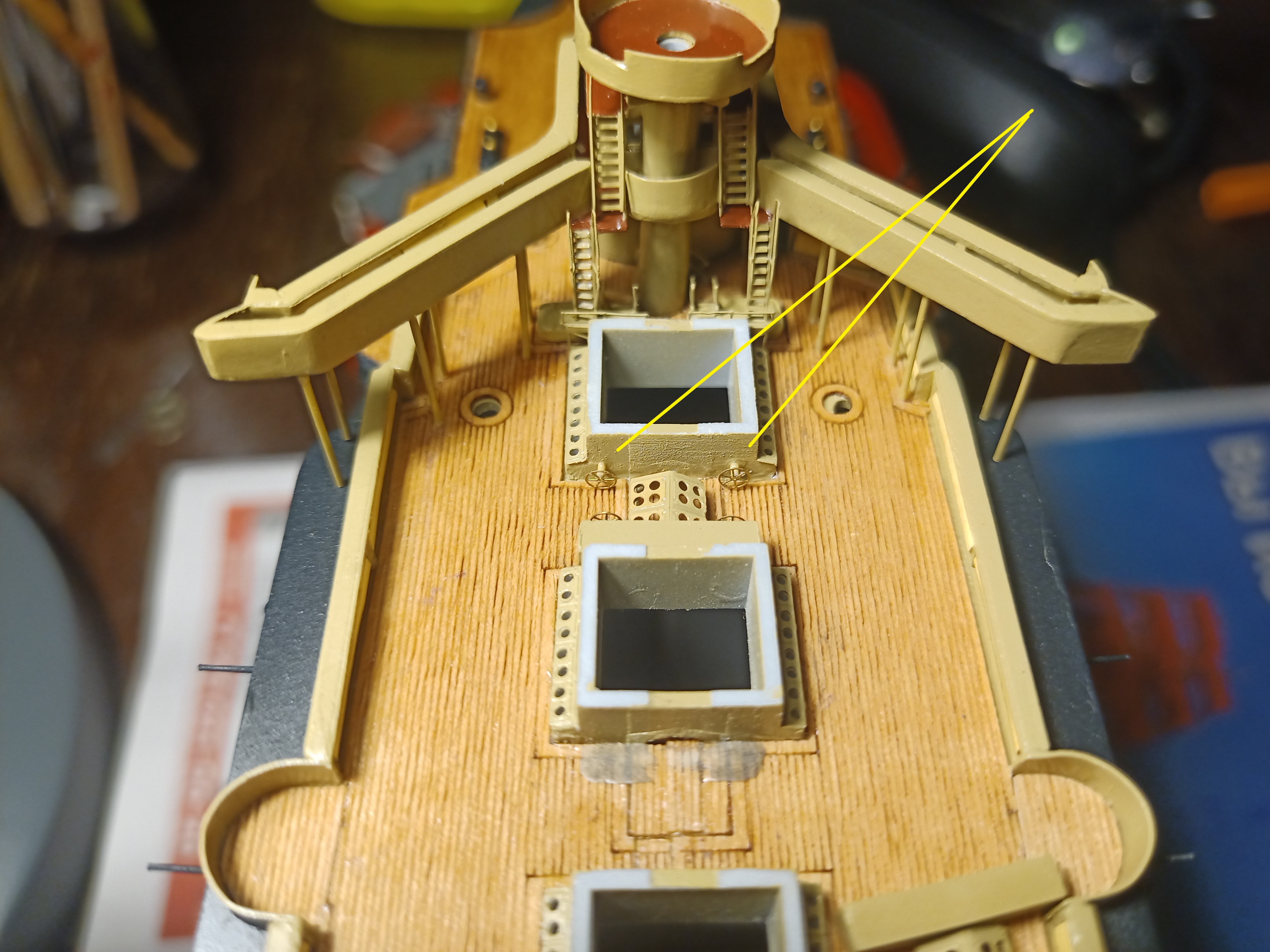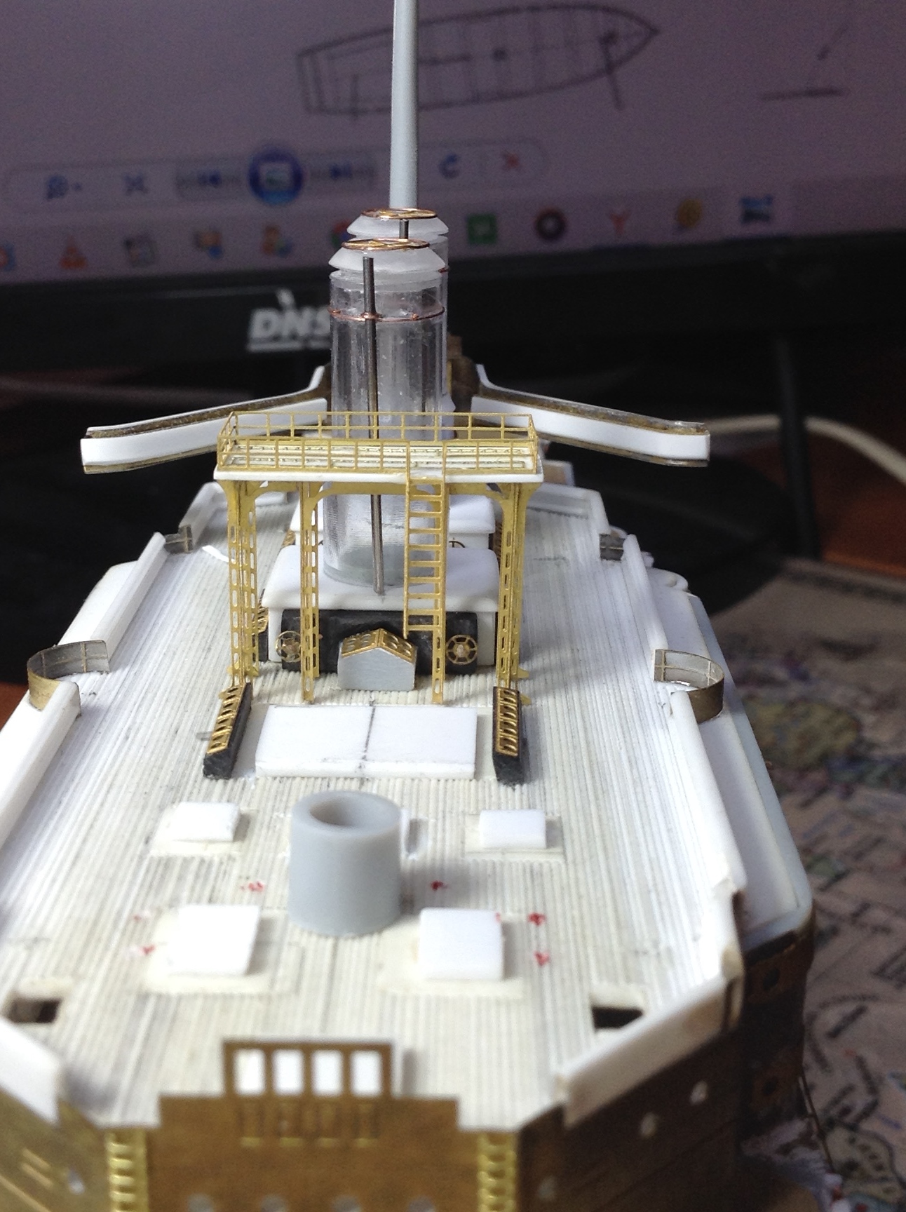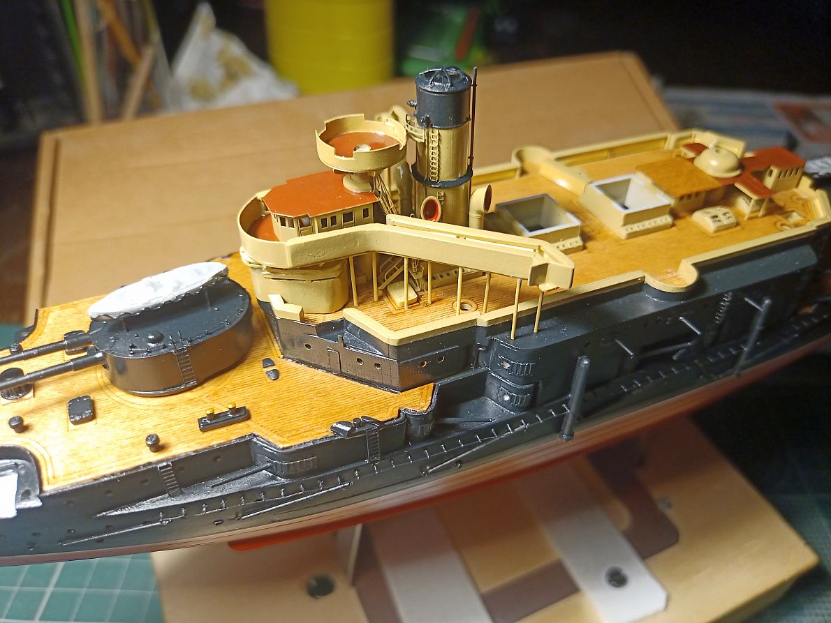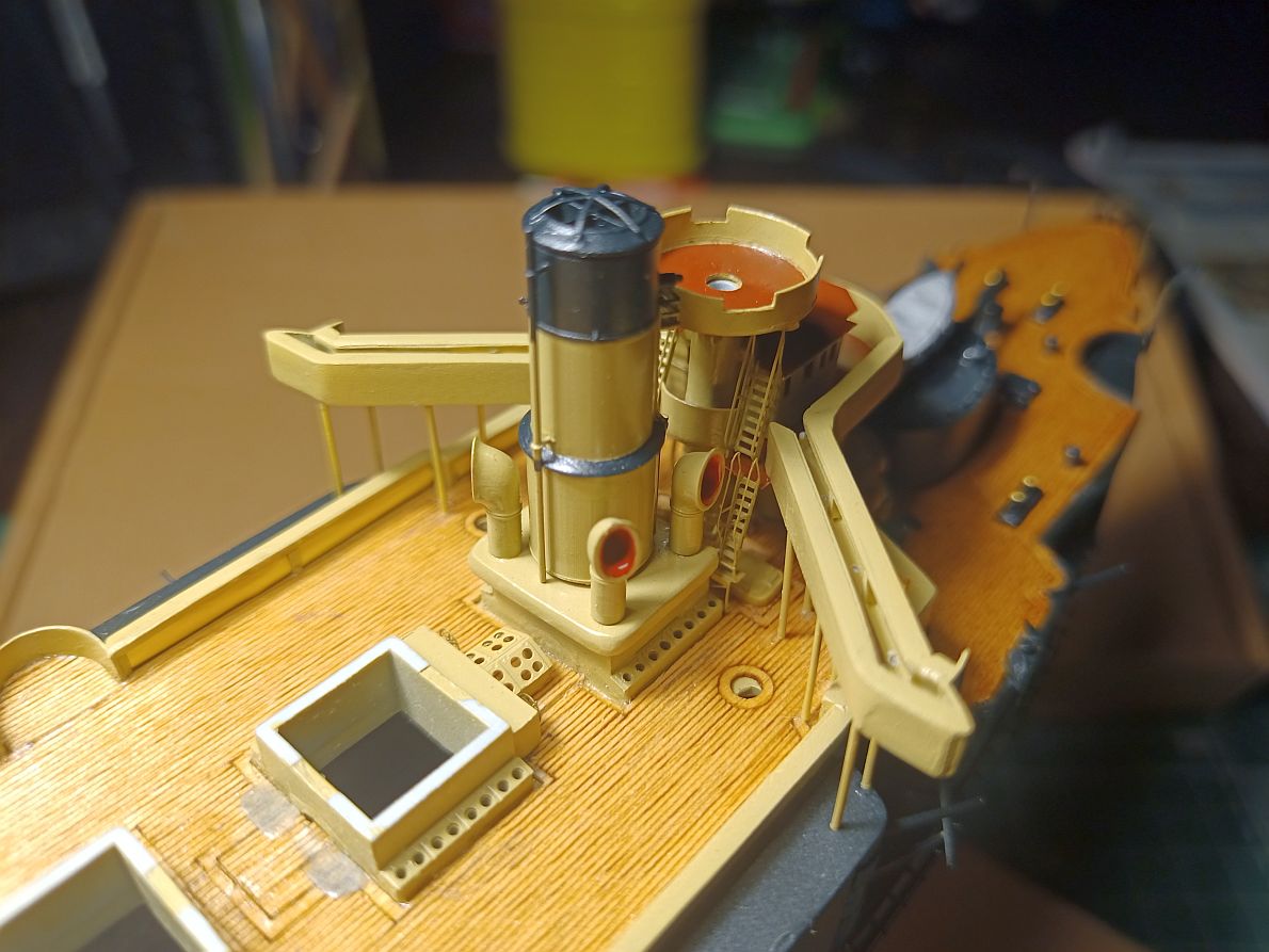 У меня он сделан почти вровень. А если бы можно было подвинуть весь мостик вперёд, то он и перекрывал бы часть палубы и, главное, рубки, боевая и ходовая, чётко встали ОДНА ПОД ДРУГОЙ. Да и у бедных трапиков за мостиком было бы места больше.