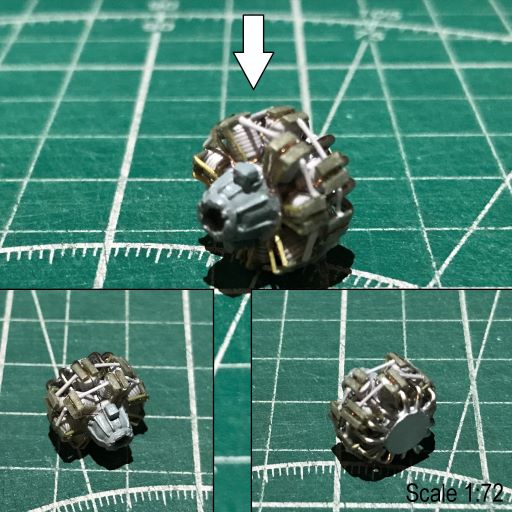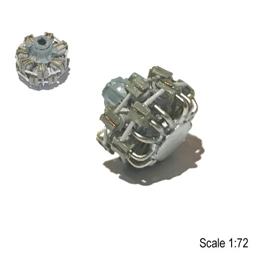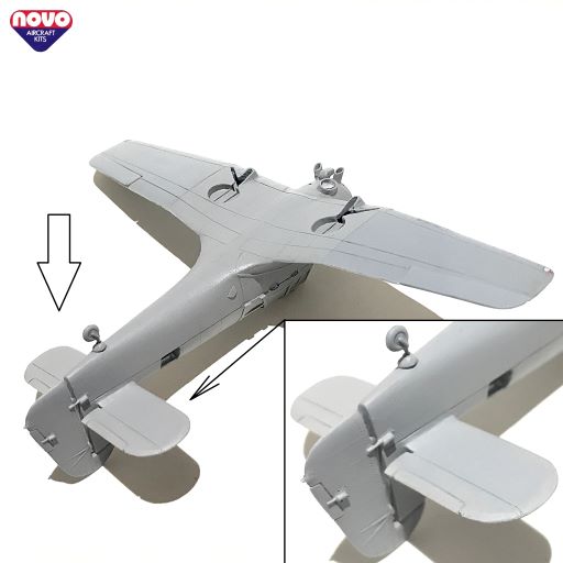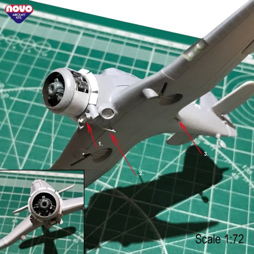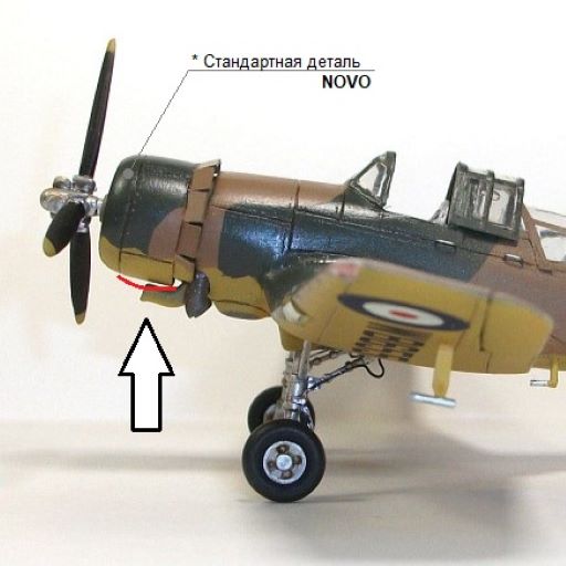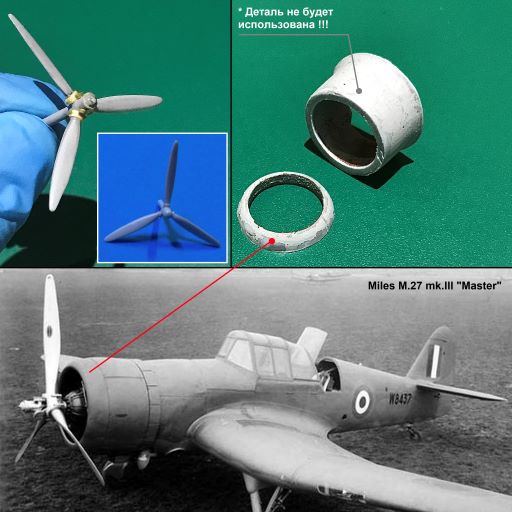 Ну, вот и подошёл черёд капота и двигателя. "Изнаборный" двигатель хорошо ложится во внутреннее пространство утрированного капота и даже нам намекает, что внутри капота имеется что-то похожее на мотор. Однако, данный двигатель совсем неправильный и не подходит к модификации конкретно этого самолёта. На Майлз М27 mkIII ставились американские Pratt & Whitney R-1535 Twin Wasp Junior - 14-цилиндровая версия 9-цилиндрового R-985. Это была двухрядная радиальная конструкция с воздушным охлаждением.