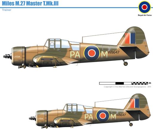 По выбору прототипа: для борта выбираю между Miles “Master” Mk.III, W8513, RAF и Miles “Master” Mk.III, W8647. Вариант с бортом w8647 (Improved Master Mk.II. 55 OTU, 3rd Exercise Unit, RAF - 1943-1944. With a Pratt & Whitney Wasp Junior engine.) более интересный -т.к, такой в модели никто не воплощал. К тому же, интересно и необычно наблюдать на учебном самолёте буквенные тактические обозначения свойственные для Спитфайров и Харрикейнов.