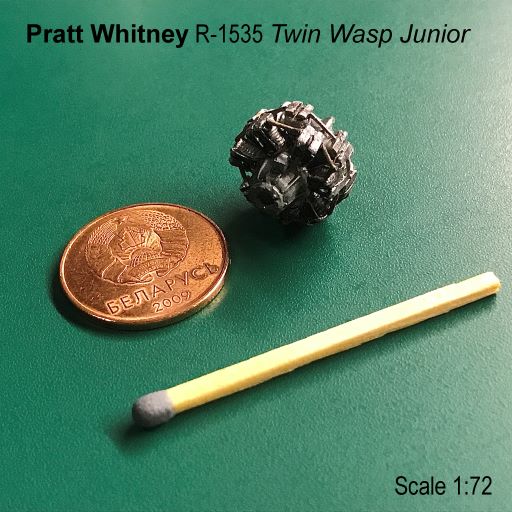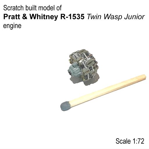 Скрафтил самопалом двигатель Pratt & Whitney R-1535 Twin Wasp Junior . Основной материал - тянутый литник. Цилиндры изготовлены из зубочистки обмотанной тонкой струной из тянутого литника. Штанги толкателей клапанов - тянутый литник. Картер двигателя - медицинский ланцет + палочка из-под леденца. Дополнительно использовал: картон, медную проволоку, канцелярскую скрепку, малярную ленту. Красил акрилами от Zvezda. Тонировал акварелями Sonet.