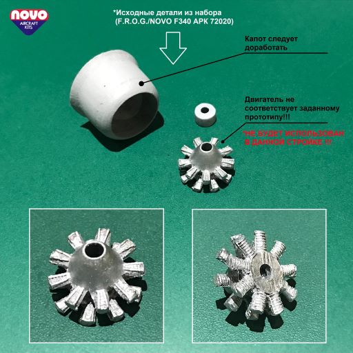 В любом случае, переделка двигателя не имеет смысла. Поэтому, решил делать требуемый двигатель(R-1535) с нуля. Хочу его достаточно проработать по деталям - т.к, планирую "открывать" капот. Для этого придётся, по всей видимости, полностью перепилить изнаборную деталь. Есть идея: не просто сточить створки жалюзи и прорезать отверстие по линии панели сбоку, - а оставить только переднее кольцо обтекателя капота. Но, посмотрим что и как будет получаться. А на данный момент, "новошевский" двигатель отправляется в загашник к прочему деталью. Может, где-нибудь и сгодится когда-нибудь.