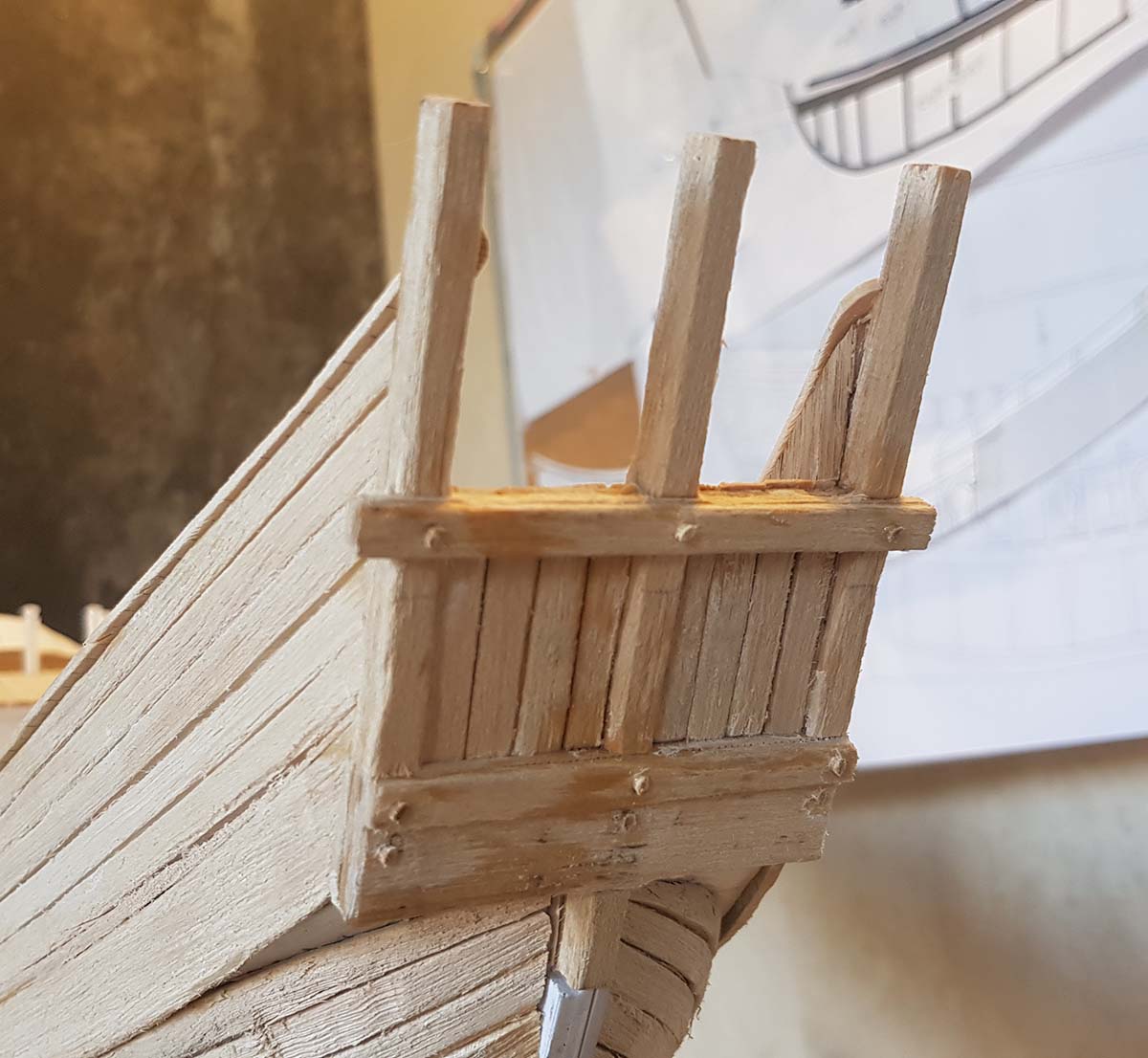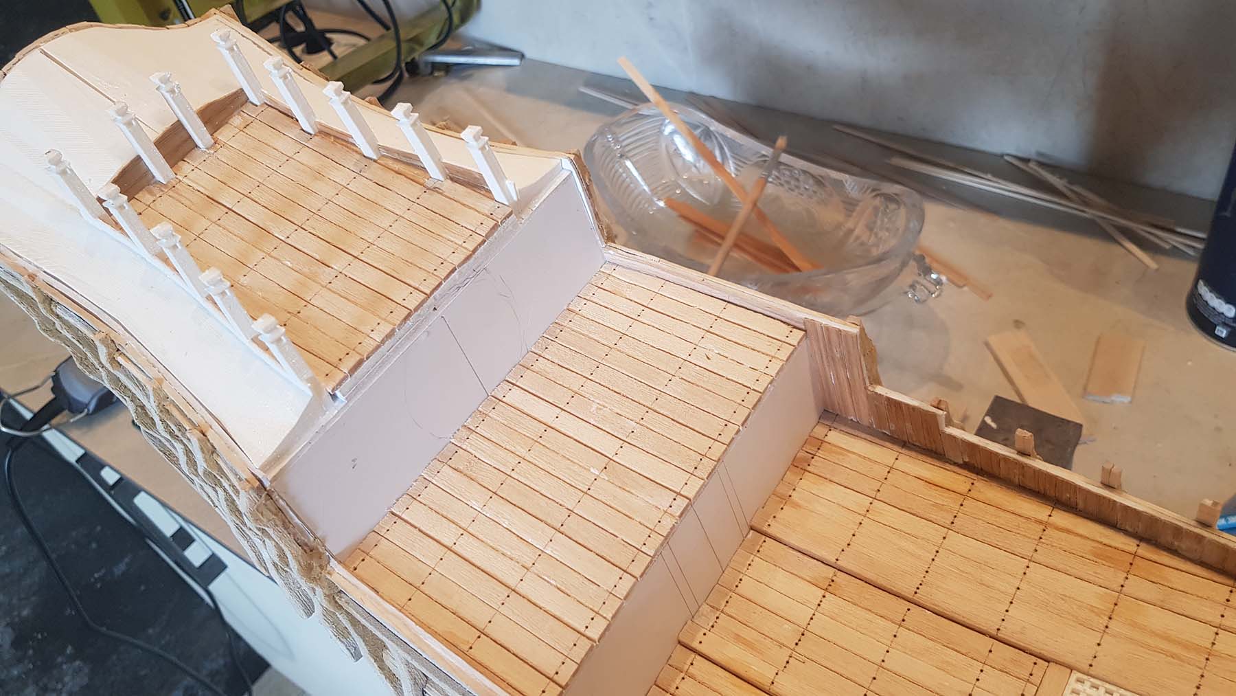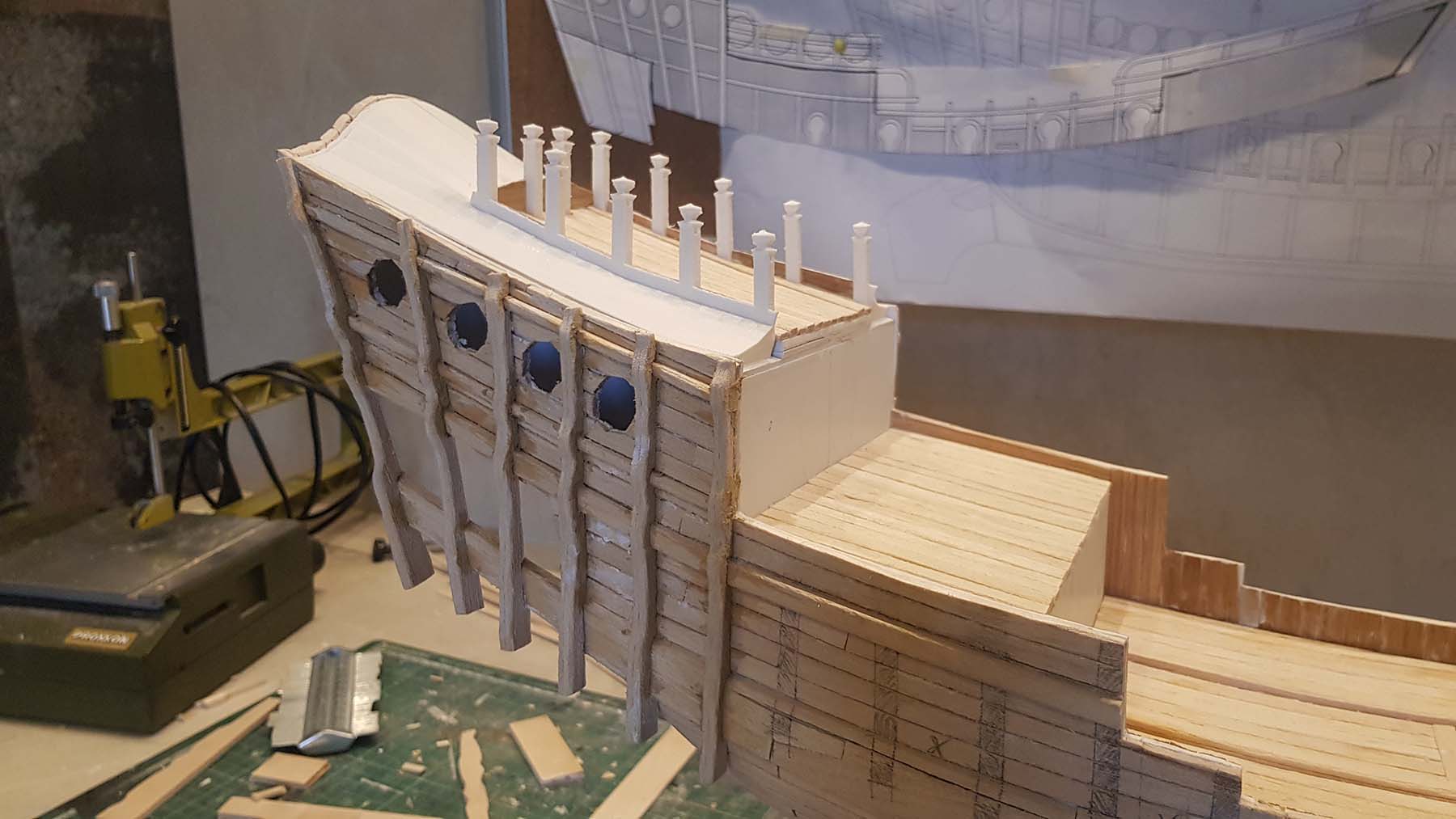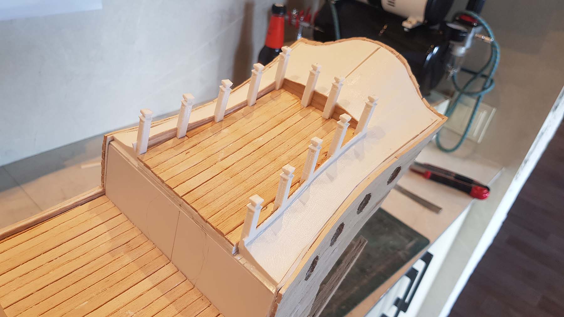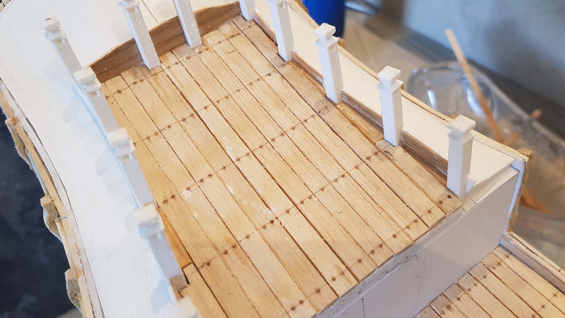 Начал делать верхние планширы. Сначала поставил стойки