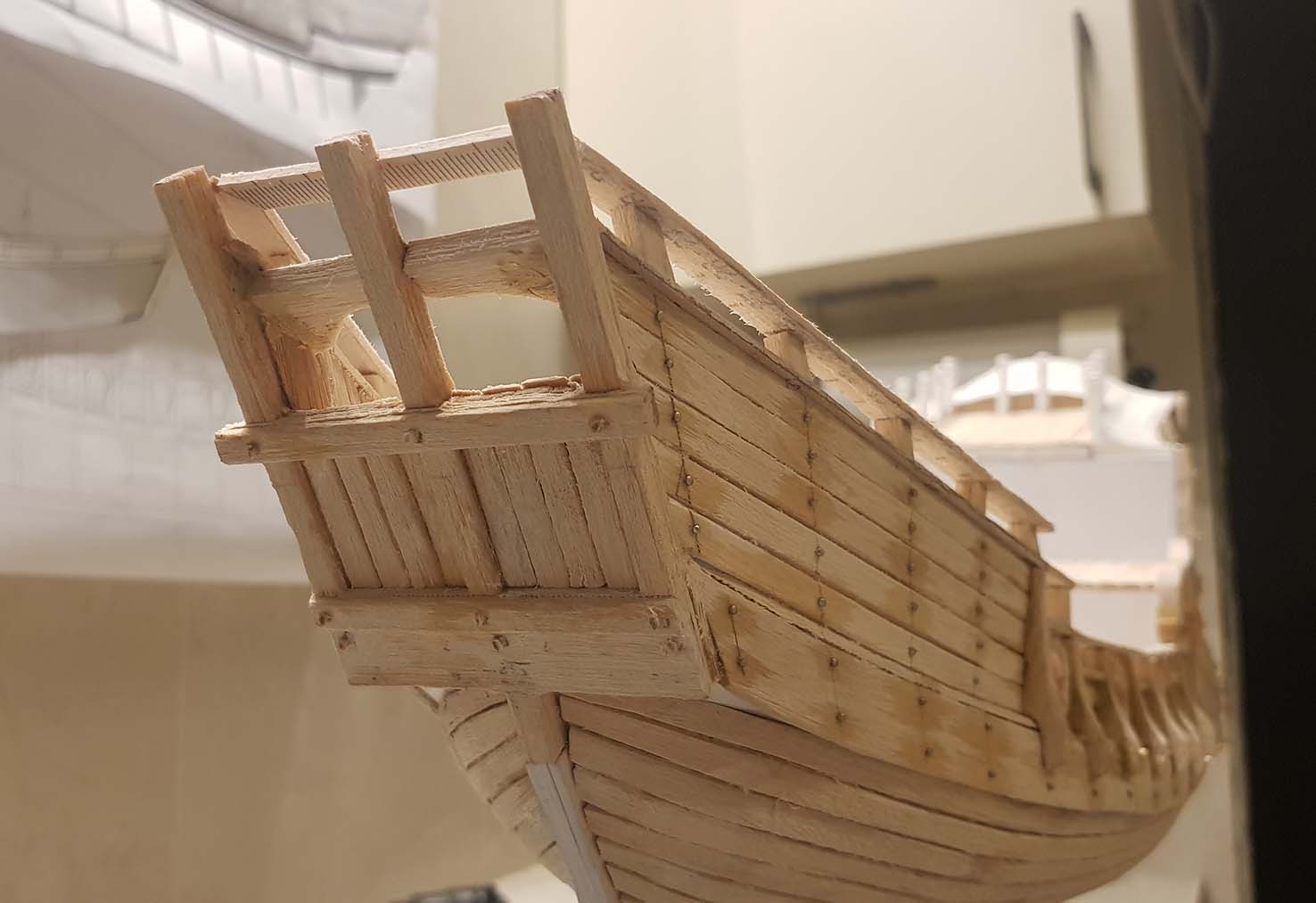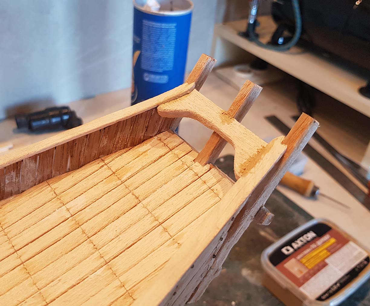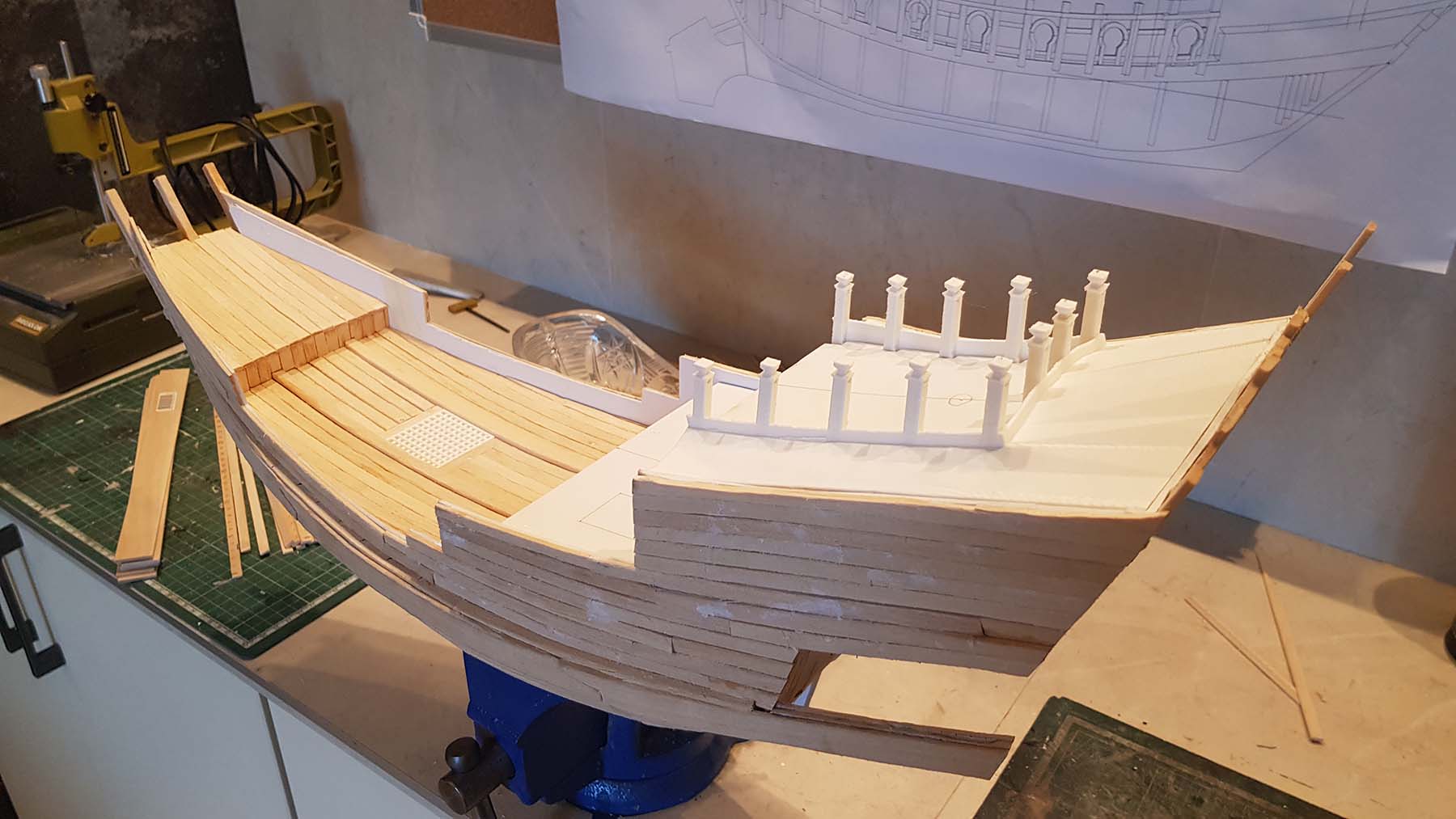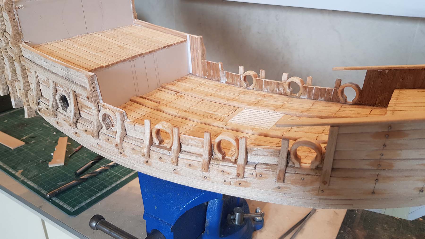 Начал делать верхние планширы. Сначала поставил стойки