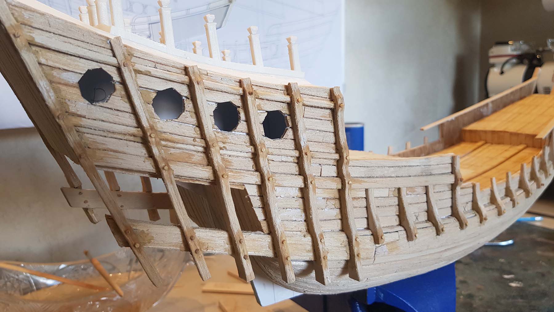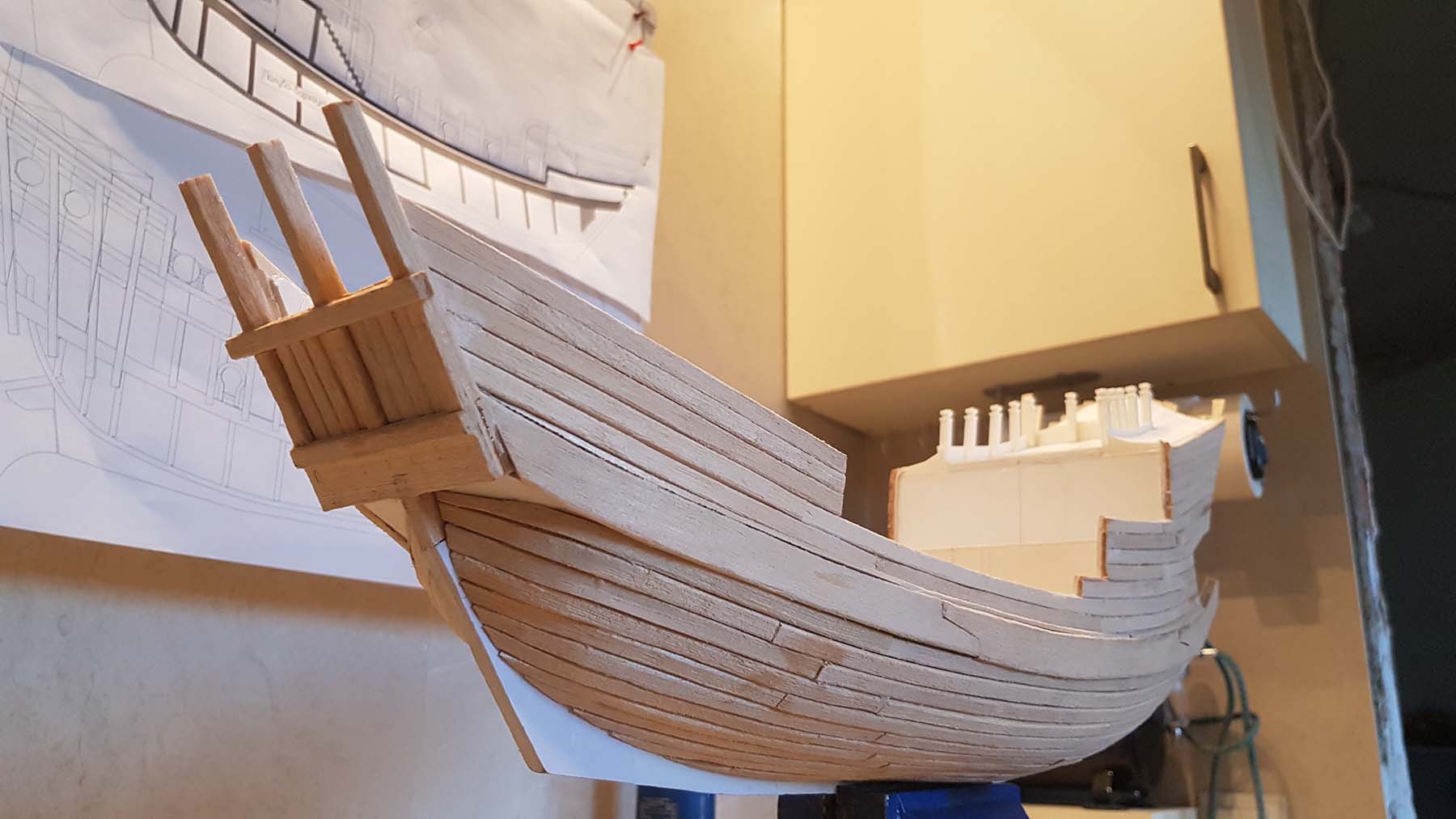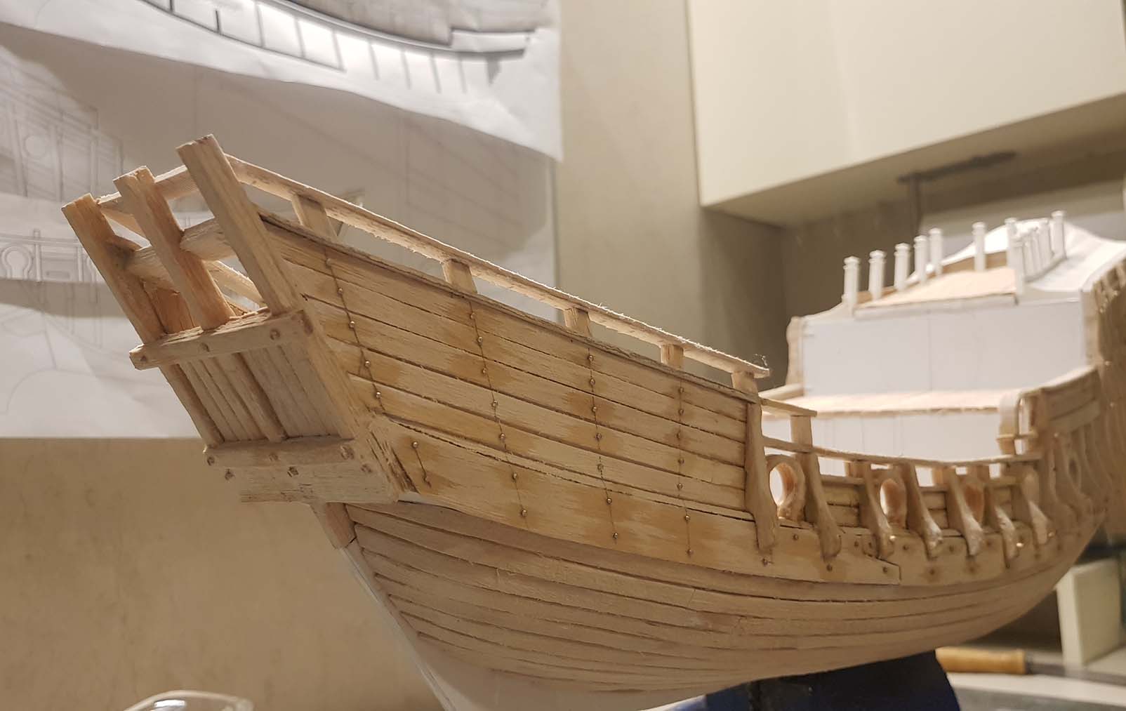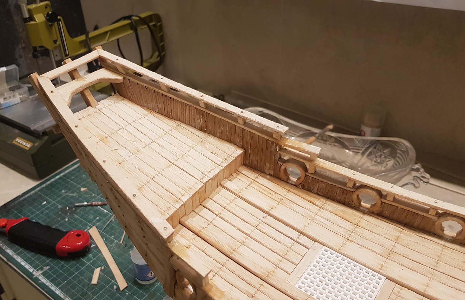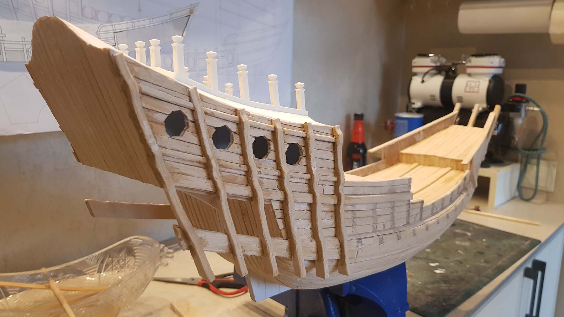 Начал делать верхние планширы. Сначала поставил стойки