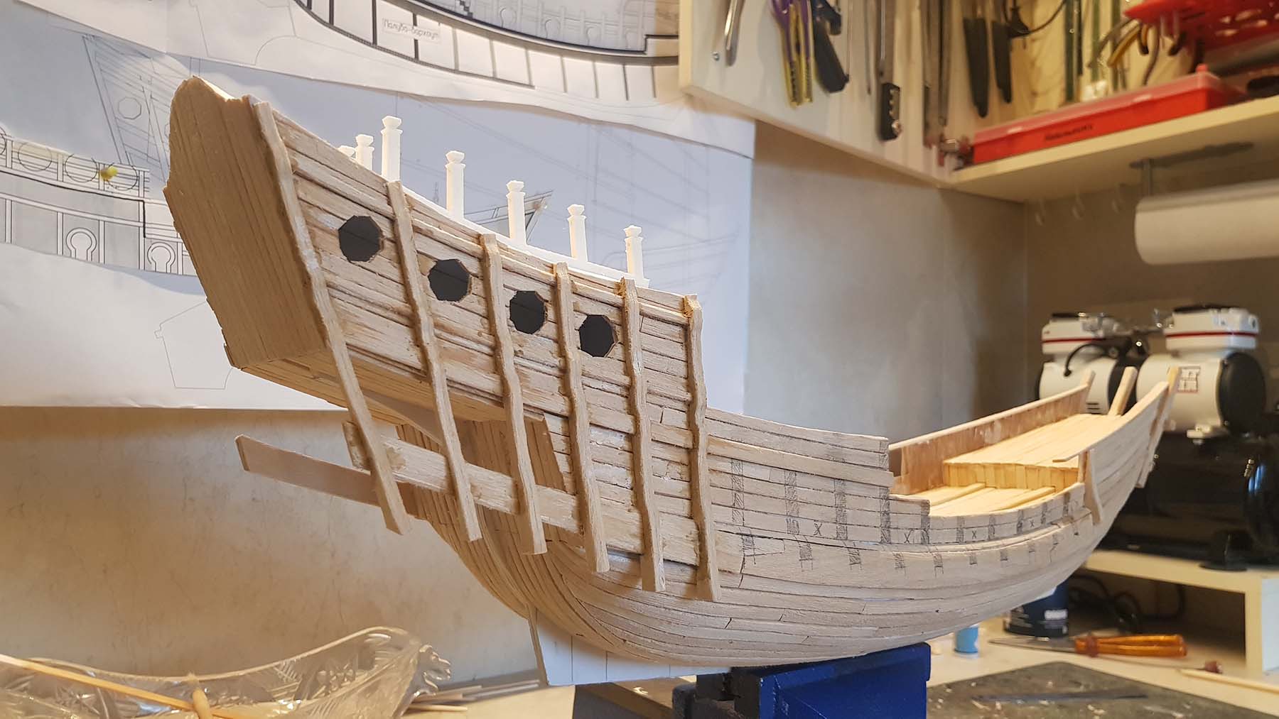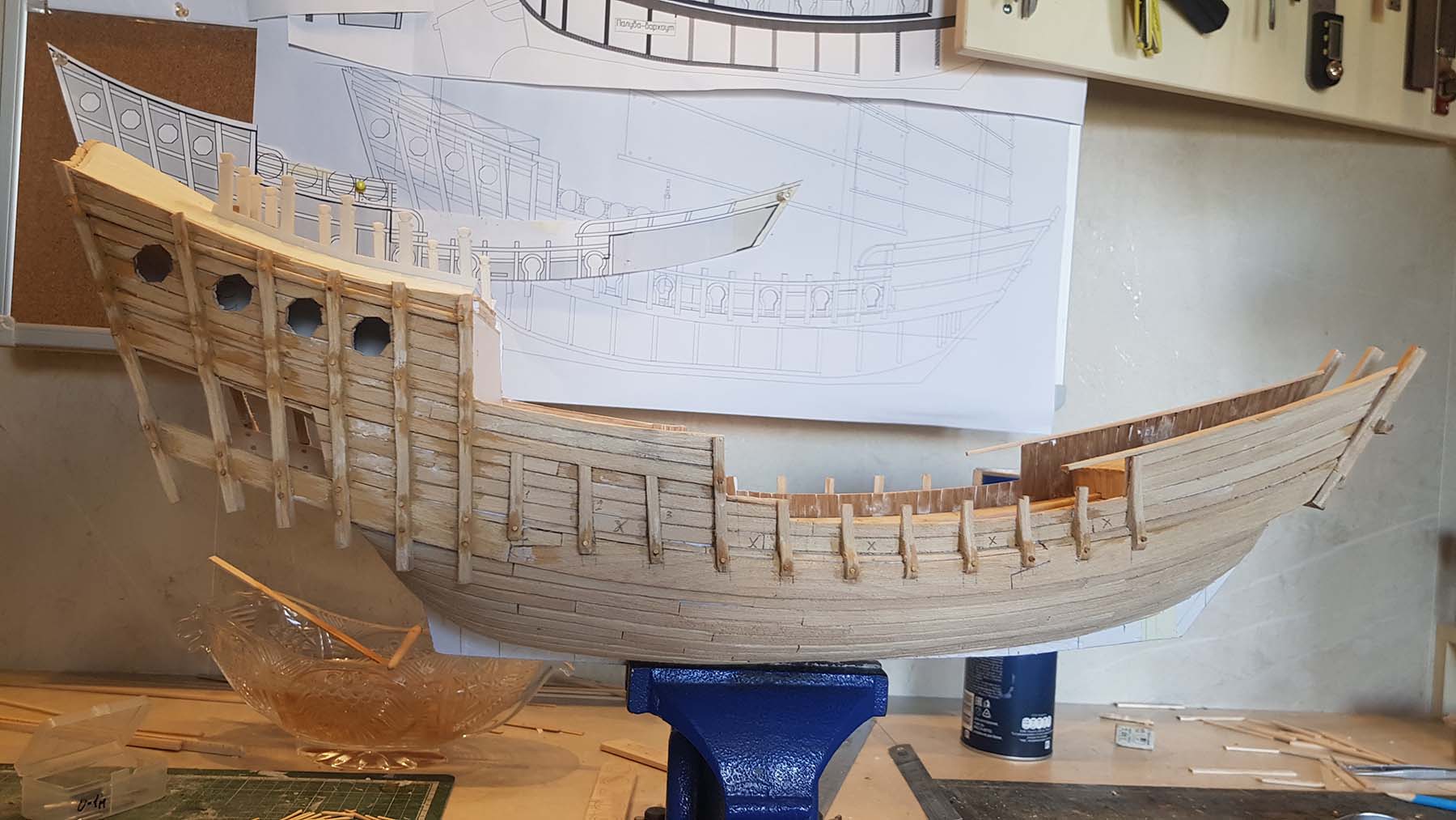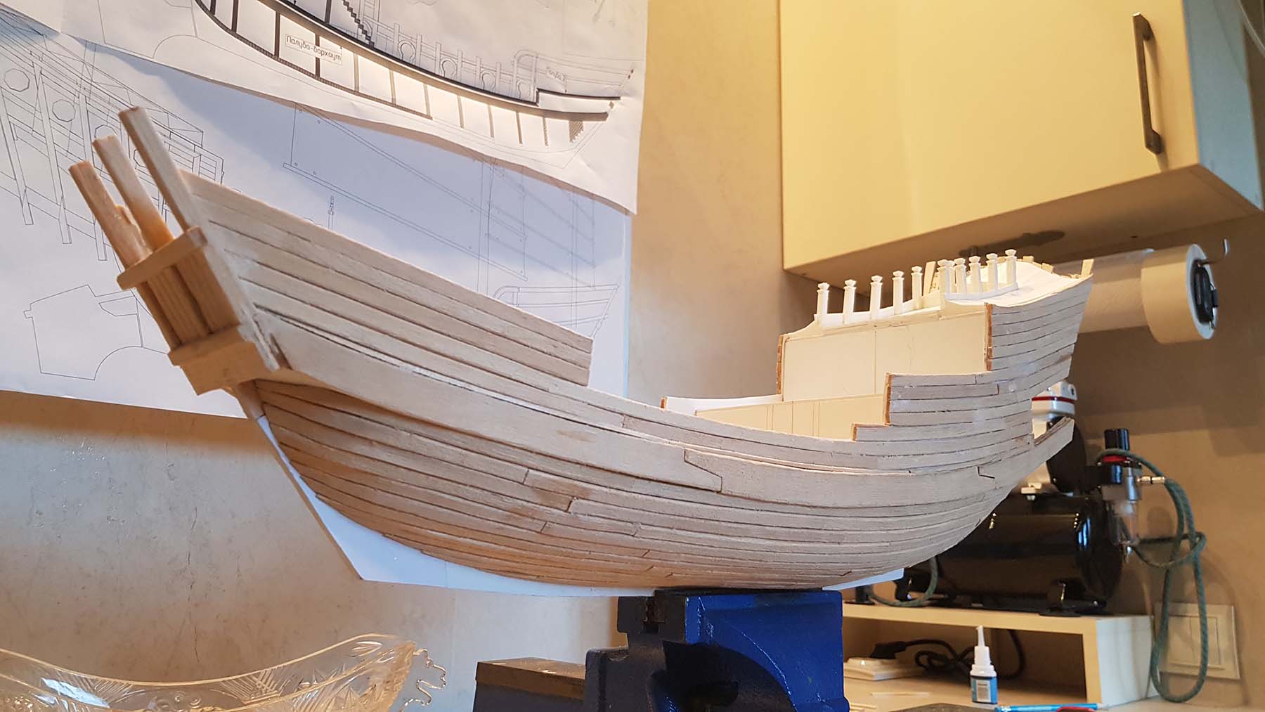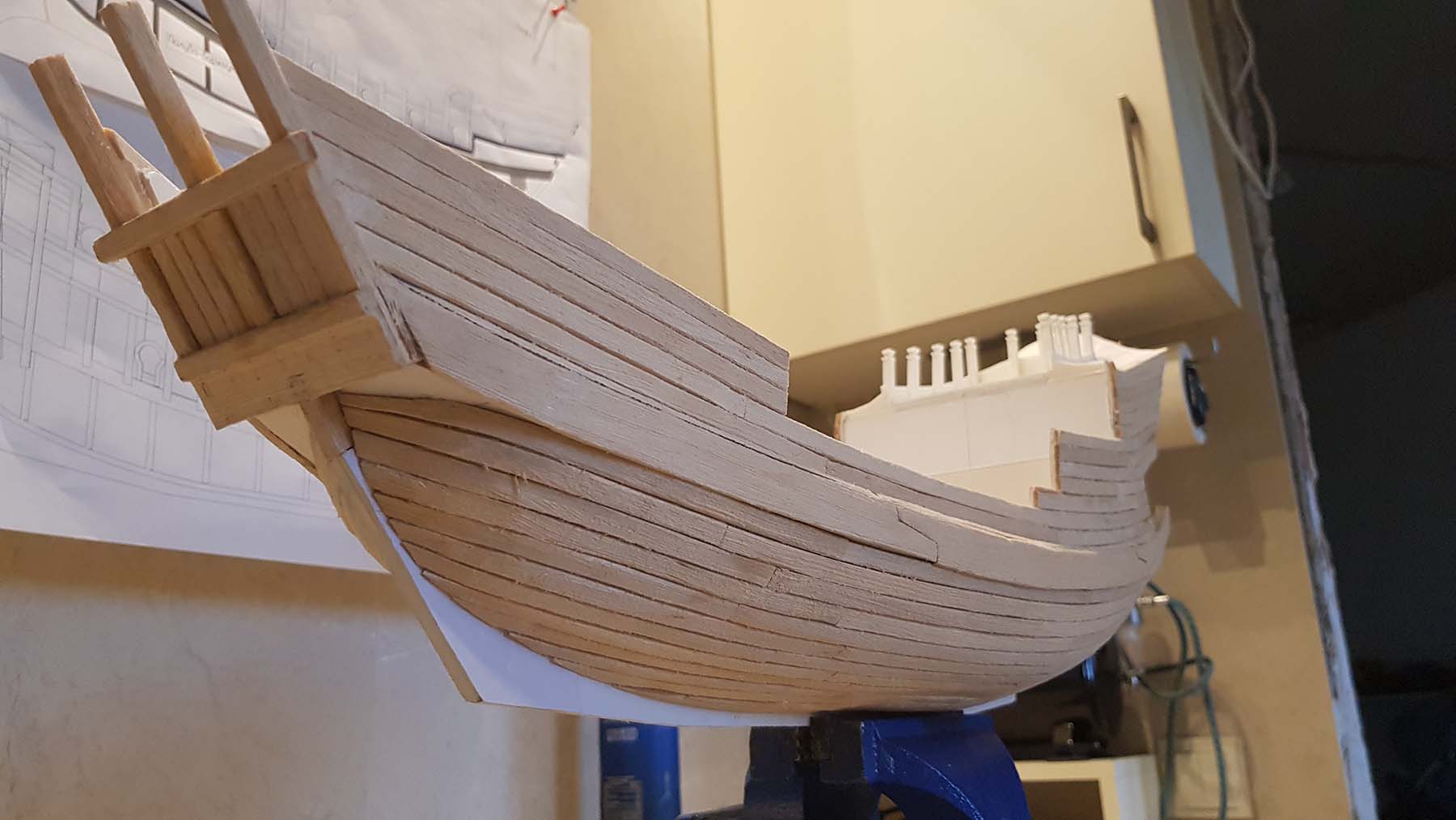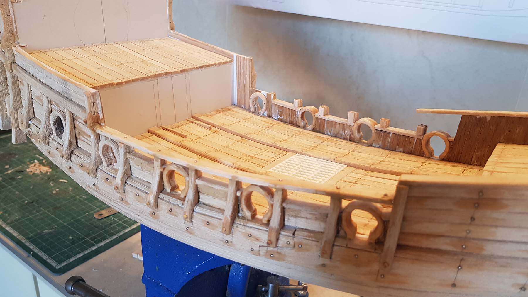 Начал делать верхние планширы. Сначала поставил стойки
