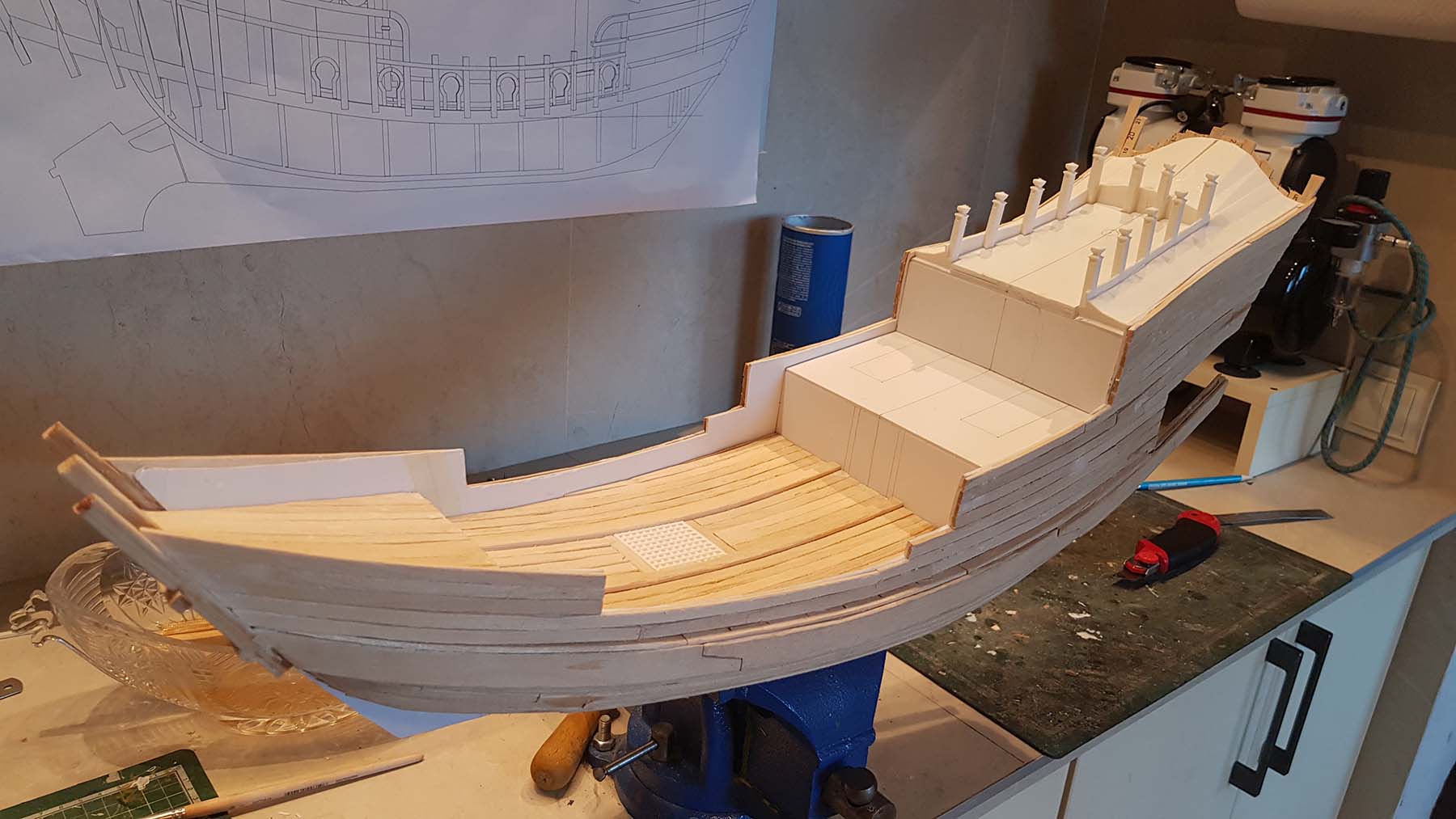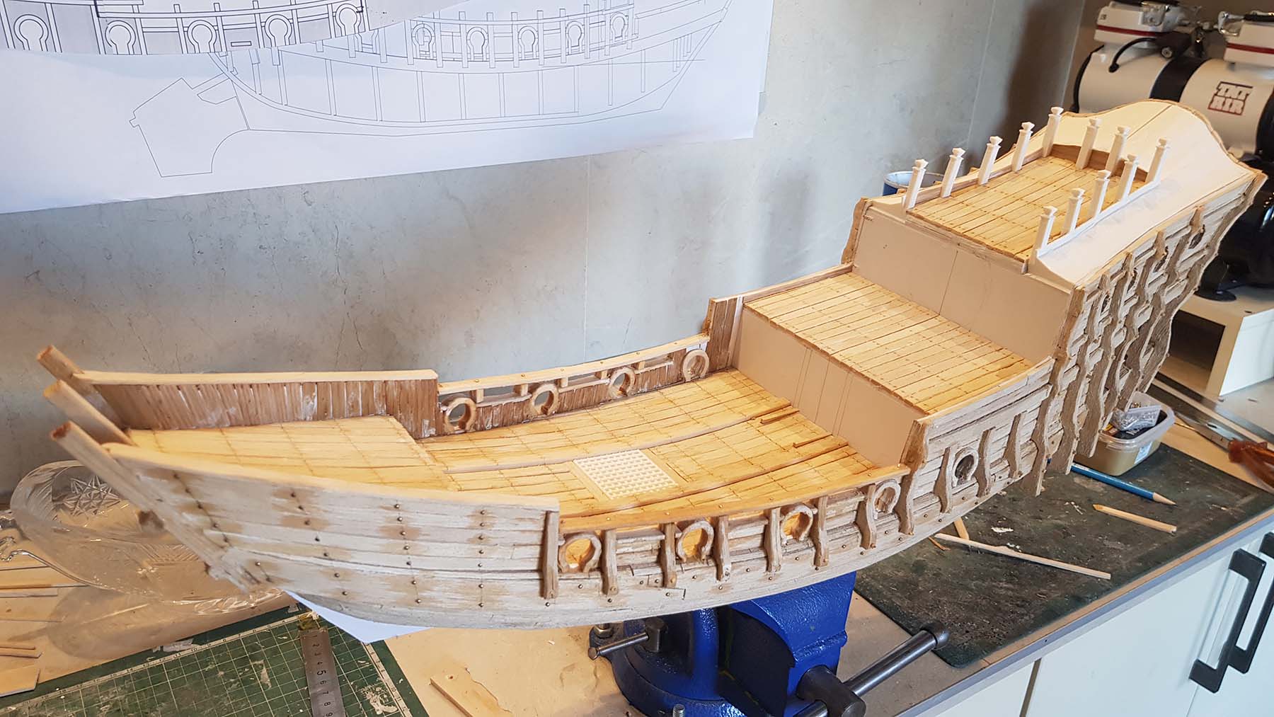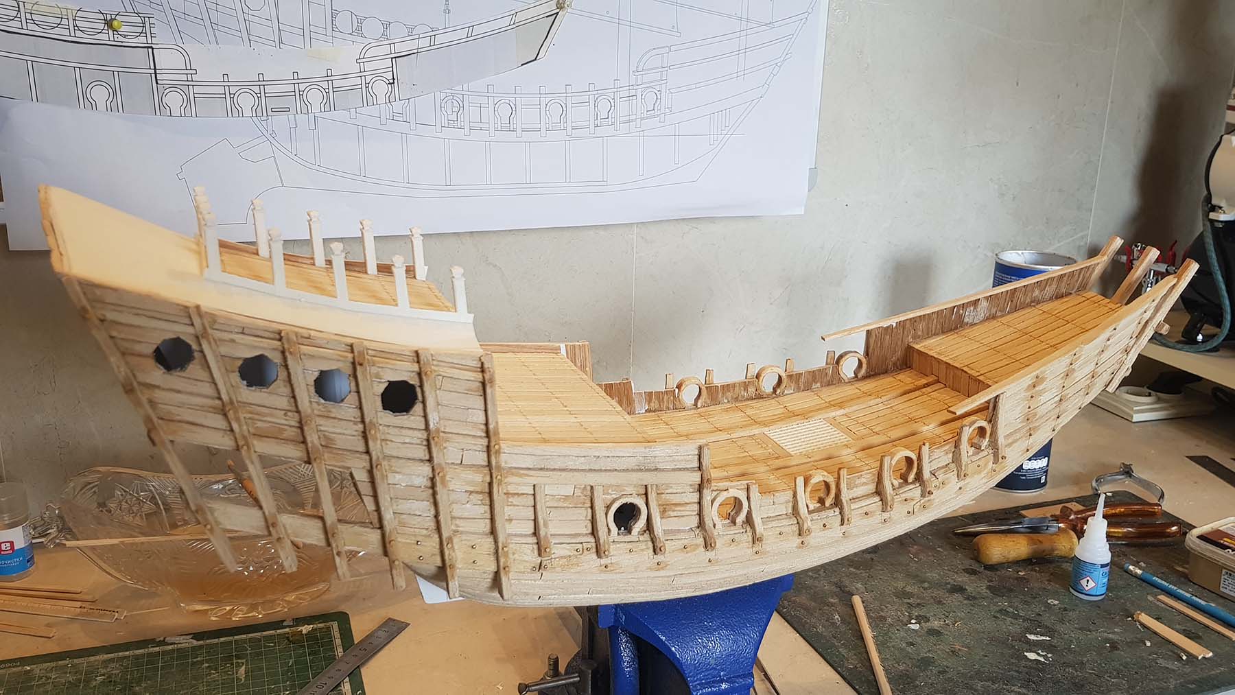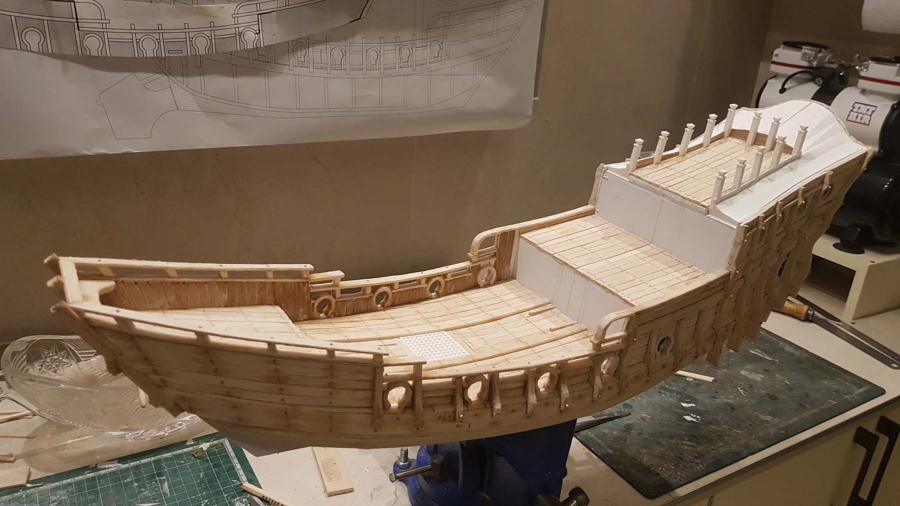 Начал делать верхние планширы. Сначала поставил стойки