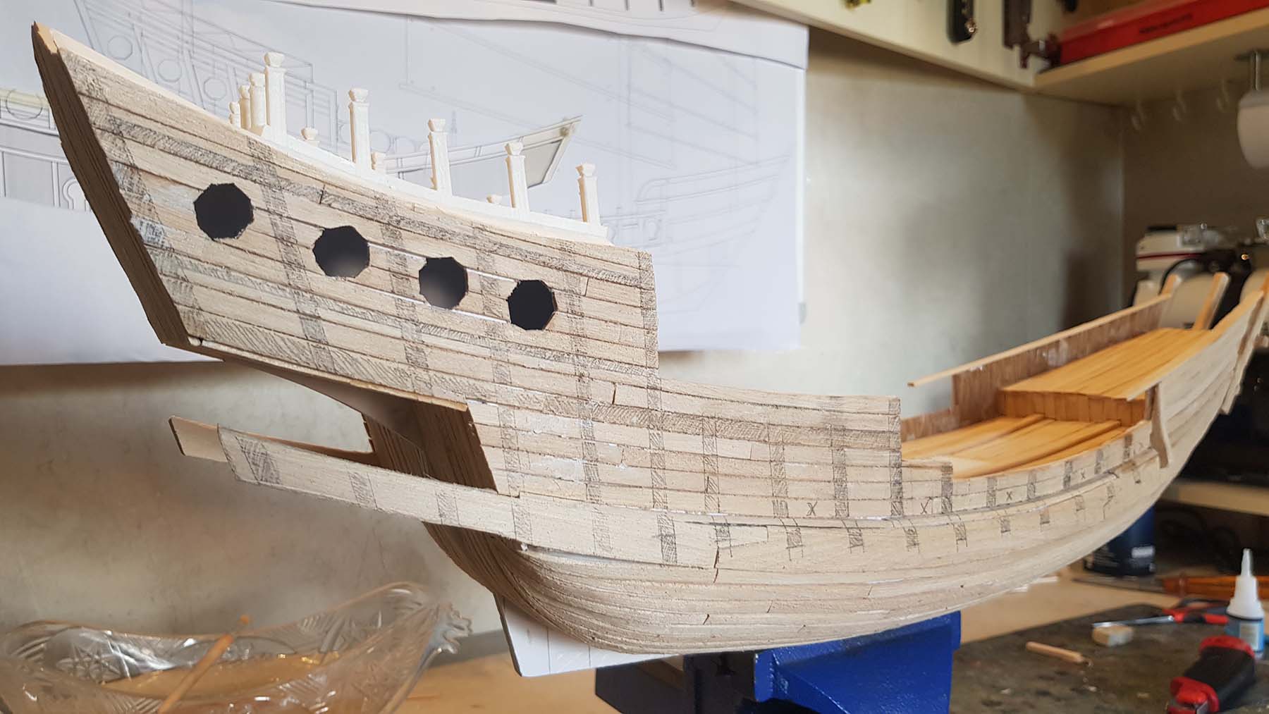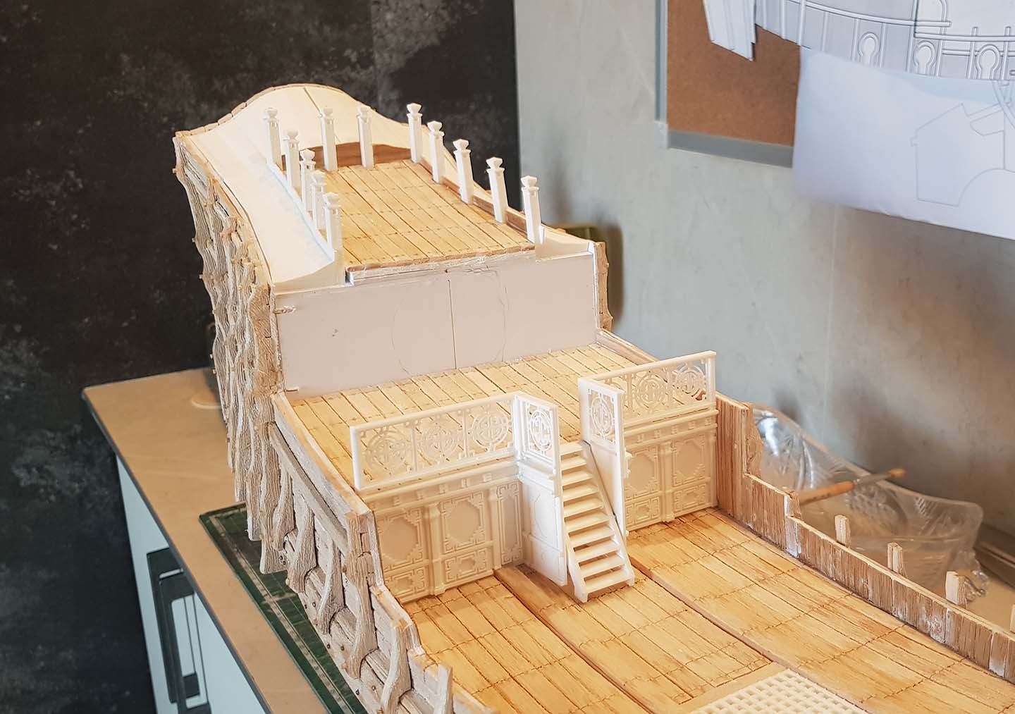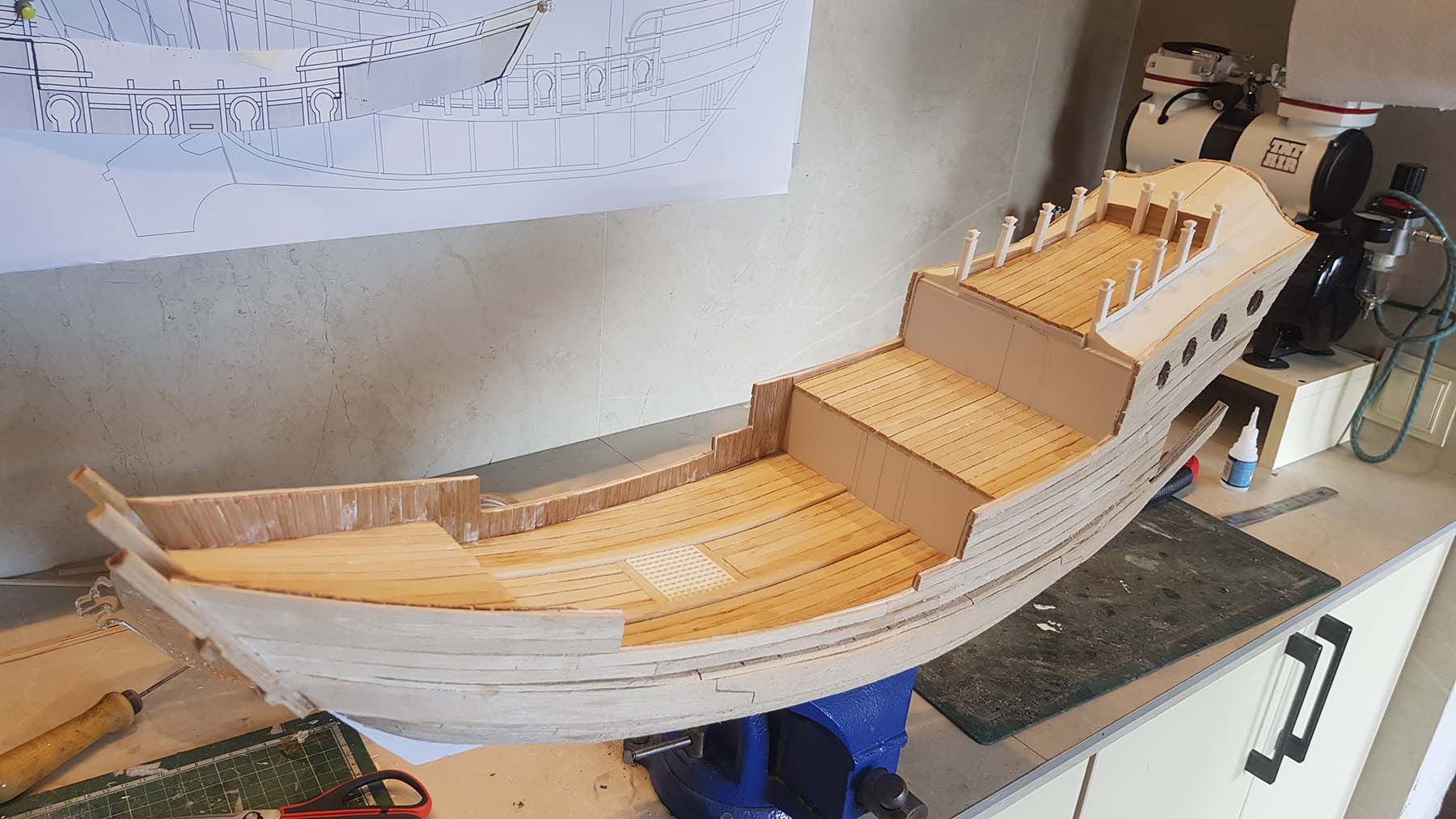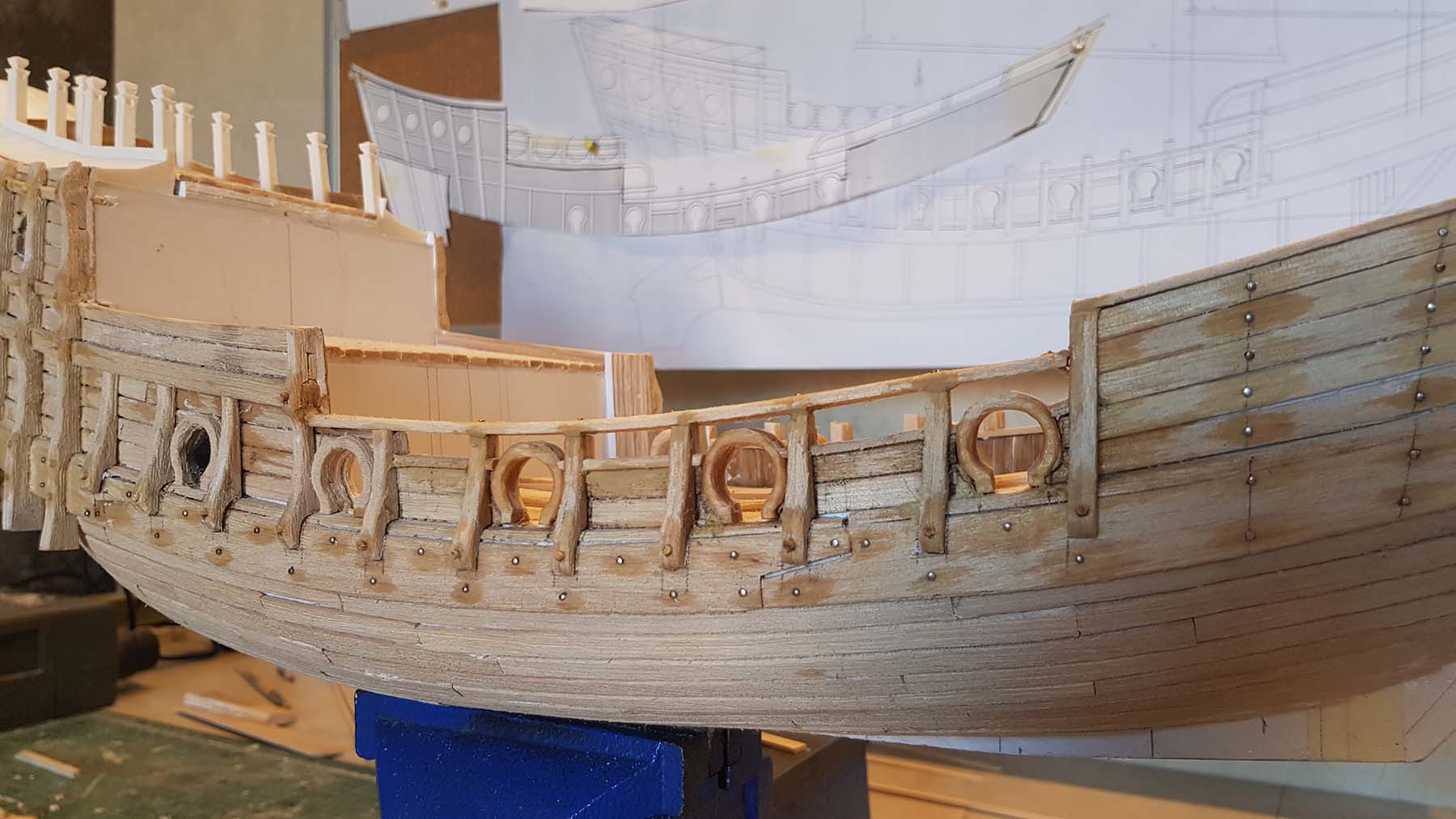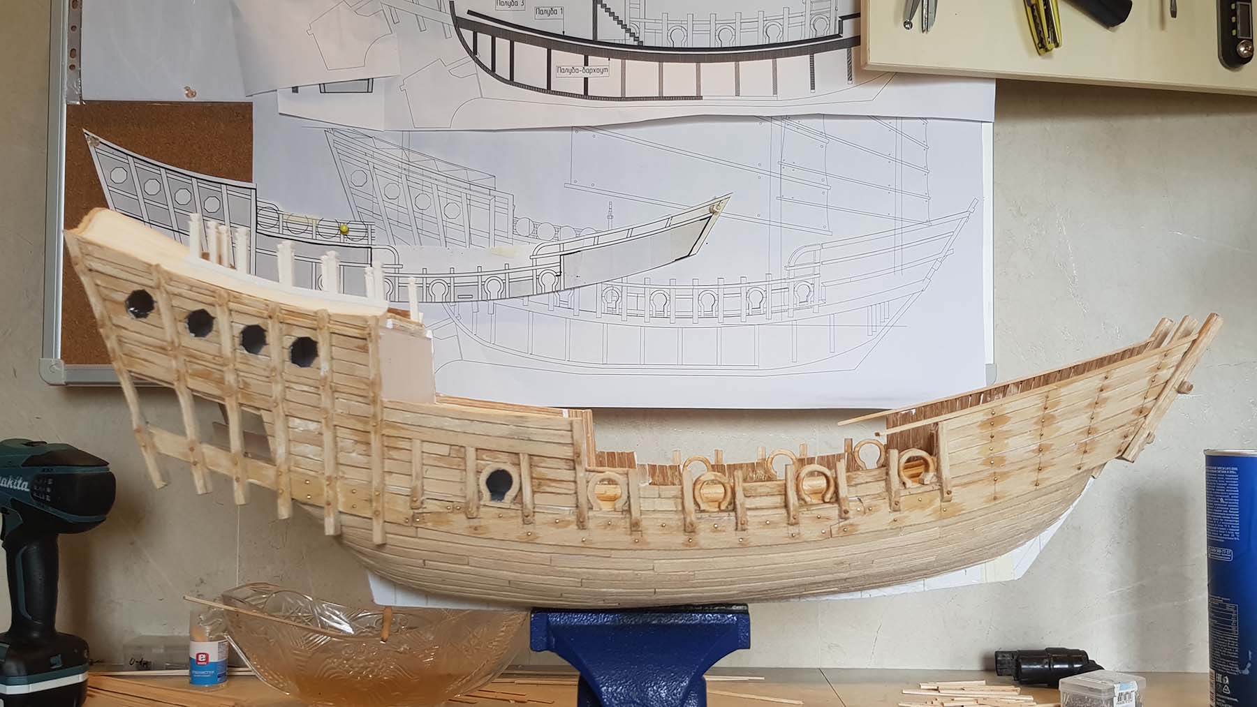 Начал делать верхние планширы. Сначала поставил стойки