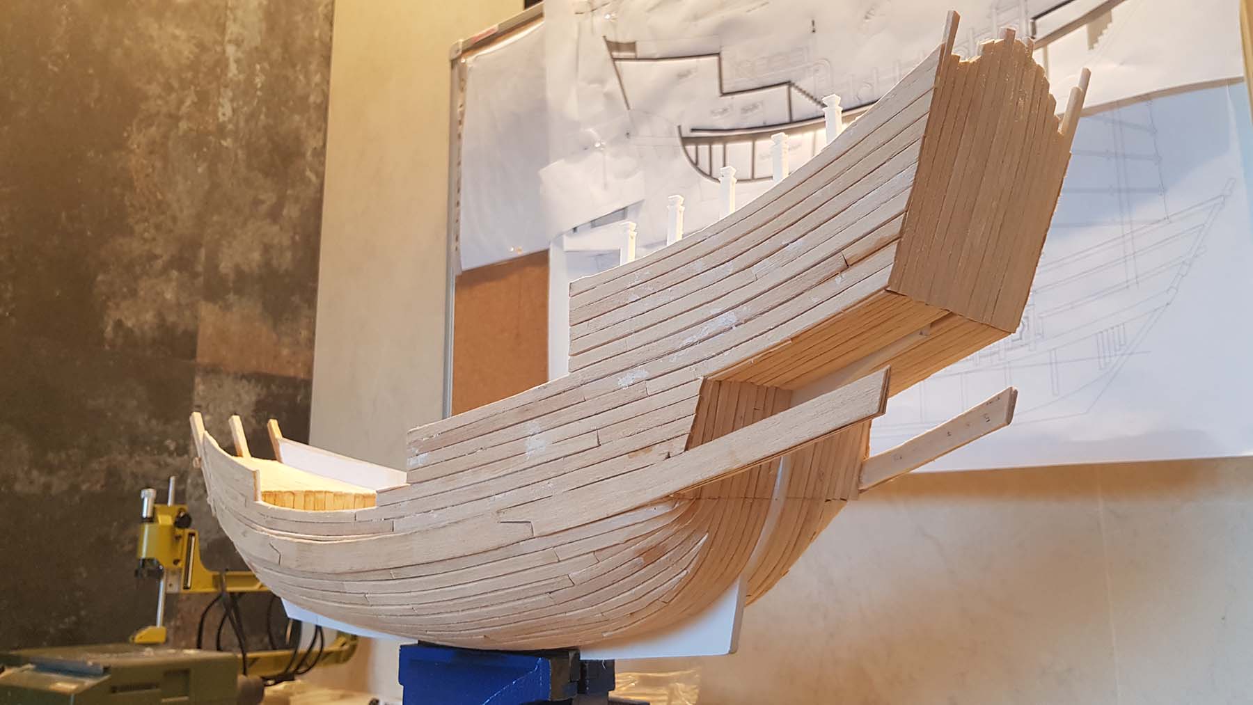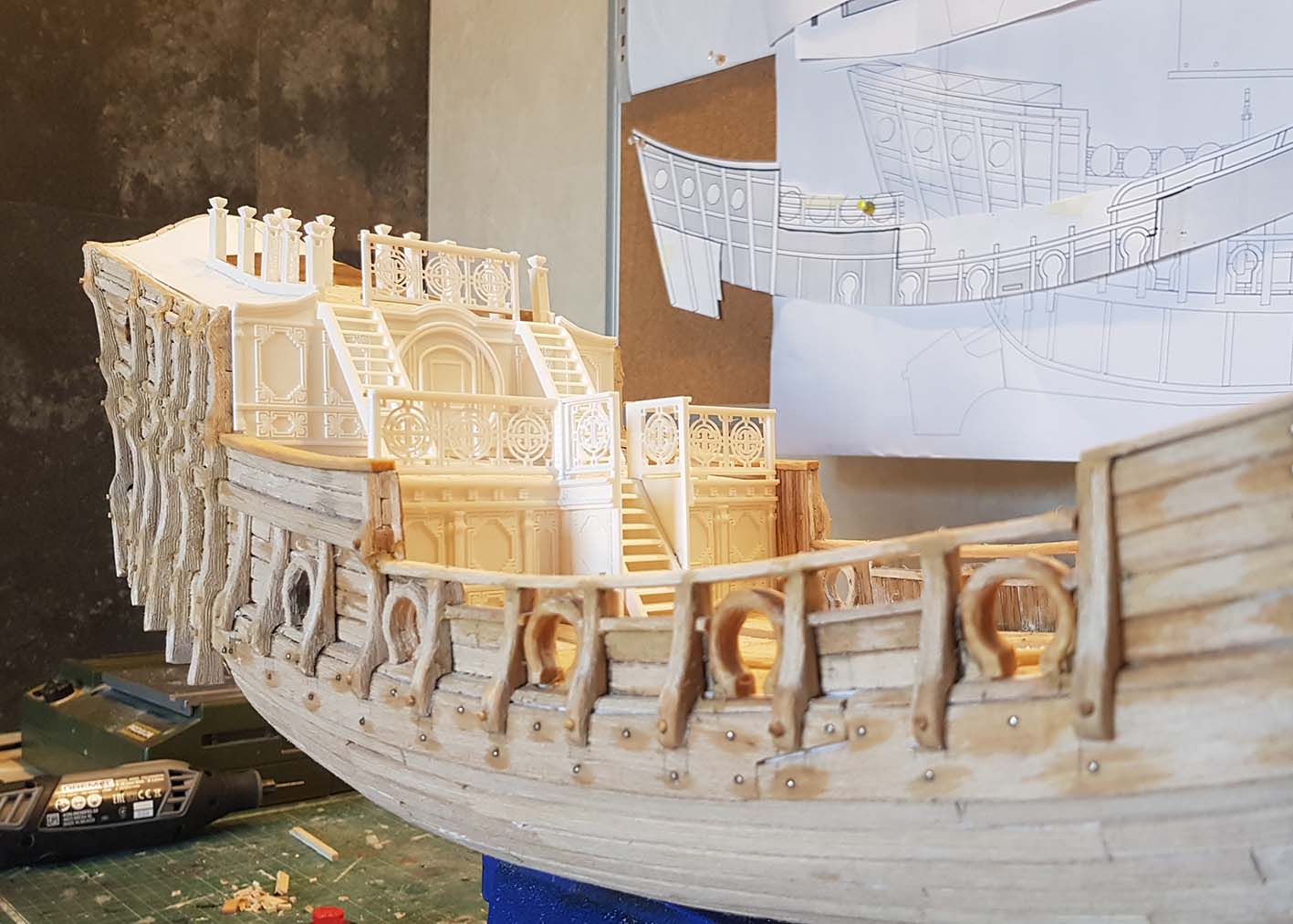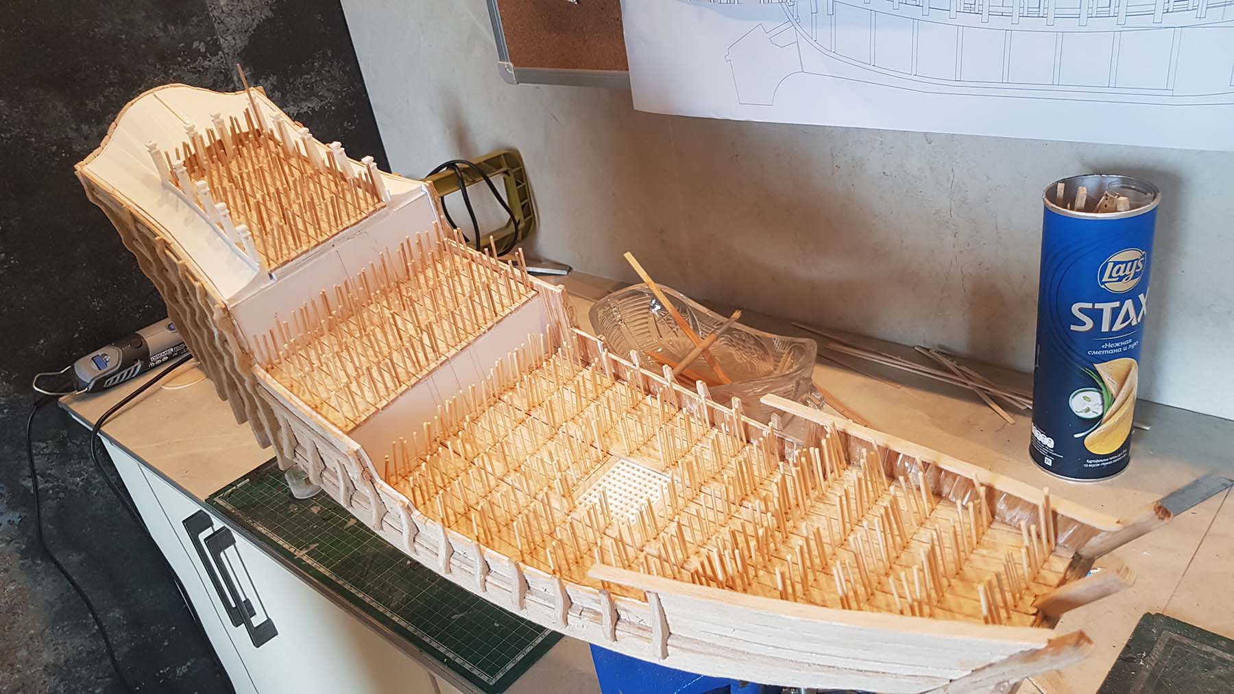 После обшивки прошелся бормашиной по всему корпусу срубив то что выступало и более-менее выровнил корпус. Так как это пиратская посудина, то выглаживать в яичко смысла нет. Чем фактурнее будет дерево, тем интереснее выйдет после тонировки