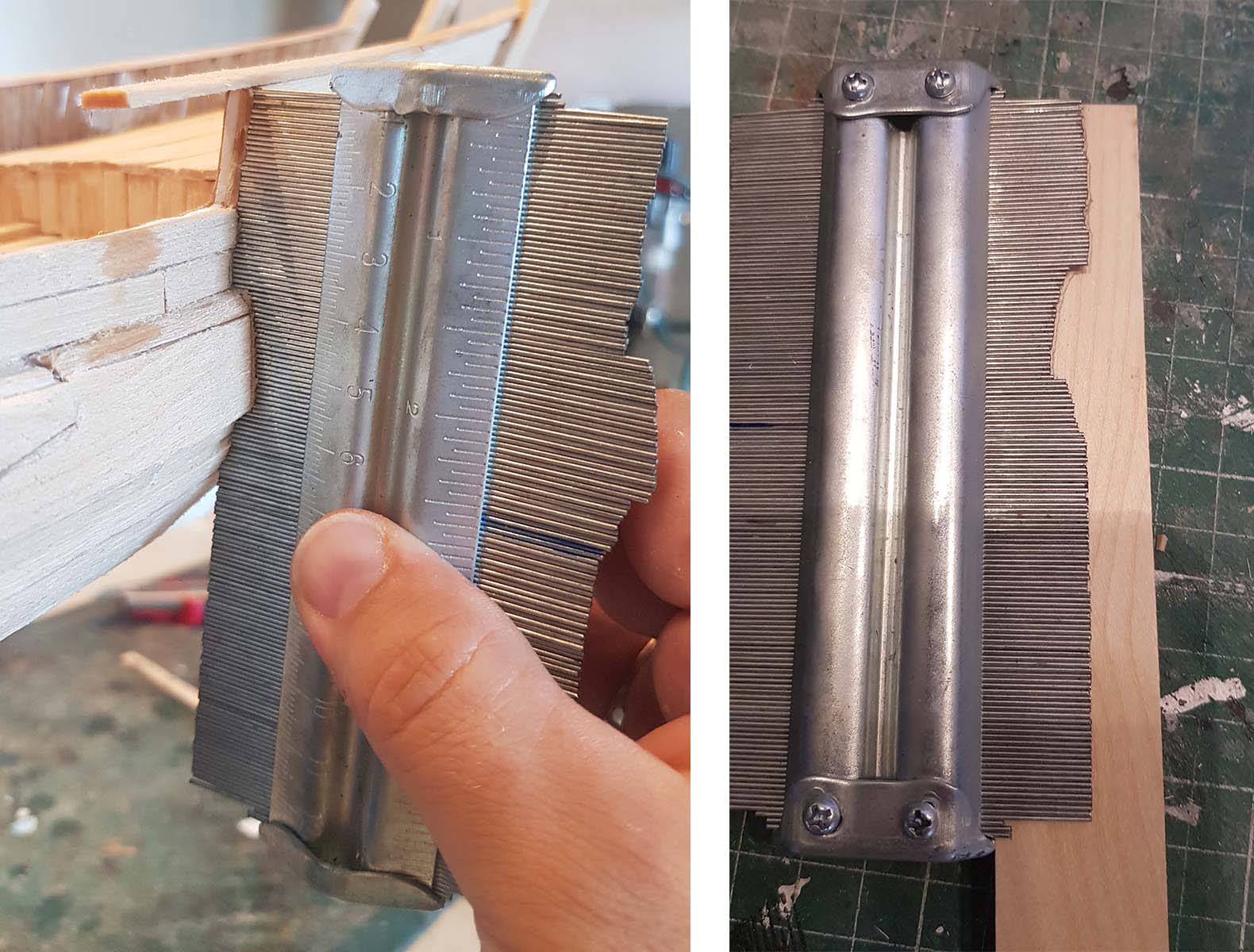 Пришло время делать объемные ребра по корпусу. С помощью такой не хитроой, но очень удобной приблуды можно легко снять профиль борта