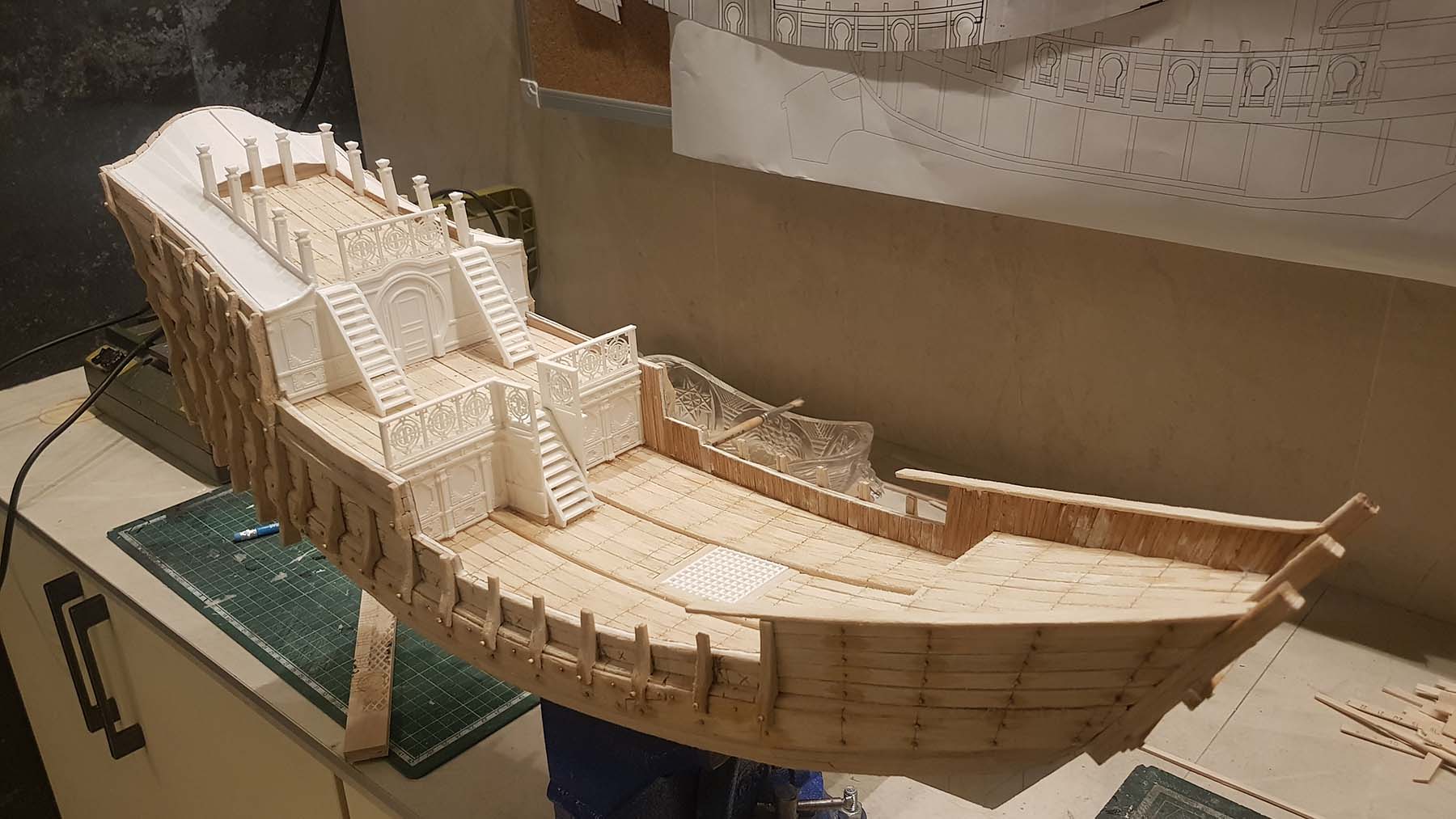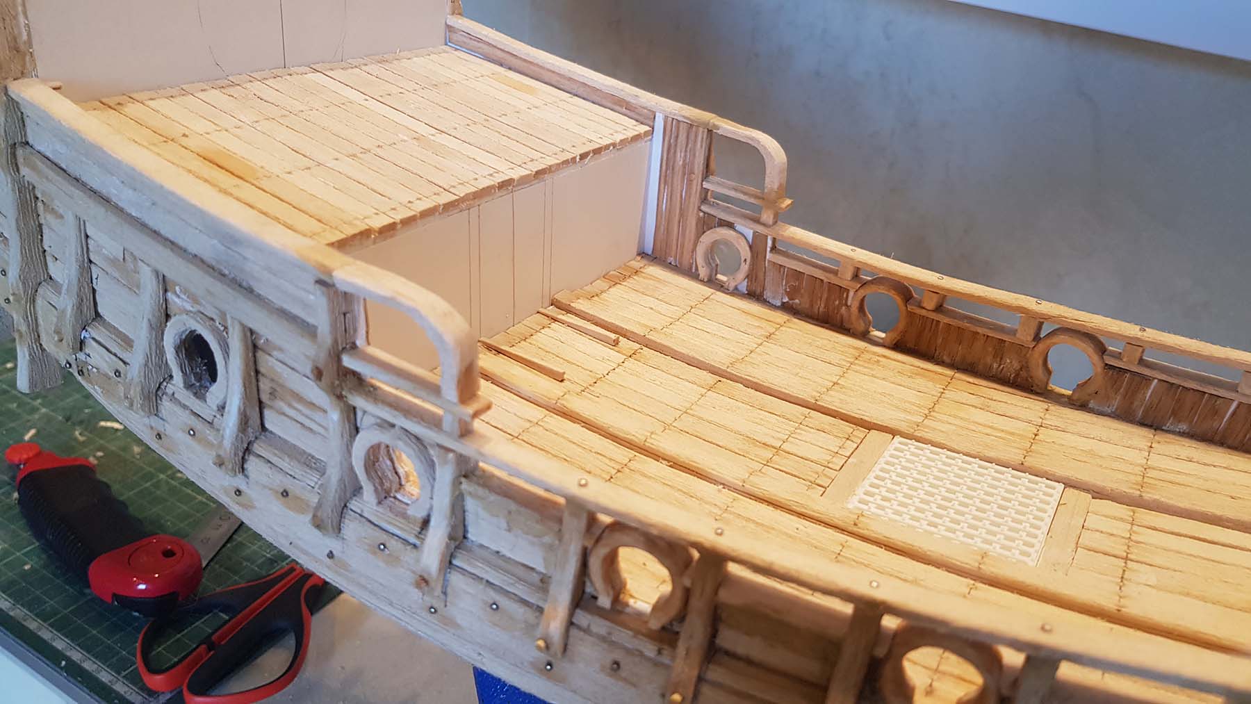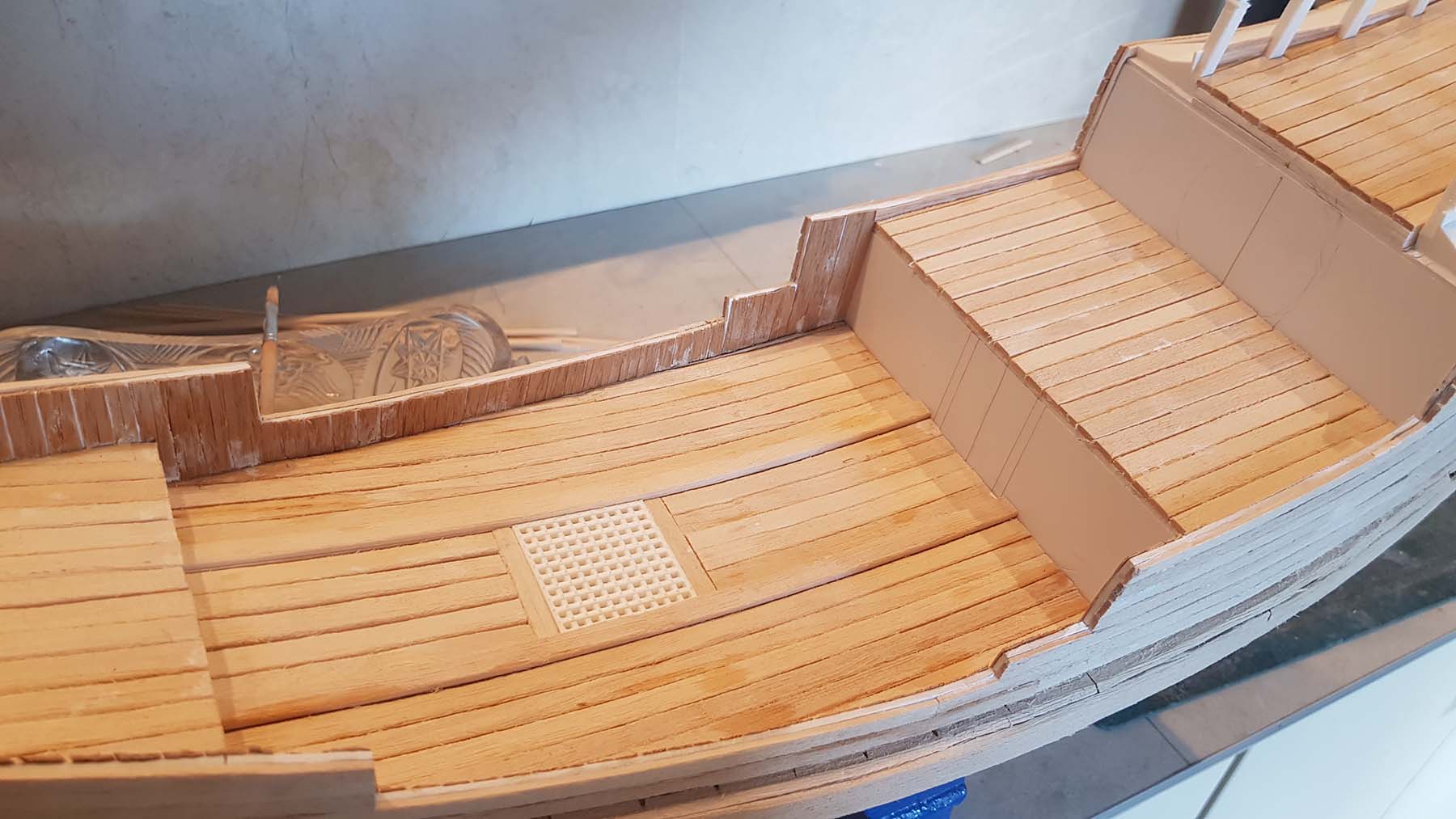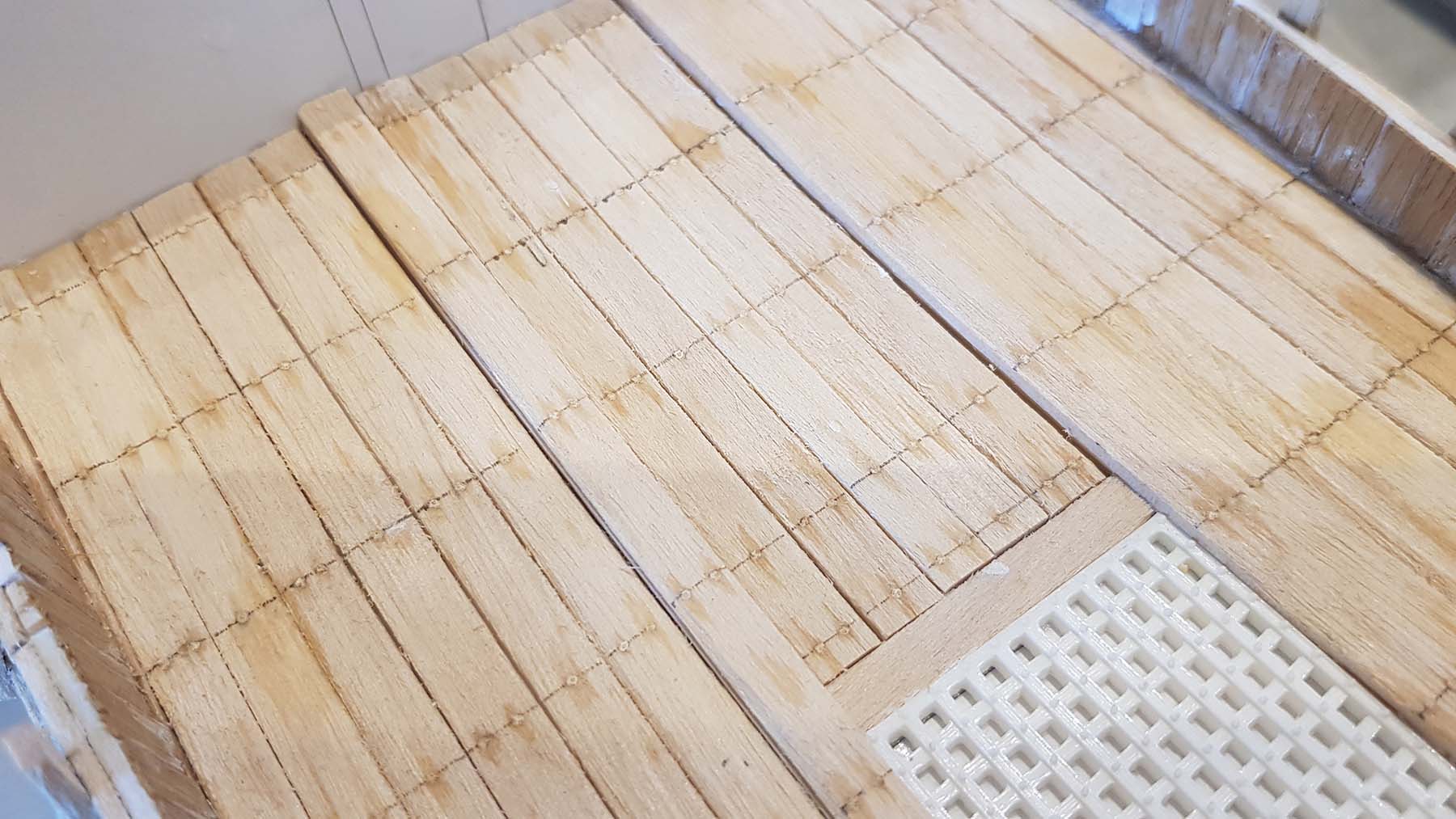 Закончил обшивку палуб, а также, обшил внутреннюю часть фальш бортов шпоном Ясеня 0,6 мм толщиной. Ясень имеет очень мелкую фактуру, что довольно масштабно для моей модели