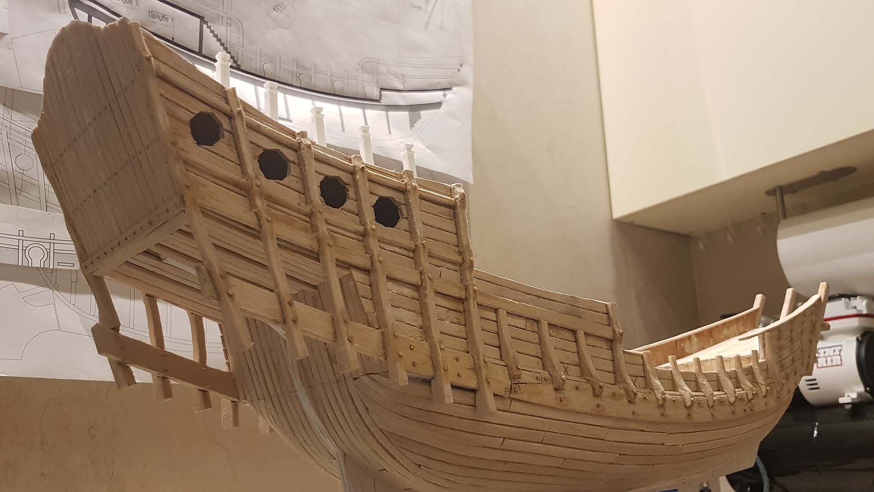 Приступил к оформлению пушечных портов. Из-за того, что обрамление равномерно выступает и снаружи и изнутри бортов, приходится эту подкову делать одним пирогом, вырезать в борту отверстие по размеру подковы и встраивать внутрь, желательно без щелей